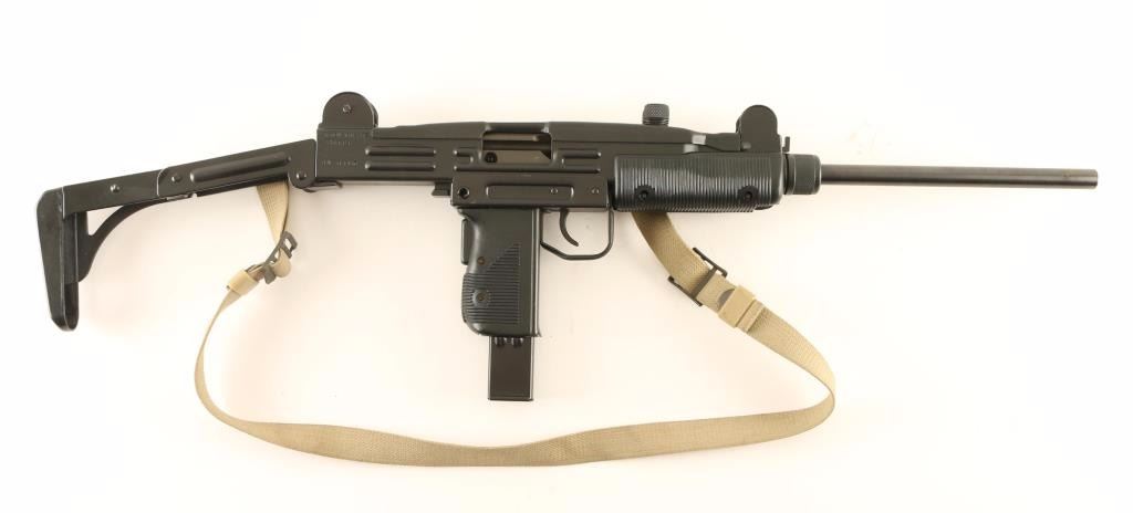 'Pre-ban' Desirable Israeli made semi-automatic carbine chambered in 9x19mm. Imported by Action Arms of Philadelphia, Pennsylvania with import marks on the receiver. Features a matte black finish, 16" non-factory barrel, shrouded fully adjustable post front sight, shrouded dual aperture rear sight, bayonet lug, manual safety, grip safety, large knurled charging handle, 25 round factory magazine, smooth trigger, tan canvas sling, folding metal shoulder stock and grooved black synthetic forend & pistol grip. Rifle exhibits approximately 96% of it's finish intact overall showing light edge wear and few scattered losses on the grip frame. Action is crisp, bore appears excellent with a small protrusion on one off one of the lands and stocks are fine. Condition is near excellent. ***Modern Firearm***