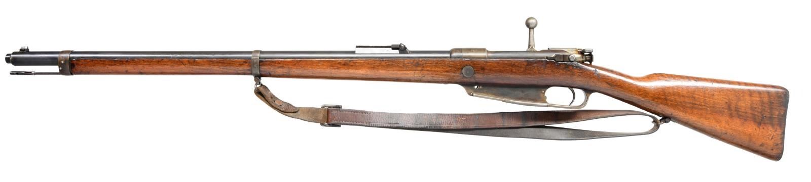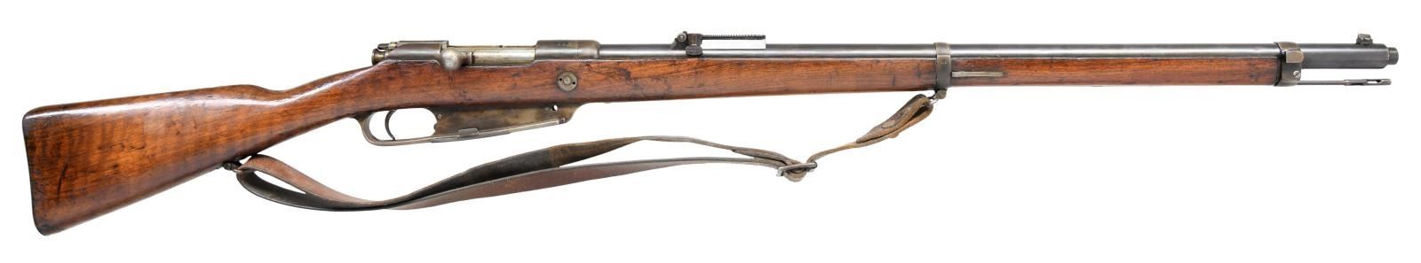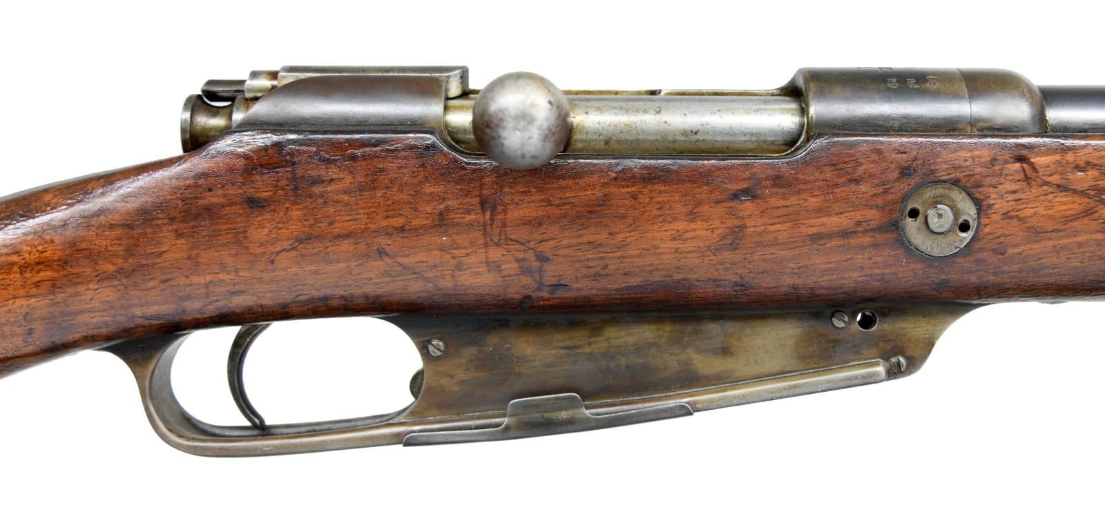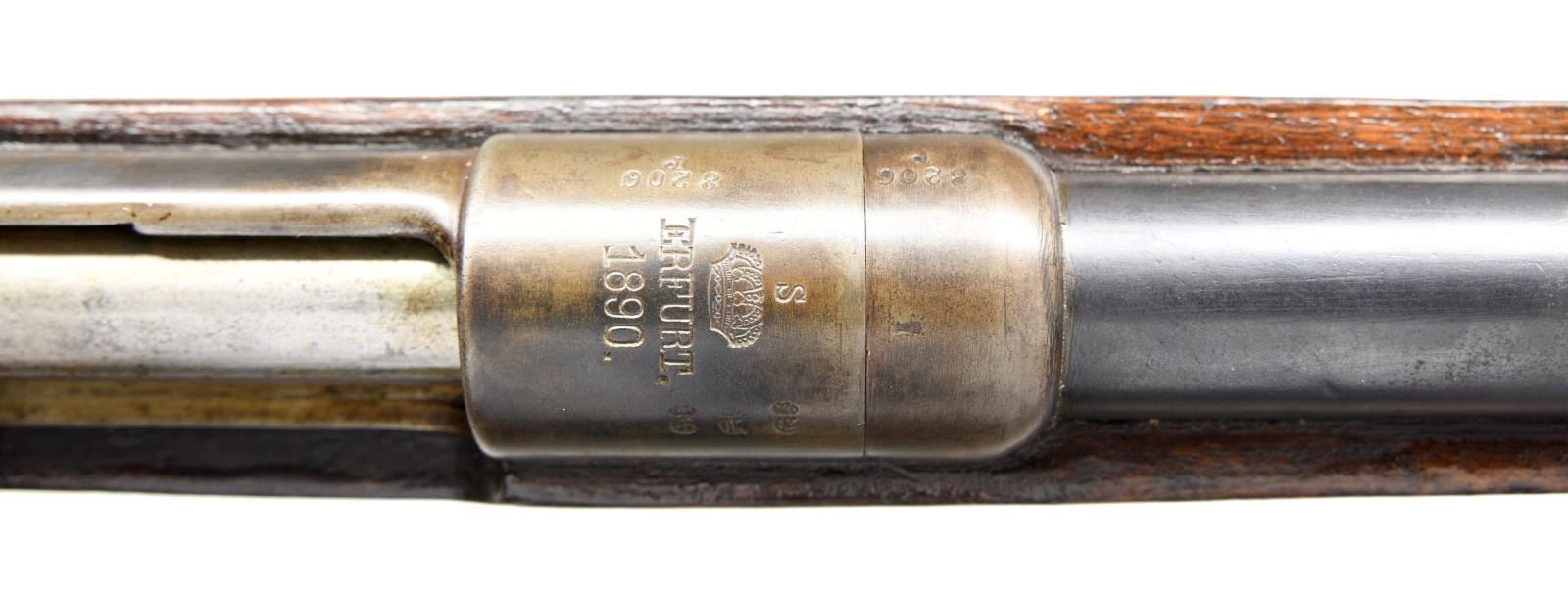 COMMISSION RIFLE. Cal. 8mm Mauser. S# 8206P. S#'s match on receiver, bbl. sleeve, triggerguard, rear sight & bbl. bands. Bbl. 29 1/4". Ladder rear sight graduated to 2050 meters. Inverted V front sight. Receiver ring is marked w/ "S" indicating that the chamber has been reamed to accept the newer "S" cartridge plus "Imperial crown" "ERFURT" & "1890" on top. Left receiver rail marked w/ gothic "GEW.88.". Straight bolt handle. Bolt assembly numbers match on bolt body, cocking piece, bolt sleeve & safety. Bolt head is present & complete w/ extractor & ejector. Trigger guard is equipped w/ sheet metal cover to retain empty clip. Lower band is unit marked. Upper band has bayonet lug. Cleaning rod is present. Walnut stock is unmarked. Flat buttplate. Period 1" leather sling equipped w/ roller buckle is unmarked. MAGS: none. CONDITION: stock set has arsenal rework finish which has rendered stock markings illegible. Finish has thinning wear & handling marks throughout. Metal has thinning arsenal rework finish w/ wear & handling marks. Bore turning slightly dark in grooves w/ slightly worn lands. (01-23577/RW). ANTIQUE. $700-900.