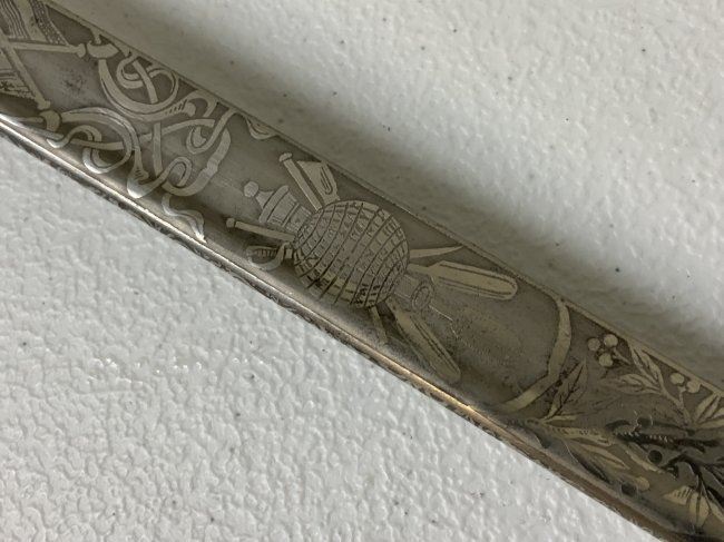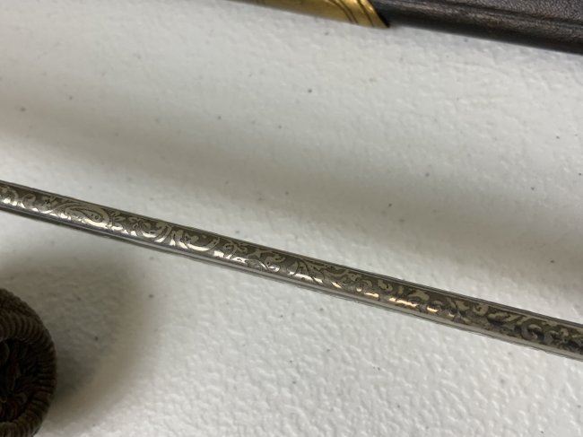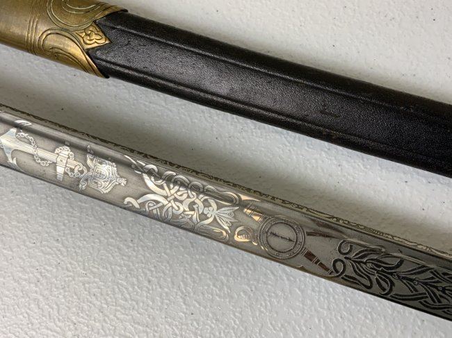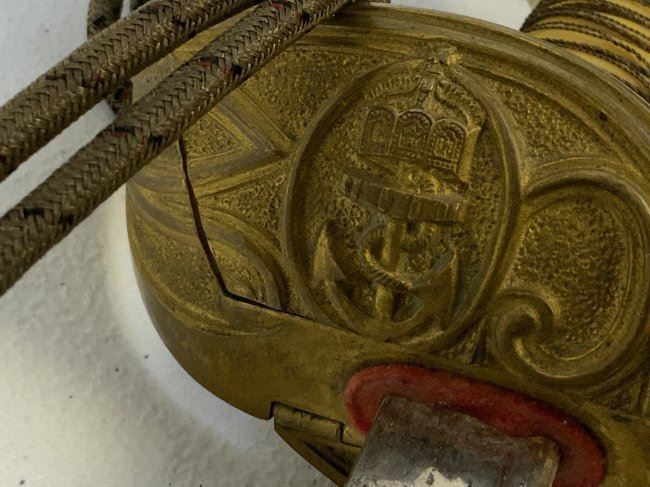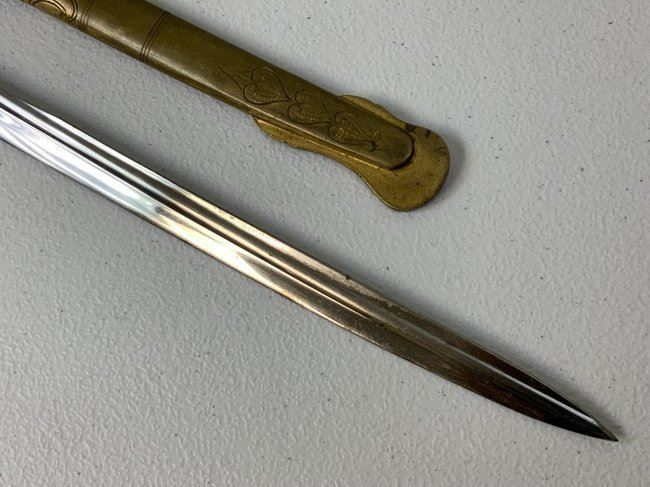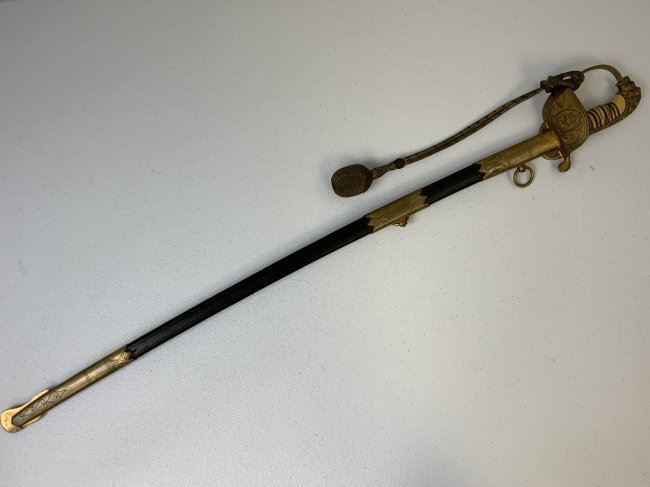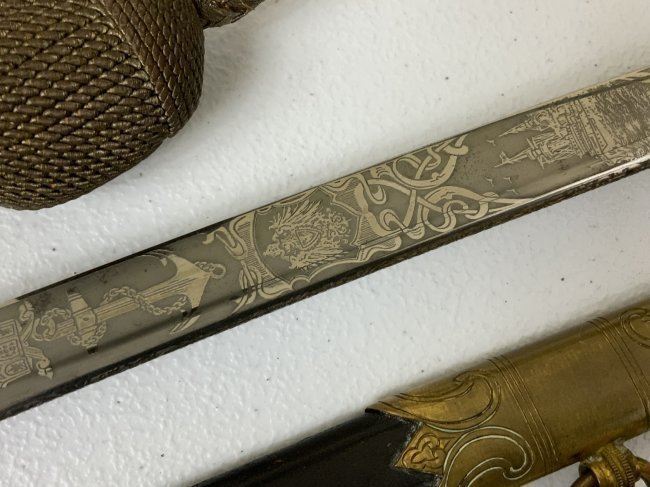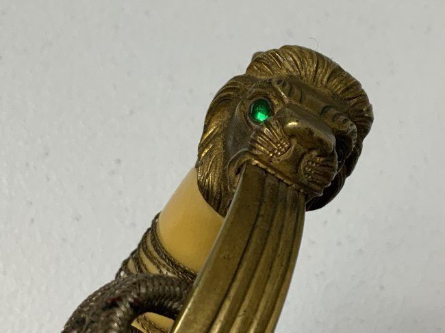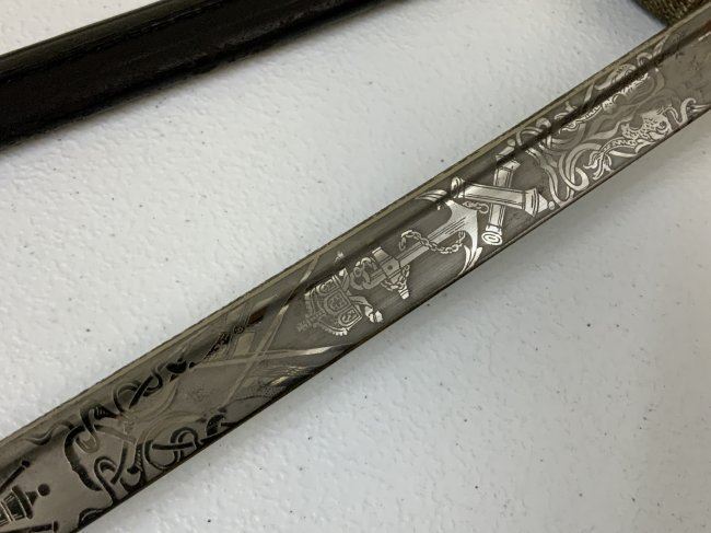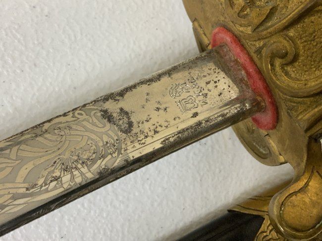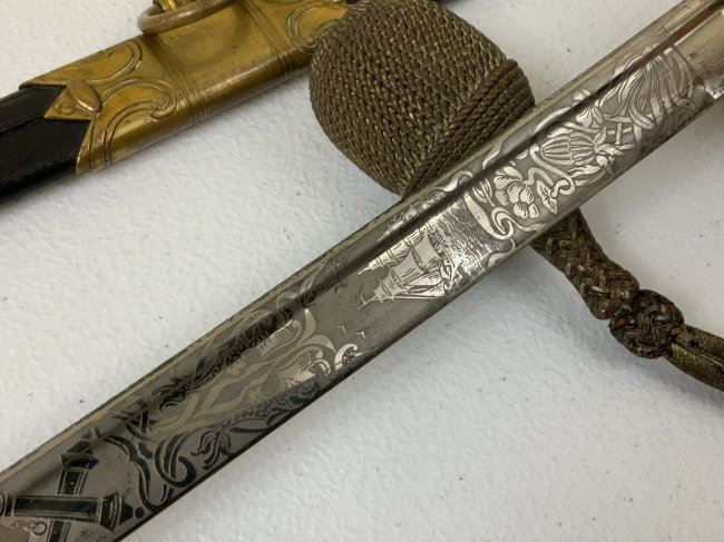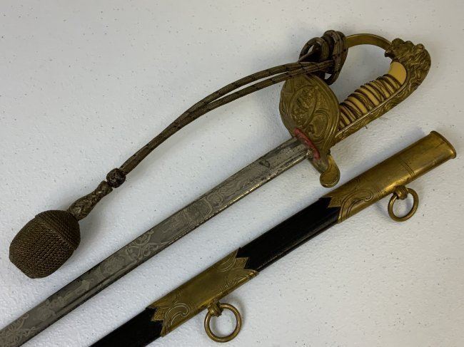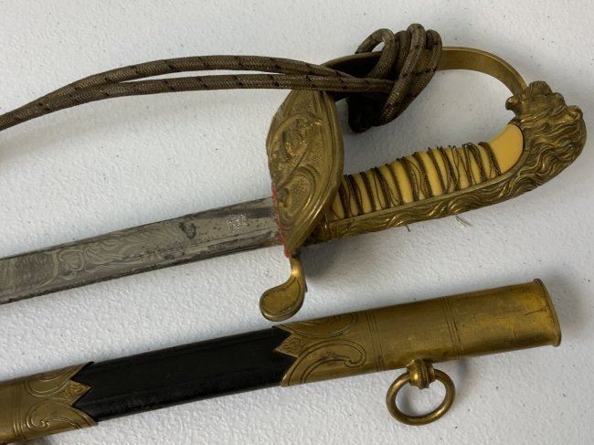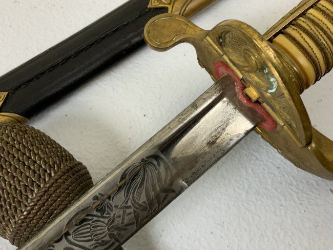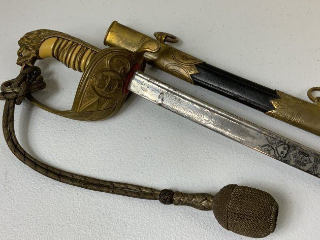 IMPERIAL GERMAN NAVY OFFICERS DRESS SWORD TRIPLE ETCHED BLADE BY WKC. VERY NICE EXAMPLE WITH BEAUTIFUL ETCHED BLADE . MADE BY WKC . BLADE IS NEAR MINT WITH NICE ETCHINGS. BRASS FOLDING CROSS GUARD. GREEN AND RED EYES INSERTED IN THE LION HEAD POMMEL . COMES WITH ORIGINAL SWORD KNOT AND A SCABBARD , WHICH IS IN GREAT SHAPE .GRIP WIRE IS SOMEWHAT LOOSE. VERY NICE SWORD OVERALL AND QUITE RARE TO FIND IN THIS NICE CONDITION.