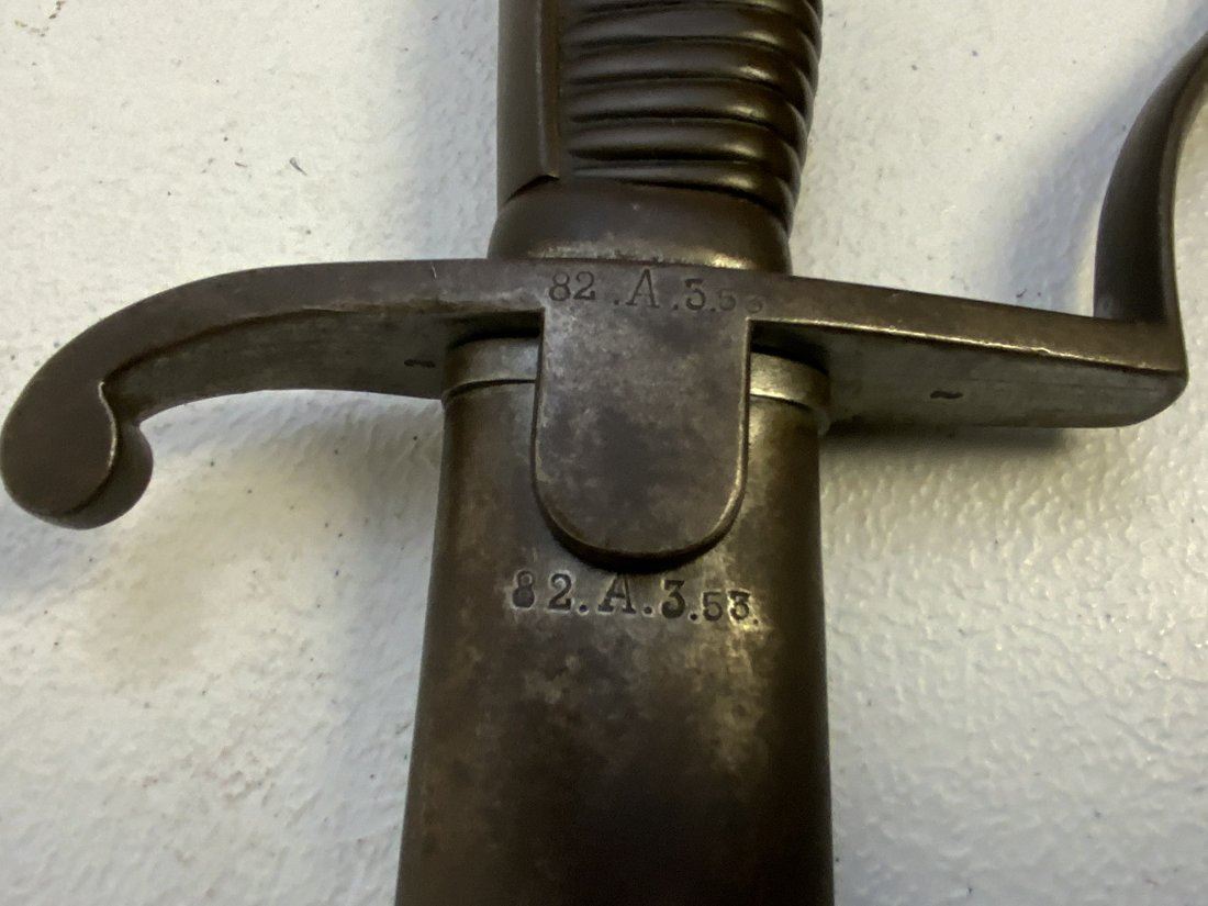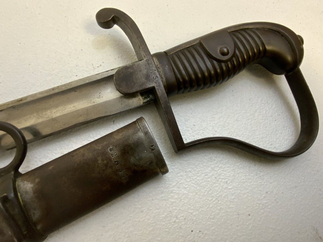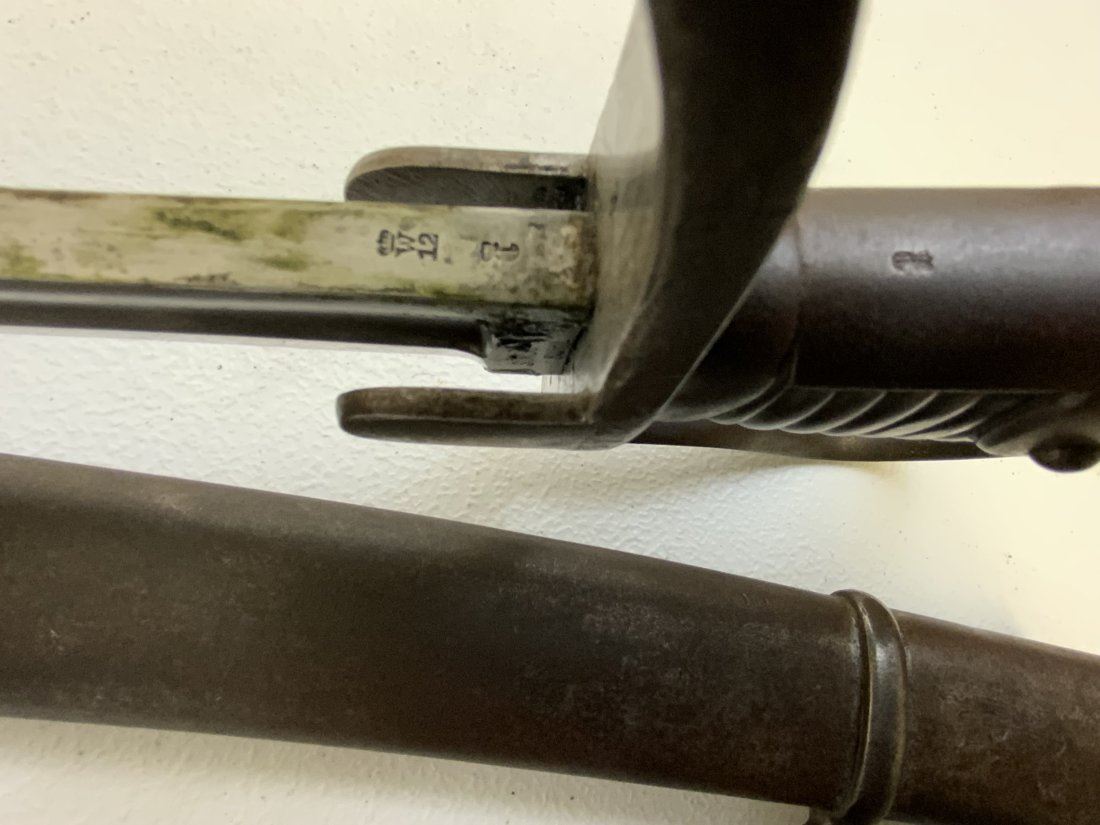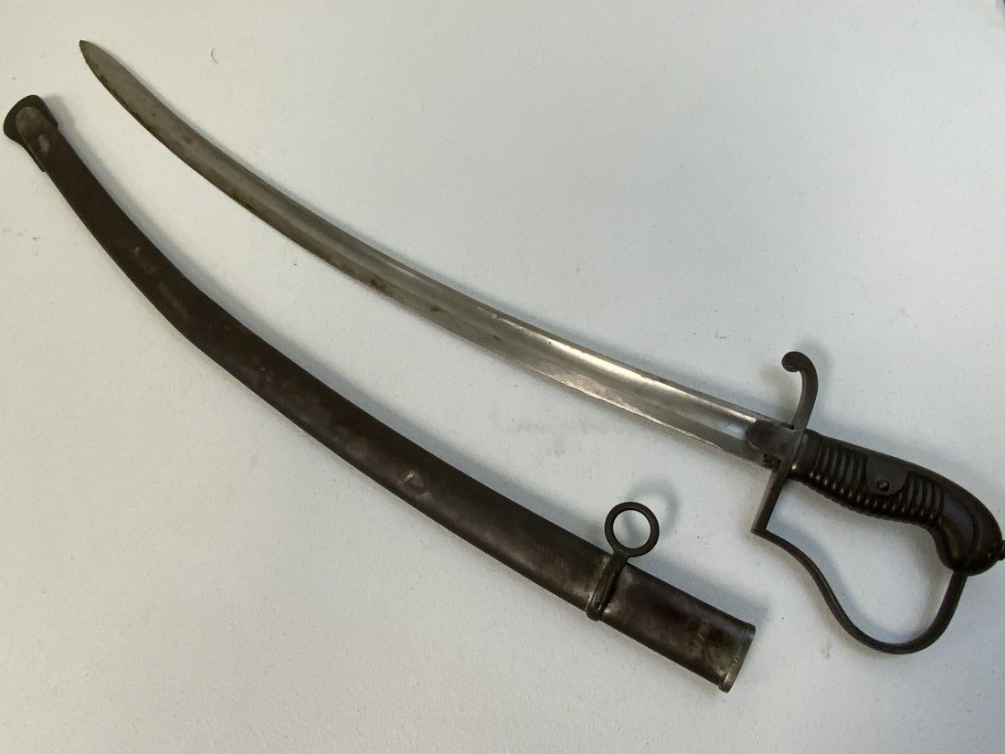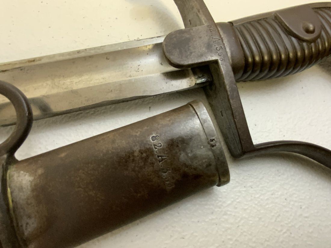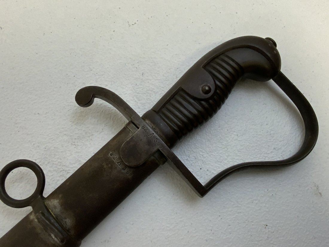 IMPERIAL GERMANY 1873 ARTILLERY SWORD REGIMENTAL STAMPED . GREAT CONDITION FOR ITS AGE . MATCHING REGIMENTAL STAMPING ON THE SWORD AND SCABBARD . 1912 DATE ON THE SPINE. GREAT EXAMPLE .