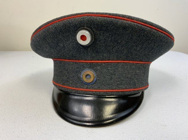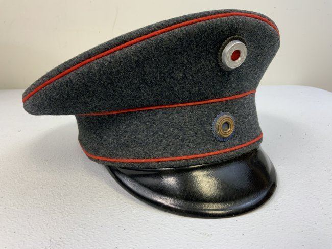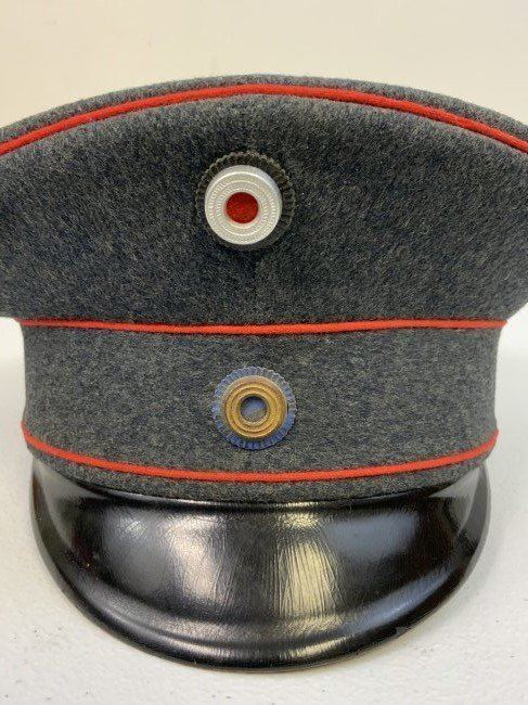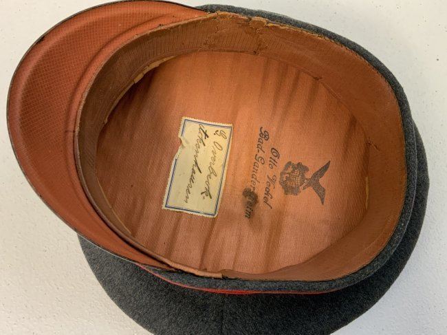 IMPERIAL GERMAN BAVARIAN OFFICERS VISOR CAP HAT . EARLY 20th CENTURY CLASSIC PRE WWI MODEL . RARE GREAY WOOL EXAMPLE. COMPLETE WITH BOTH COCKADES. VERY GOOD CONDITION OVERALL . NICE MAKER MARK INSIDE AND LABEL WITH NAME G. OVERBECK . VERY NICE RARE EXAMPLE.
