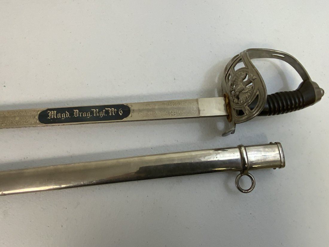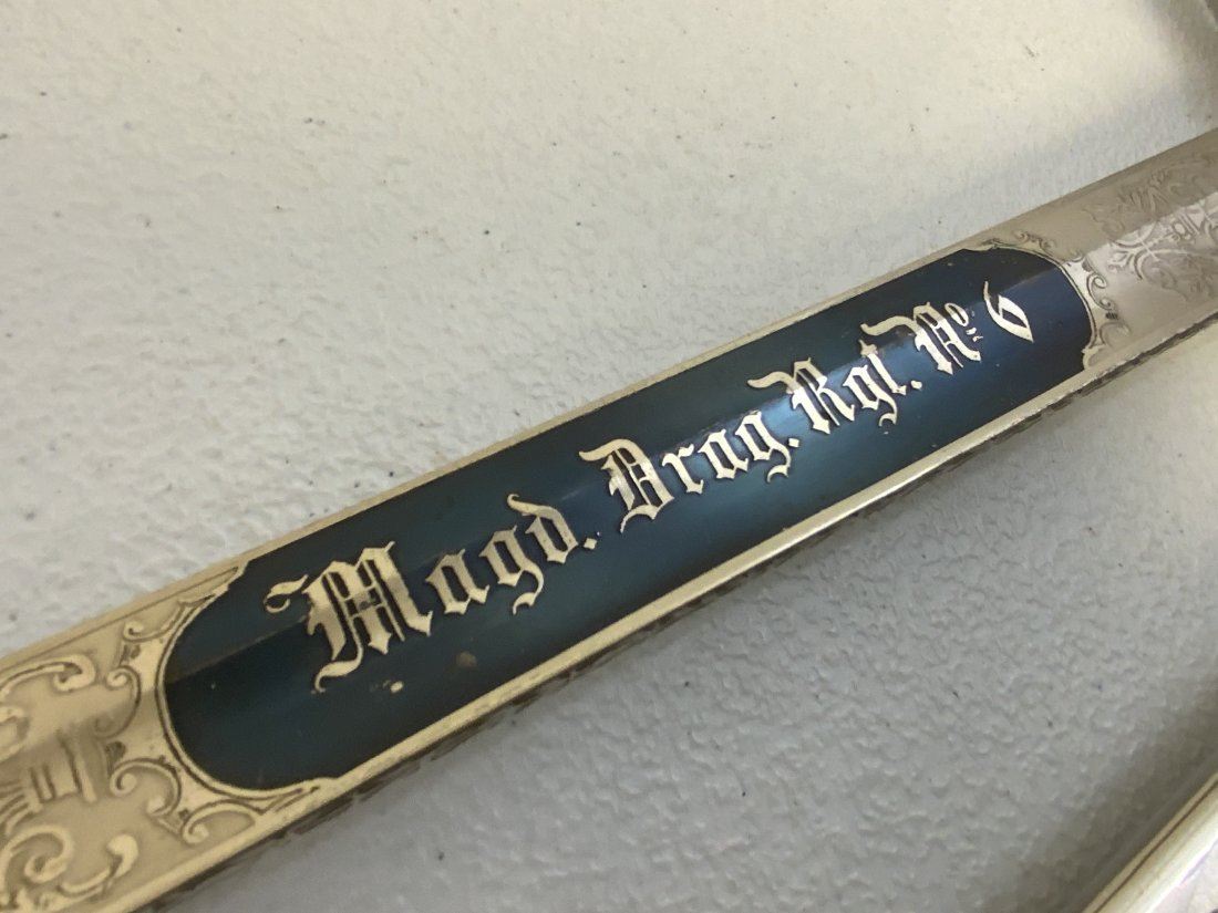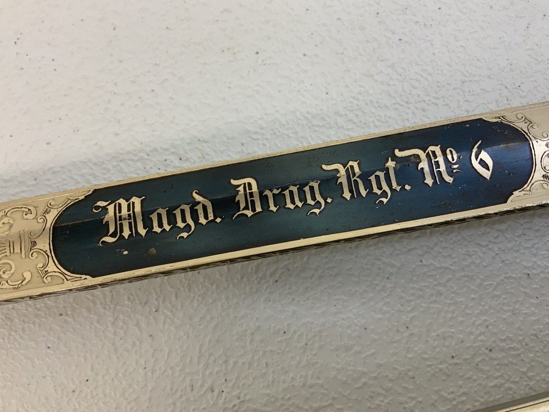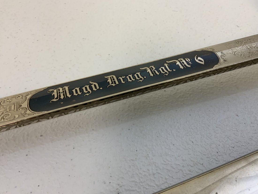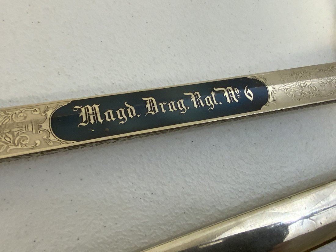 IMPERIAL GERMANY PRUSSIAN CAVALRY OFFICER SWORD ETCHED DRAGOON REGIMENT N6. MINT CONDITION . BEAUTIFUL ETCHED AND BLUED BLADE .