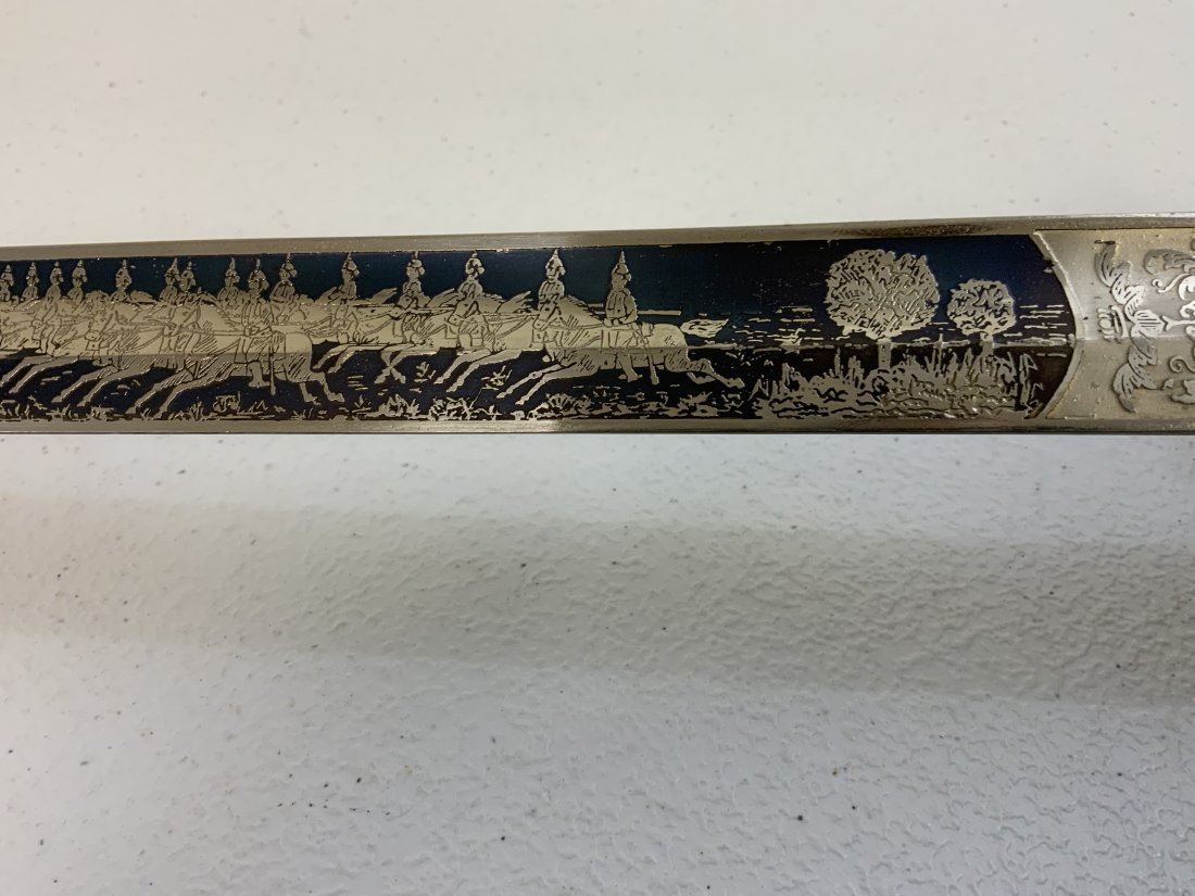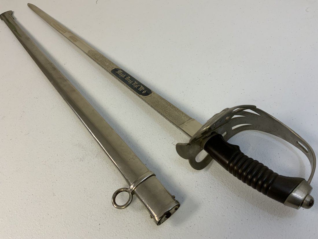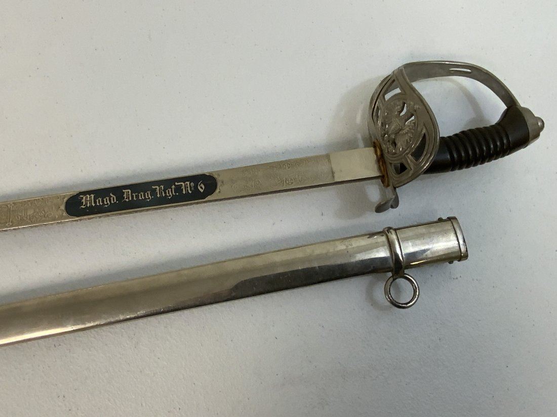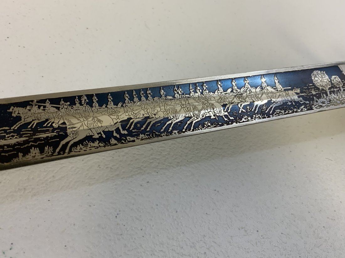 IMPERIAL GERMANY PRUSSIAN CAVALRY OFFICER SWORD ETCHED DRAGOON REGIMENT N6. MINT CONDITION . BEAUTIFUL ETCHED AND BLUED BLADE .