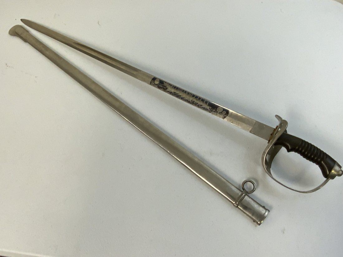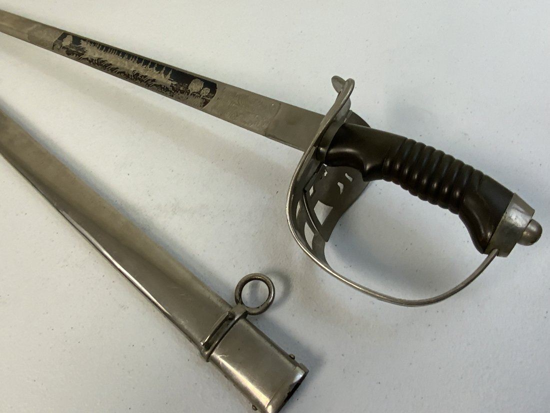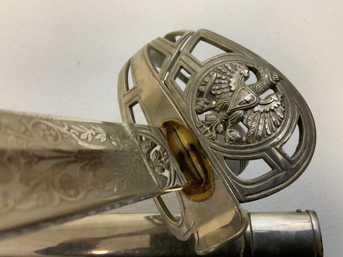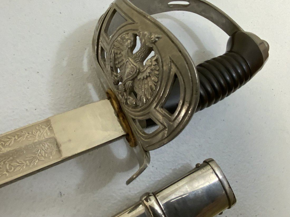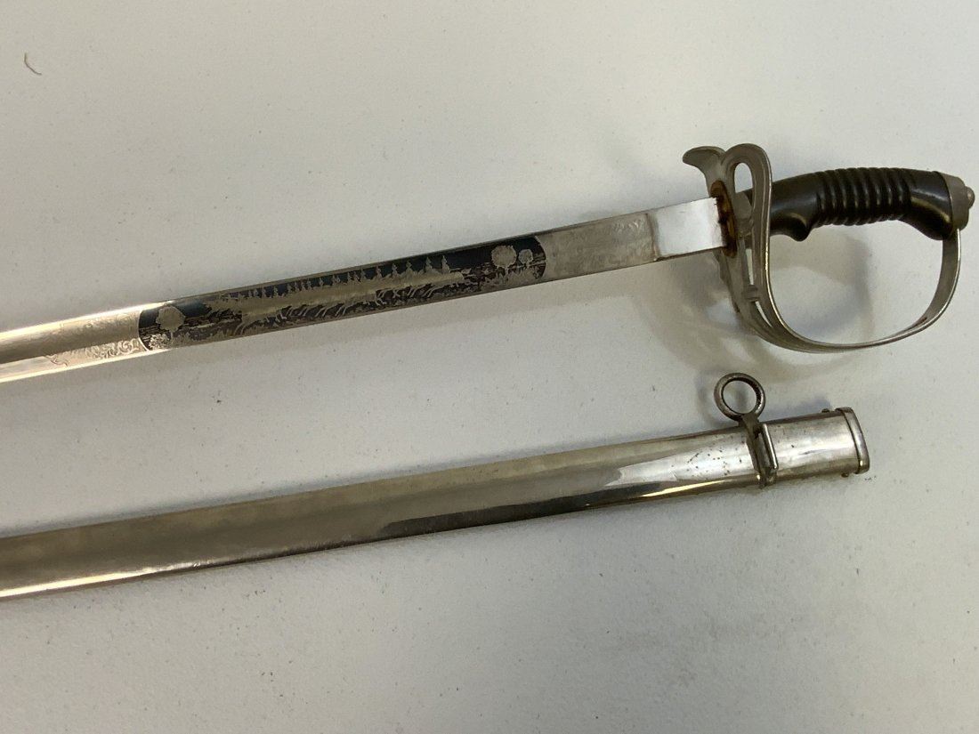 IMPERIAL GERMANY PRUSSIAN CAVALRY OFFICER SWORD ETCHED DRAGOON REGIMENT N6. MINT CONDITION . BEAUTIFUL ETCHED AND BLUED BLADE .