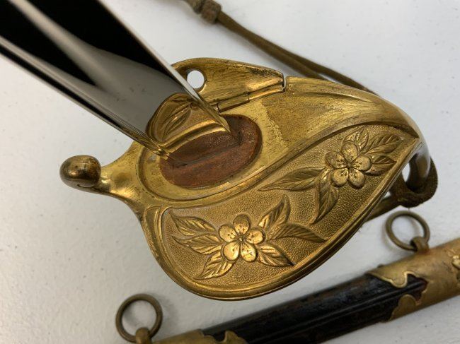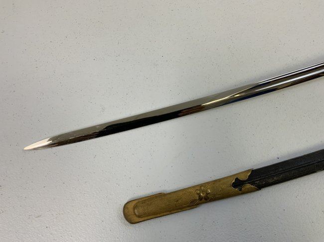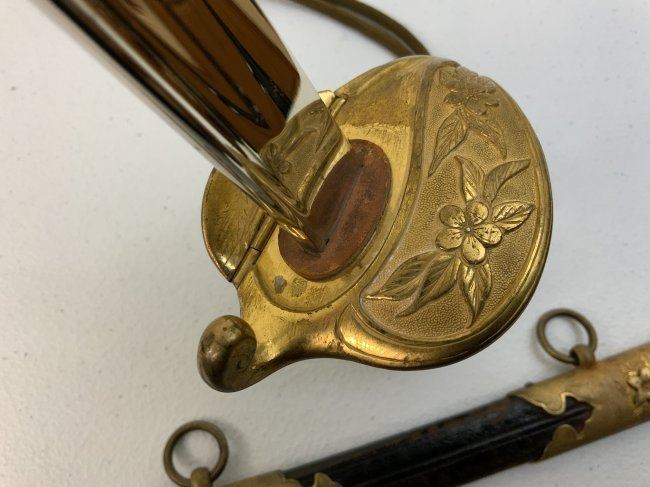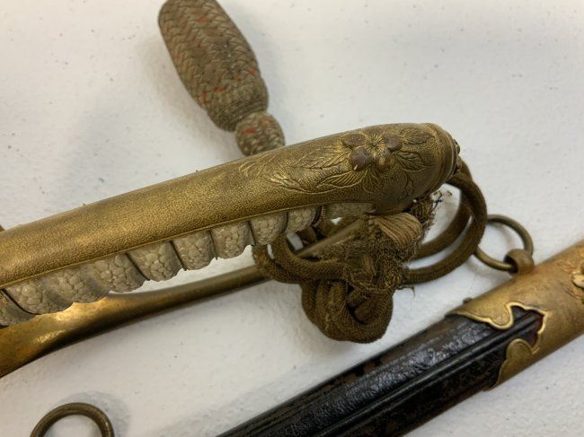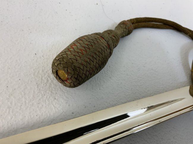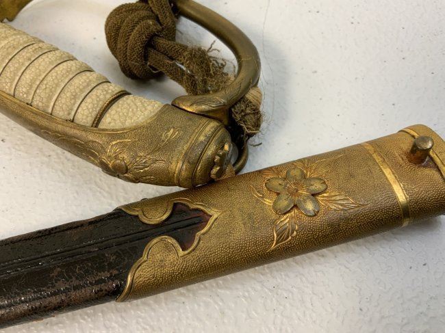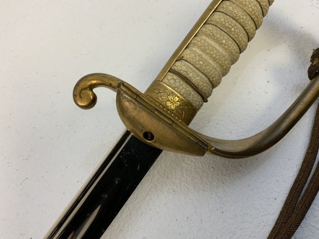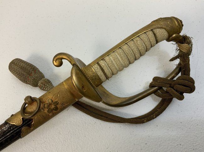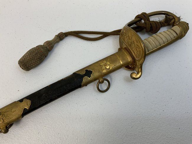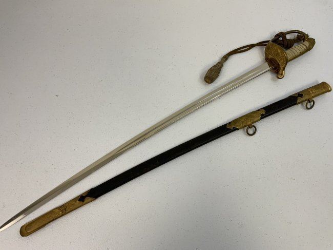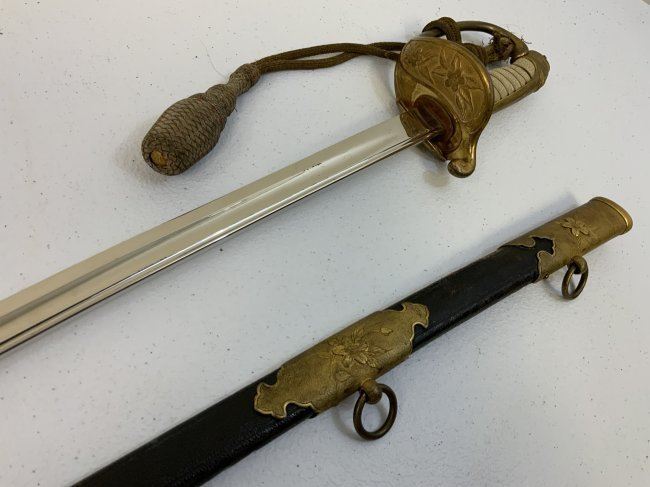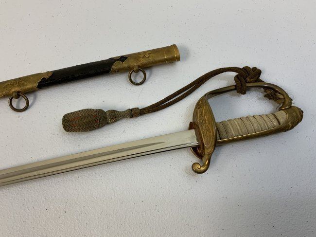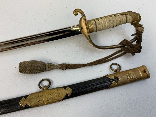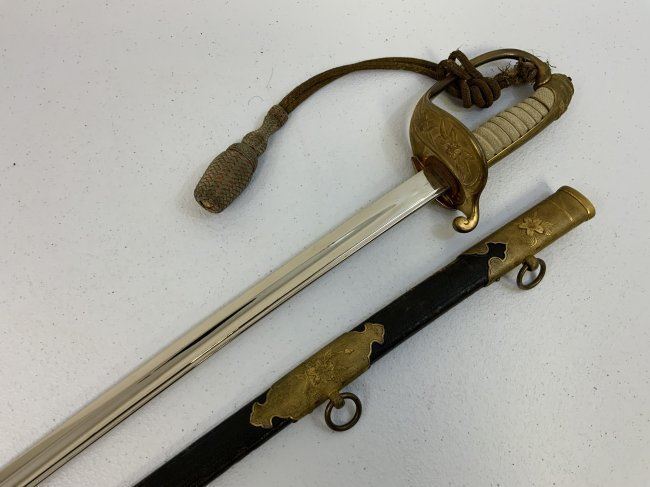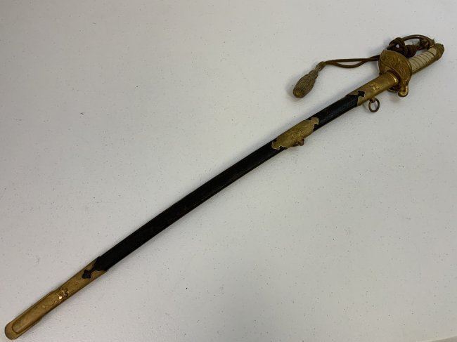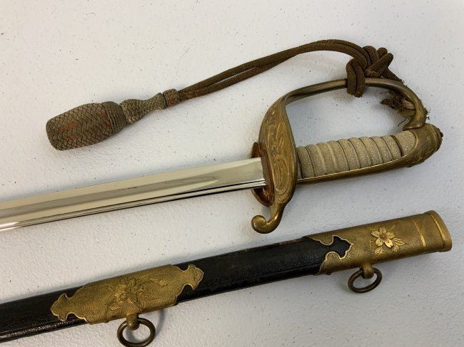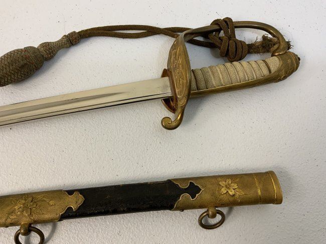 IMPERIAL JAPAN WWII MODEL 1883 JAPANESE NAVY OFFICER DRESS SWORD. GREAT CONDITION WITH BRIGHT NICKEL PLATED BLADE. GILDED BRASS FITTINGS AND ORIGINAL SWORD KNOT . 32" LONG WITH 26" BLADE .