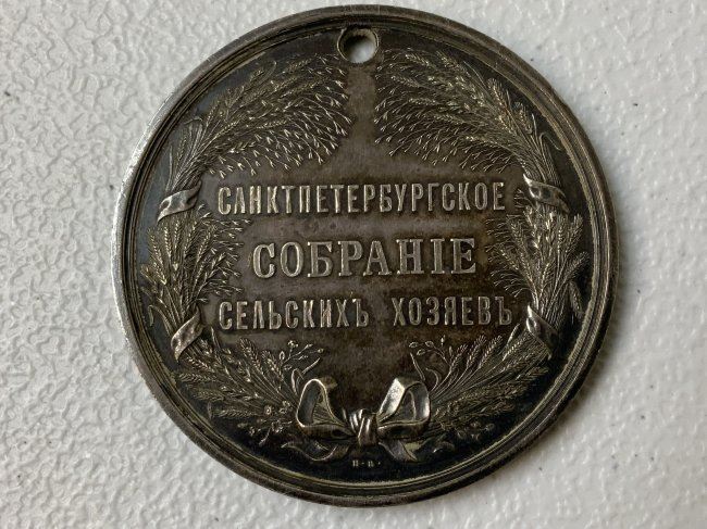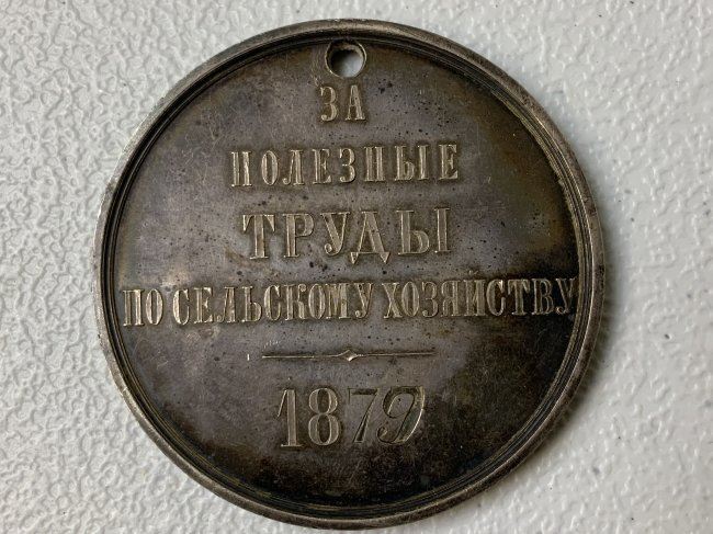 IMPERIAL RUSSIA 1879 AGRICULTURE AWARD PRIZE SILVER MEDAL. . HOLED. APPARENTLY TO BE WORN ON A SELF MADE LOOP . HEAVY . LARGE SIZE 2 1/2 DIAM.