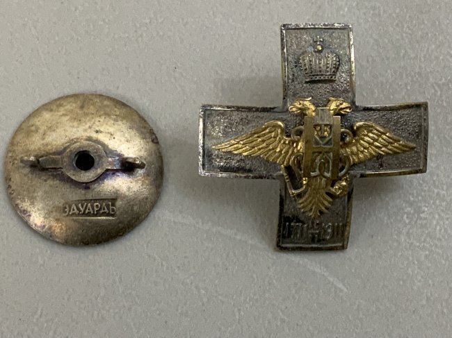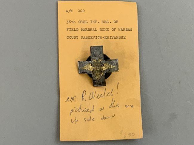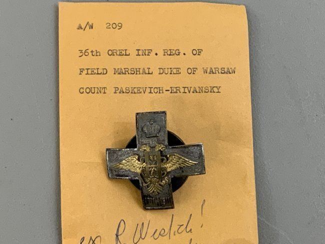 IMPERIAL RUSSIA 36th OREL INFANTRY REGIMENT OF FIELD MARSHAL DUKE OF WARSAW COUNT PASKEVICH - EVIVANSKY BADGE . SCREW BACK . FROM ROBERT WERLICH COLLECTION . COMES WITH ORIGINAL ENVELOPE FROM WERLICH'S COLLECTION AND FEATURED IN HIS BOOK .THE CYPHER IN THE MIDDLE OF THE BADGE IS ATTACHED UP SIDE DOWN AS PICTURED IN THE BOOK . RARE EX ROBERT WERLICH TEXBOOK EXAMPLE.