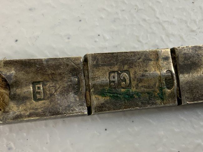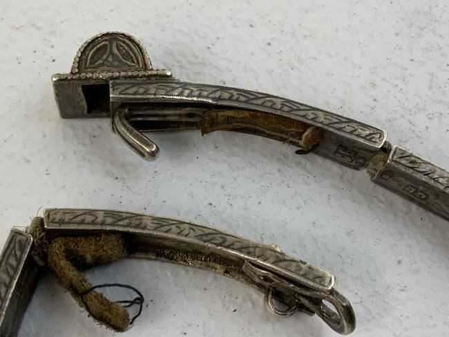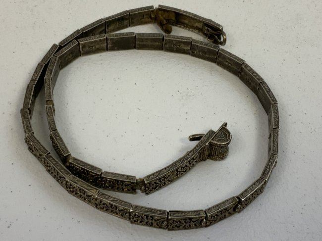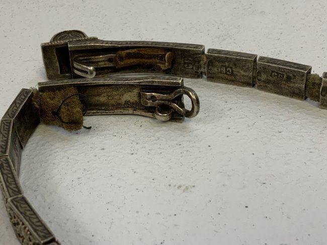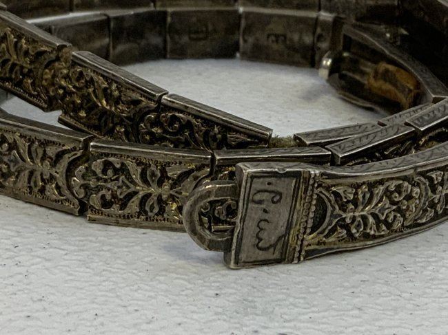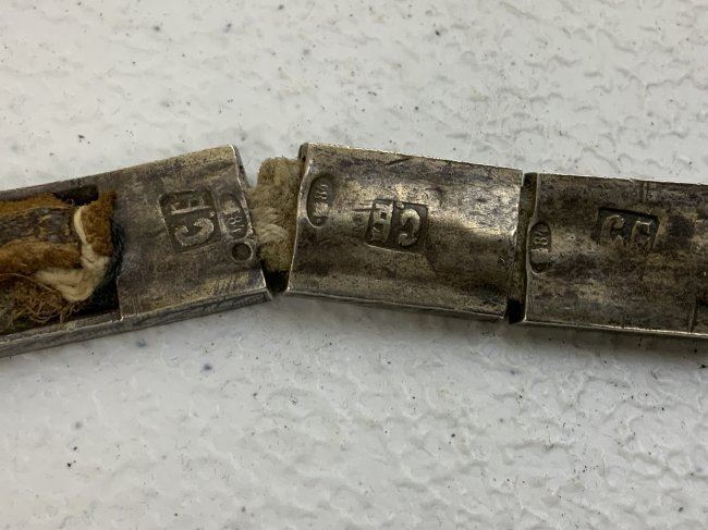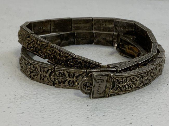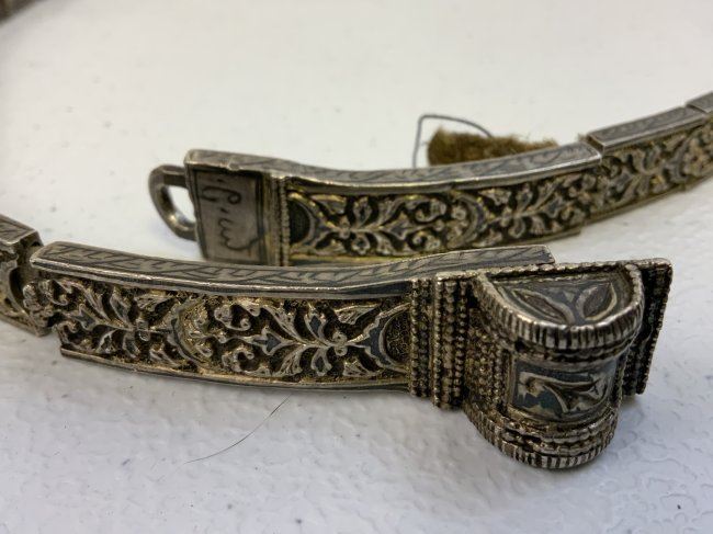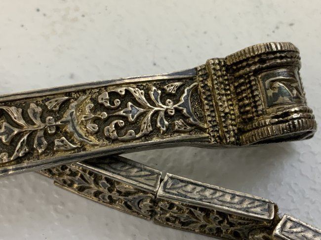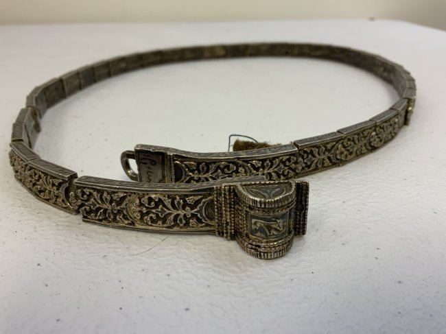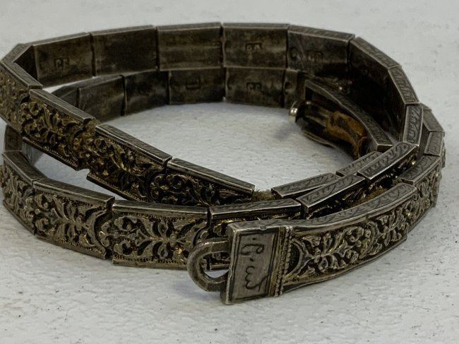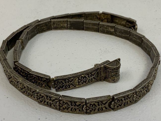 IMPERIAL RUSSIA GEORGIA SILVER FEMALE BELT . BEAUTIFUL SILVERSMITH WORK. ALL LINKS ARE HALLMARKED WITH 84 SILVER IMPERIAL RUSSIAN MARK AND SILVERSMITH STAMP. SIGNED IN GEORGIAN . ORIGINAL LEATHER BACKING SHOWS ITS AGE AND WEAR. RARE AND HIGHLY DESIRABLE ITEM.