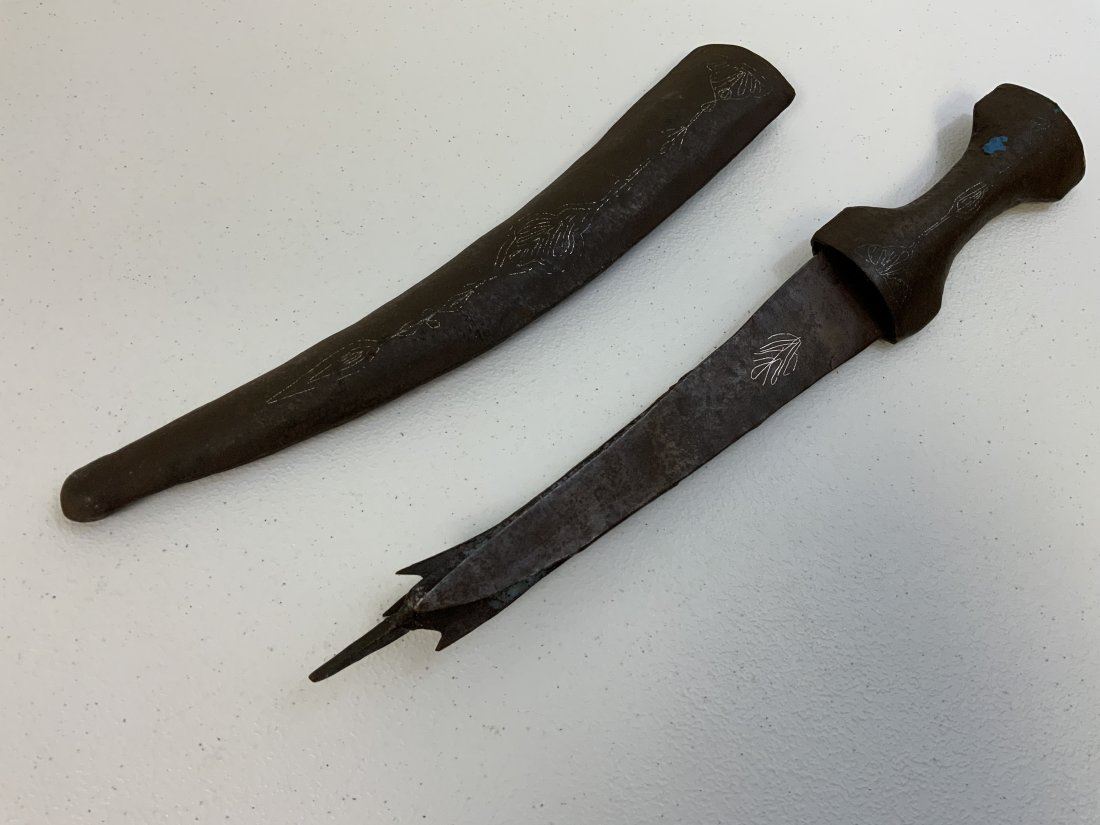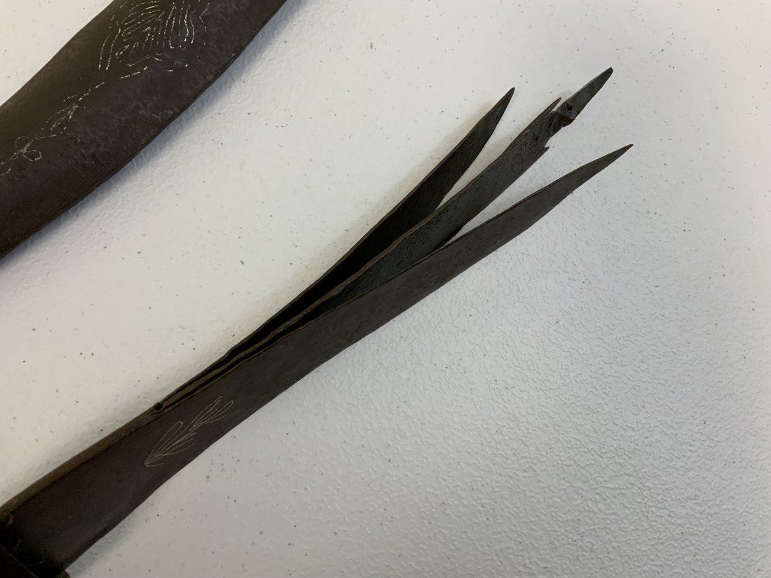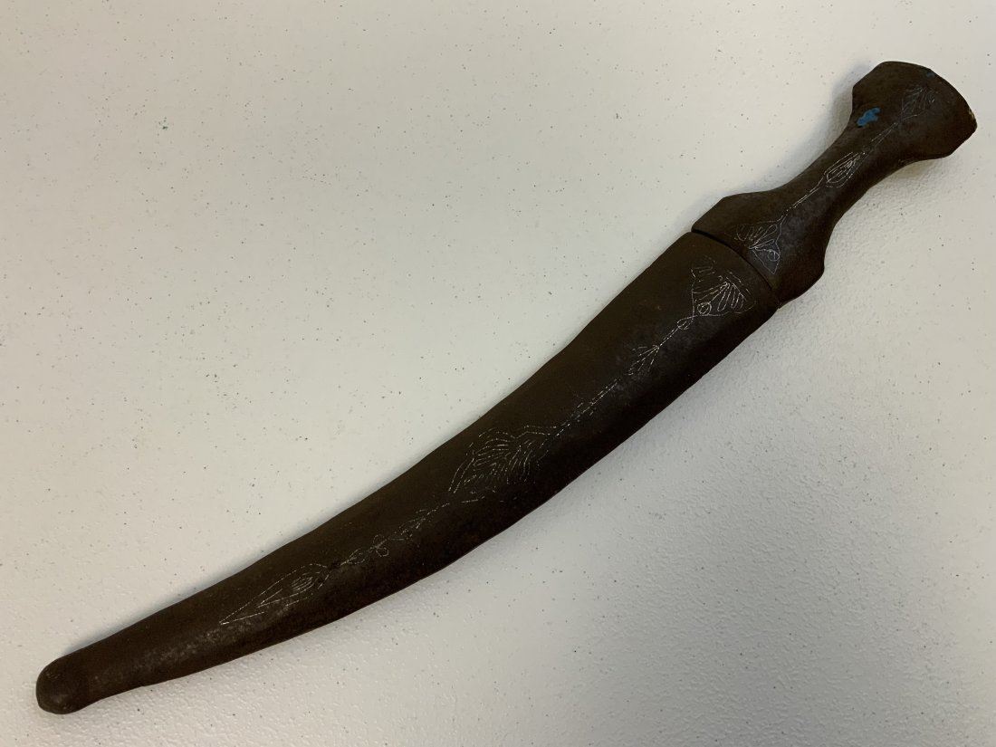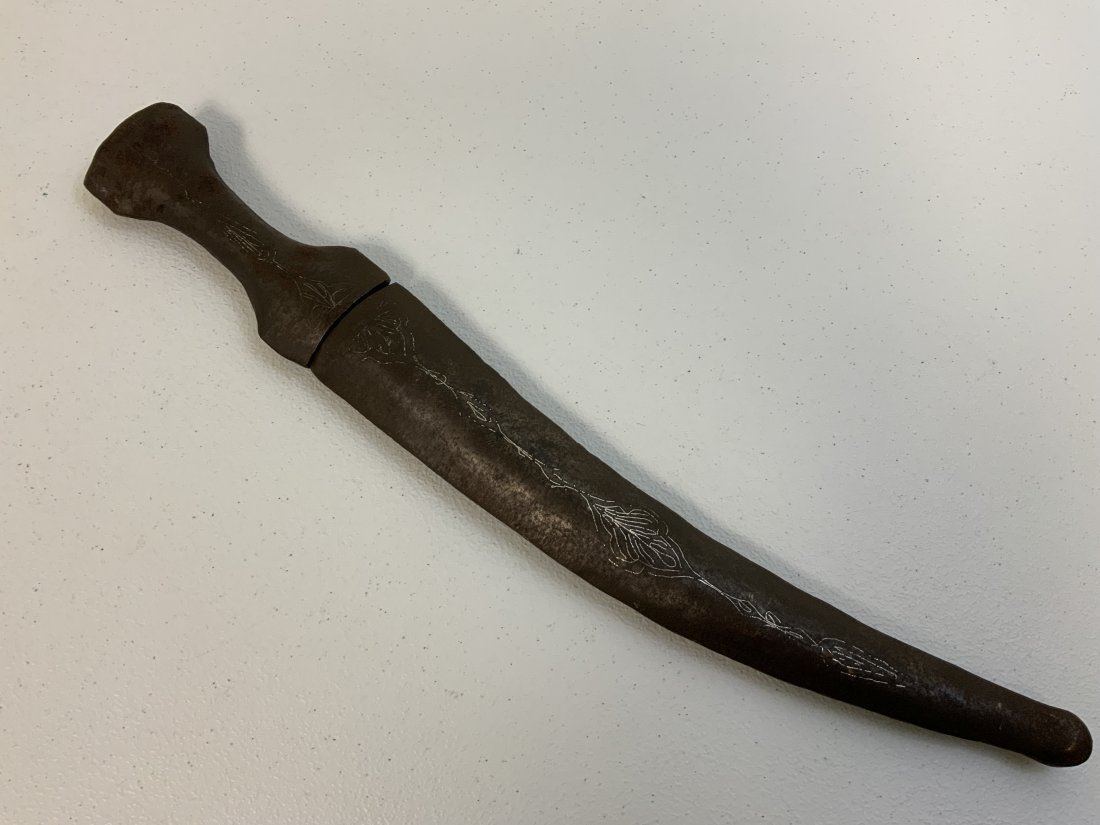 INDO PERSIAN DAGGER KHANJAR WITH SPLIT BLADE . DARK WITH AGE SHOWING REMNANTS OF SILVER DECORATIONS . UNIQUE SPLIT BLADE . THE BLADE IS SOMEWHAT LOOSE INSIDE THE GRIP . " LONG WITH " LONG BLADE .