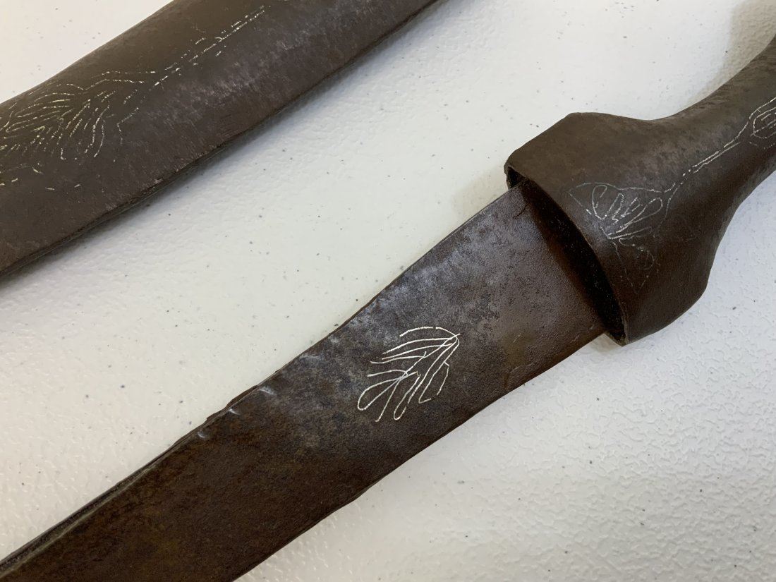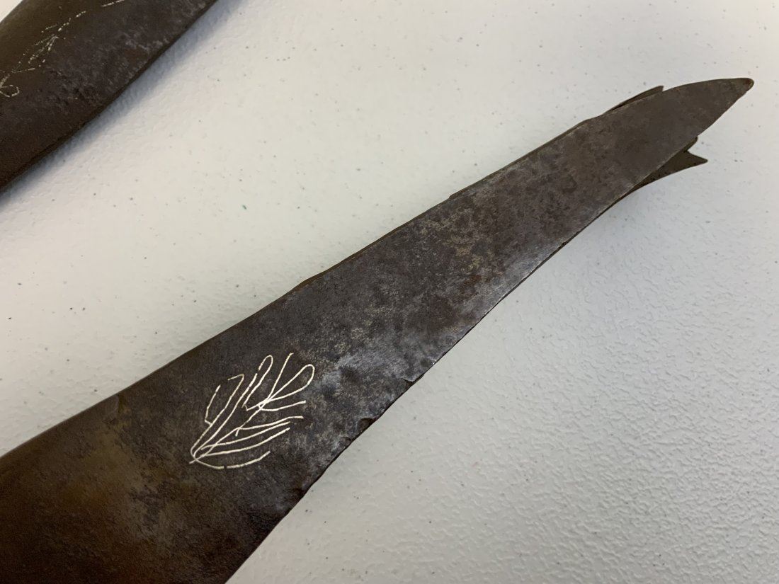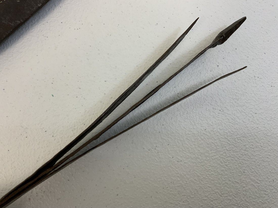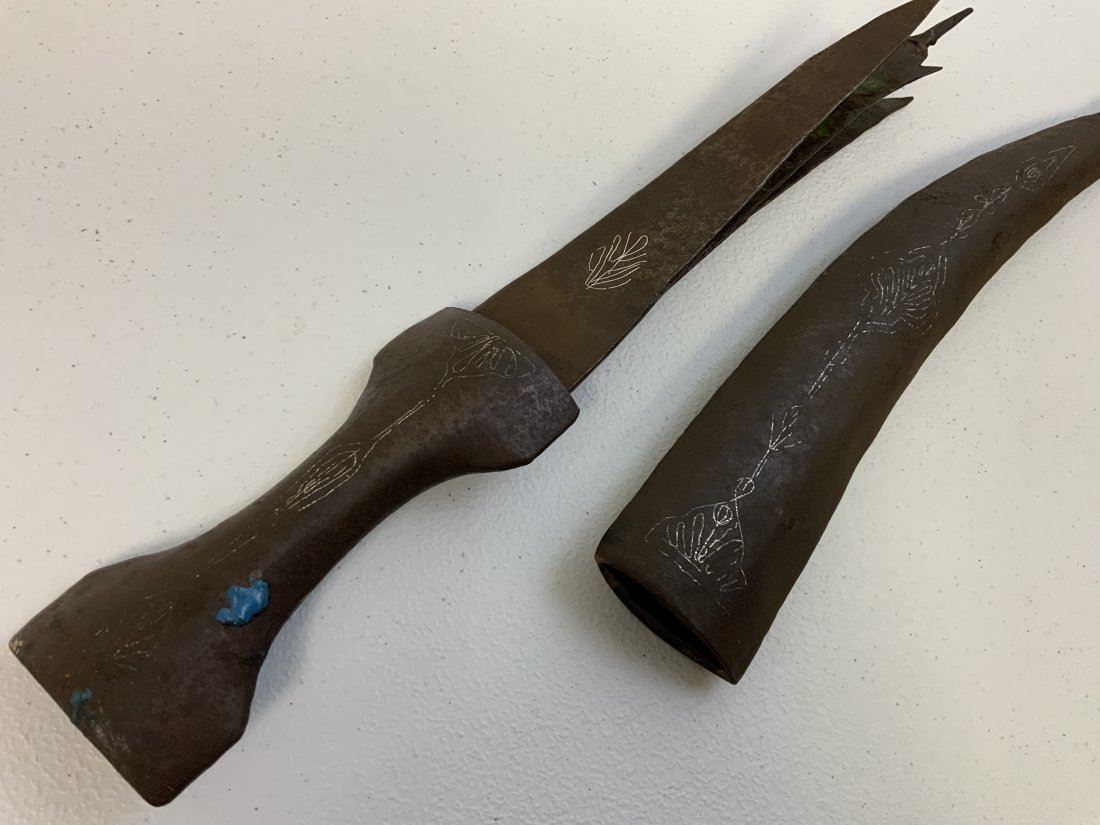 INDO PERSIAN DAGGER KHANJAR WITH SPLIT BLADE . DARK WITH AGE SHOWING REMNANTS OF SILVER DECORATIONS . UNIQUE SPLIT BLADE . THE BLADE IS SOMEWHAT LOOSE INSIDE THE GRIP . " LONG WITH " LONG BLADE .
