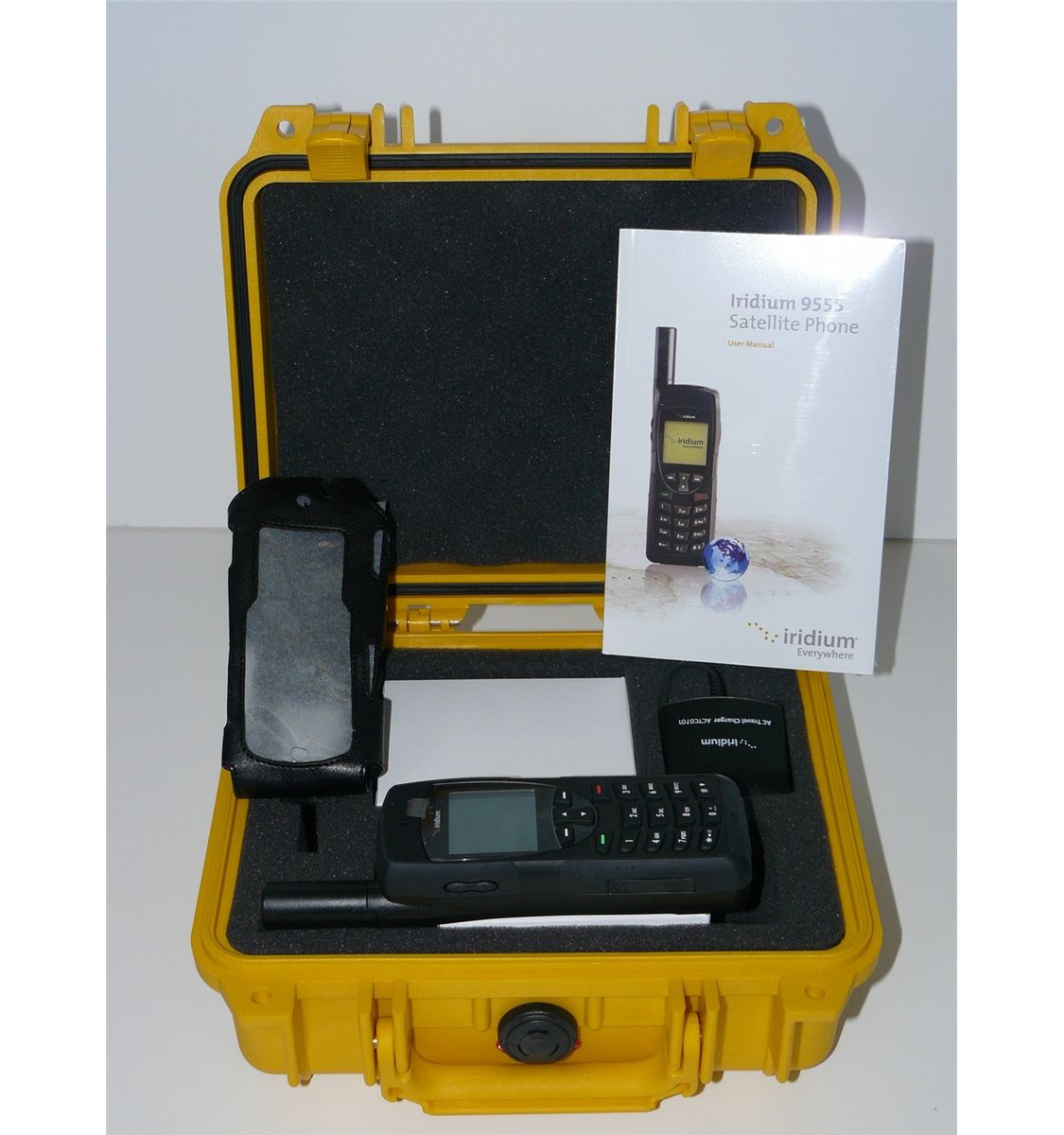 Included: 9555 satellite phone, AC/DC chargers, international plug kit, leather case, antenna adaptor, auxiliary vehicle antenna, high-capacity battery, laminated quick connect guide and watertight Pelican 1200 case