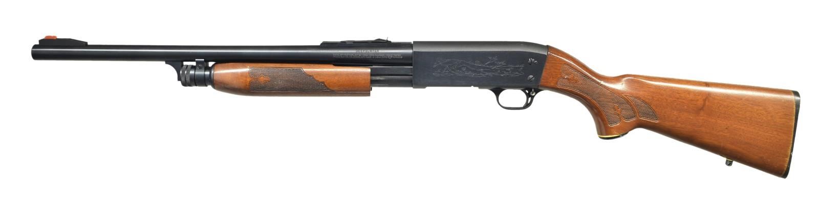 Cal. 12 Ga. S# 371626114. Bbl. 20". High Viz fixed ramp ront & elevation adjustable rear sights. 2 3/4" chamber & fixed choke of “IMP MOD”. Factory game scene engraved receiver, checkered forend & pistol grip ebony capped buttstock. Sling swivels & 14 1/4" LOP to factory buttplate. UNATTACHED ACCESSORIES: spare 28" VR barrel w/ 2 3/4" chamber, choked “IMP MOD” & good bright bore. CONDITION: metal is blued retaining about 90% original finish w/ freckling & light scattered rust. Stock set has light scattered scratches, nicks & dings w/ damage at rear of forend & gouge forward of rear sling swivel. Bore is very good & bright w/ light streaky residue. (22-6279/CW). MODERN. $400-600.