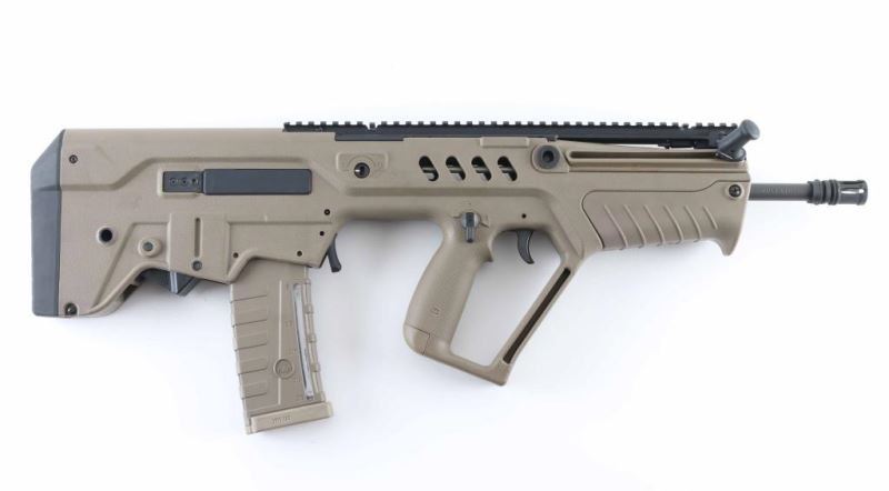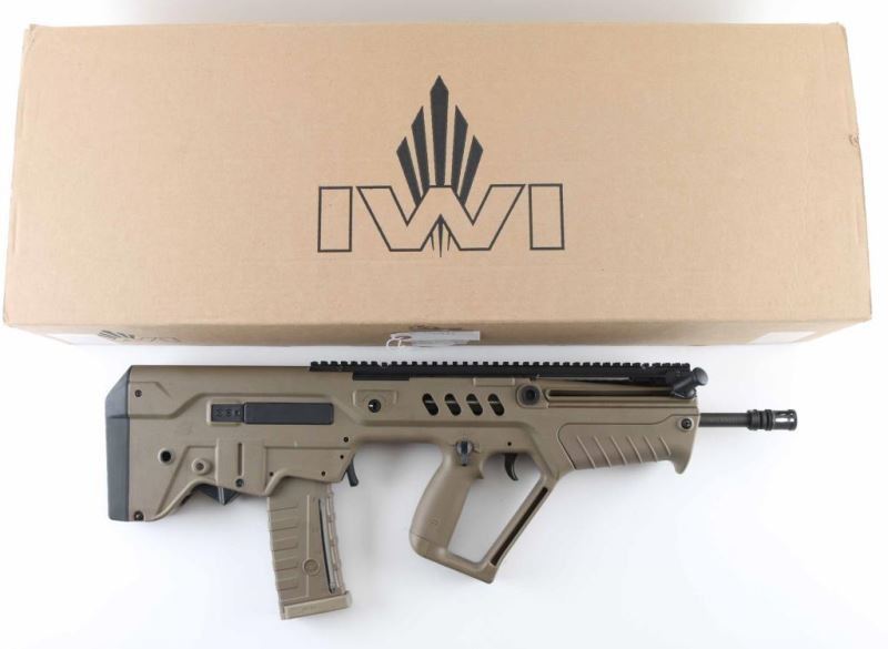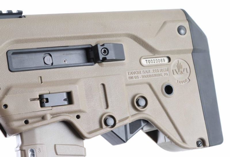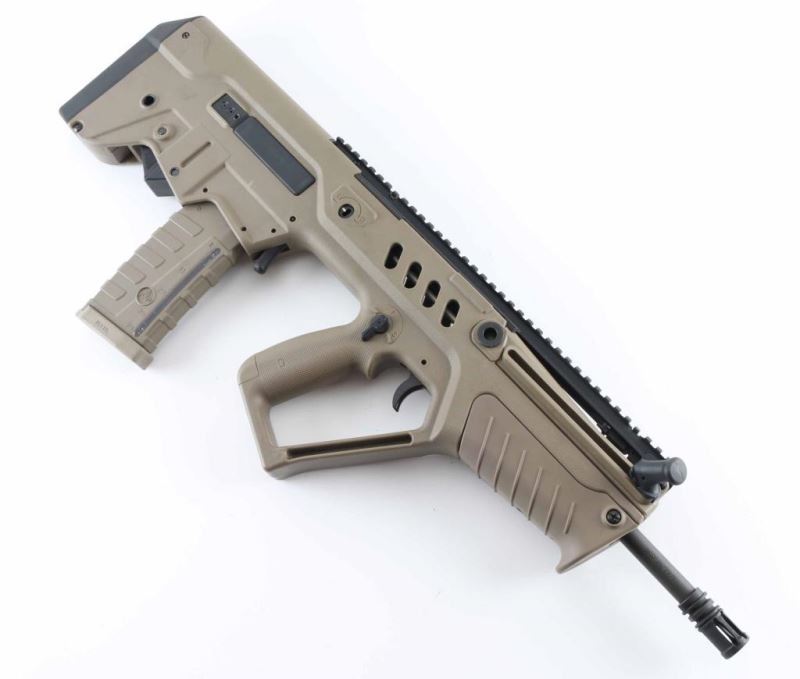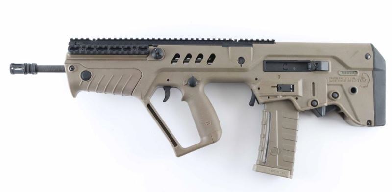 Left Handed as configured. Semiautomatic rifle features bullpup layout, dark earth color polymer furniture, Timney sear assembly, 16" barrel (marked 5.56mm 1:7) with flash hider, Picatinny rail section on top of receiver, flip up sights mounted into the Picatinny rail, manual safety, QD sockets for sling mounting. Bore is very good condition, appears hard chrome lined. Retains 95% finish on metal surfaces, with minor handling marks. Stock is excellent condition. Includes (1) magazine (30 rd), factory box, manual, cleaning kit, sight adjustment tool, QD swivels, right handled bolt (need to check headspace if changing bolts), factory sear assembly. Condition is NRA Excellent *** Modern Firearm ***