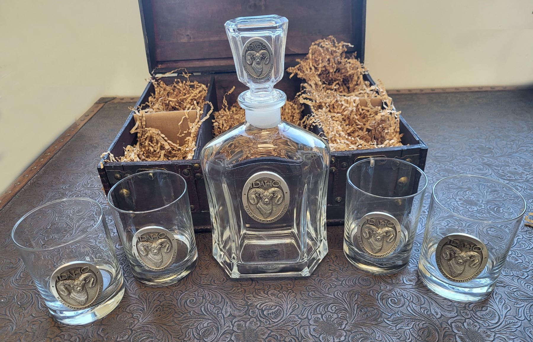 This chest boxed set contains one 24 ounce glass decanter and four (14 ounce) double old fashioned glasses. Each is embellished with a fine pewter casting of the Idaho WSF ram.