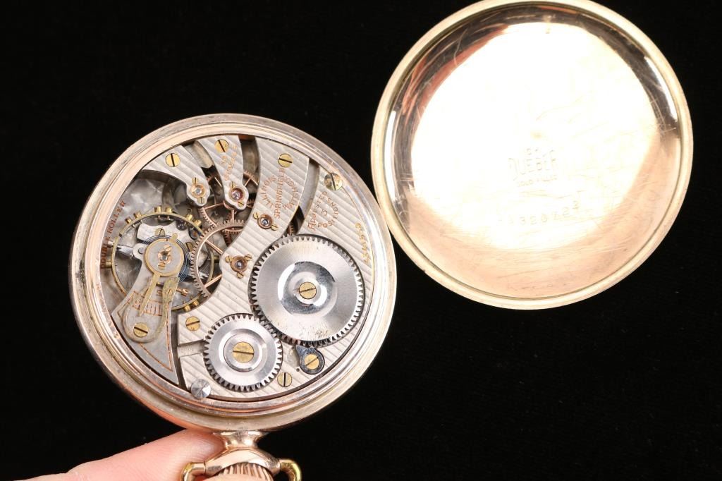 Illinois Grade 706, model 9, size 16, 19 jewel, 3 adjustments. Number 4341659, manufactured 1923. 10K gold filled Dueber case. Inside of case has many small scratches. In good working order.