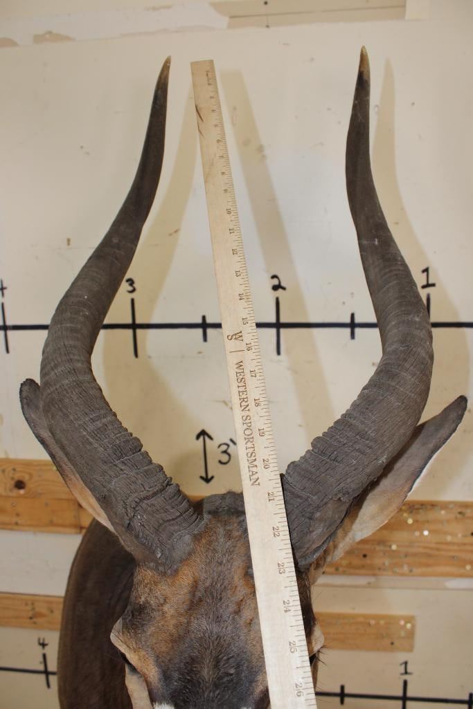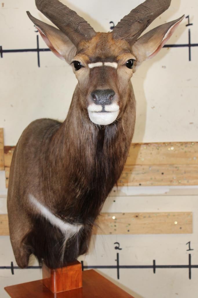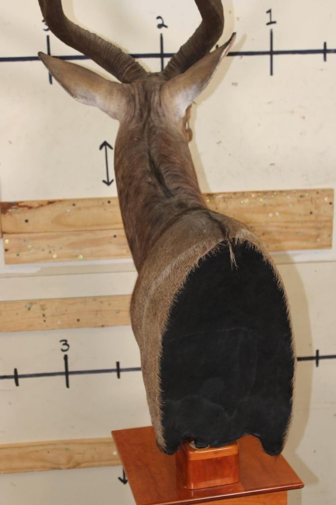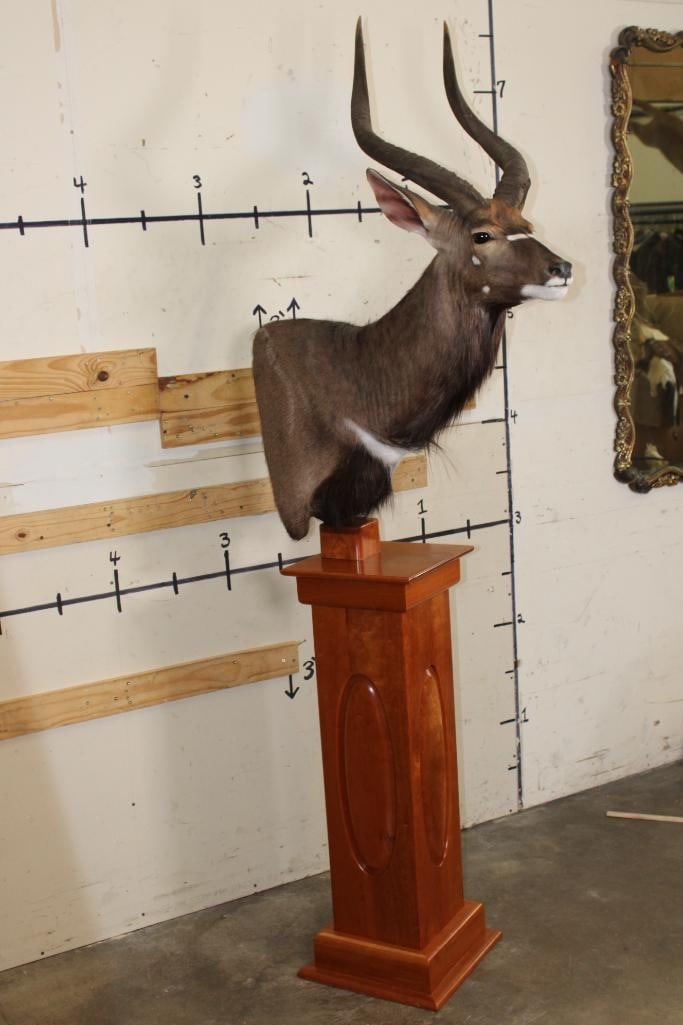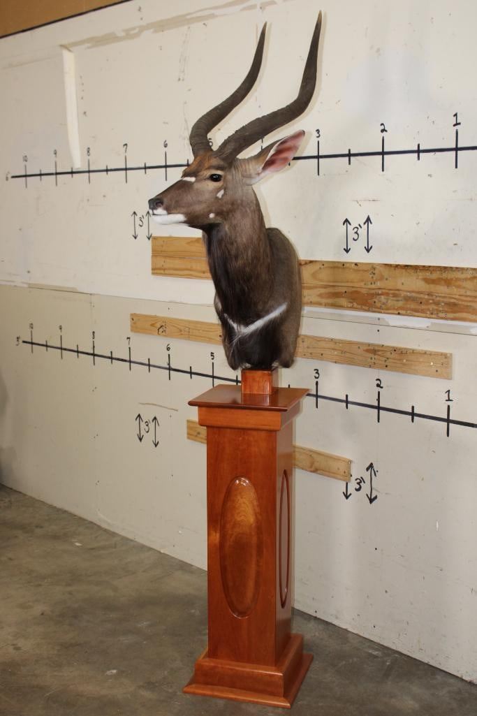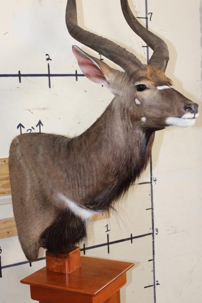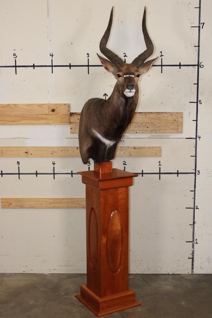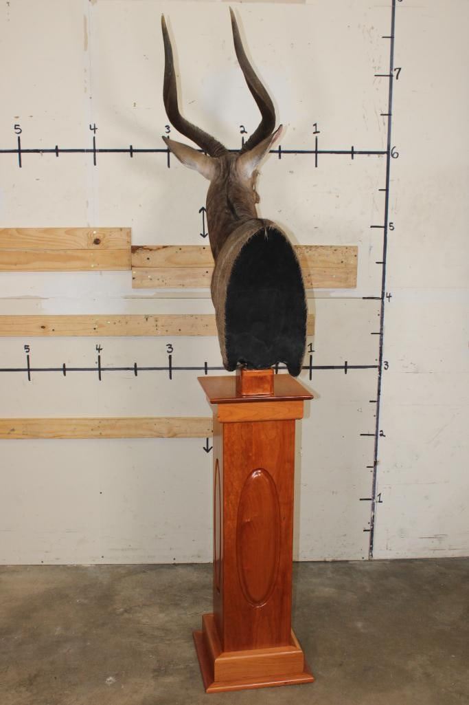 Incredible NYALA Pedestal Mount in *Like New* Condition. This is a Very High Quality mount and the Nyala is on a Cherry Wood Pedestal Base. The Left Horn measures 27.75" Long and the Right Horn measures 28" Long. The Cherry wood Pedestal Base measures 15" Long x 15" Wide x 39.5" Tall. The Total mount Height is approximately 7' 1" Tall. TAXIDERMY