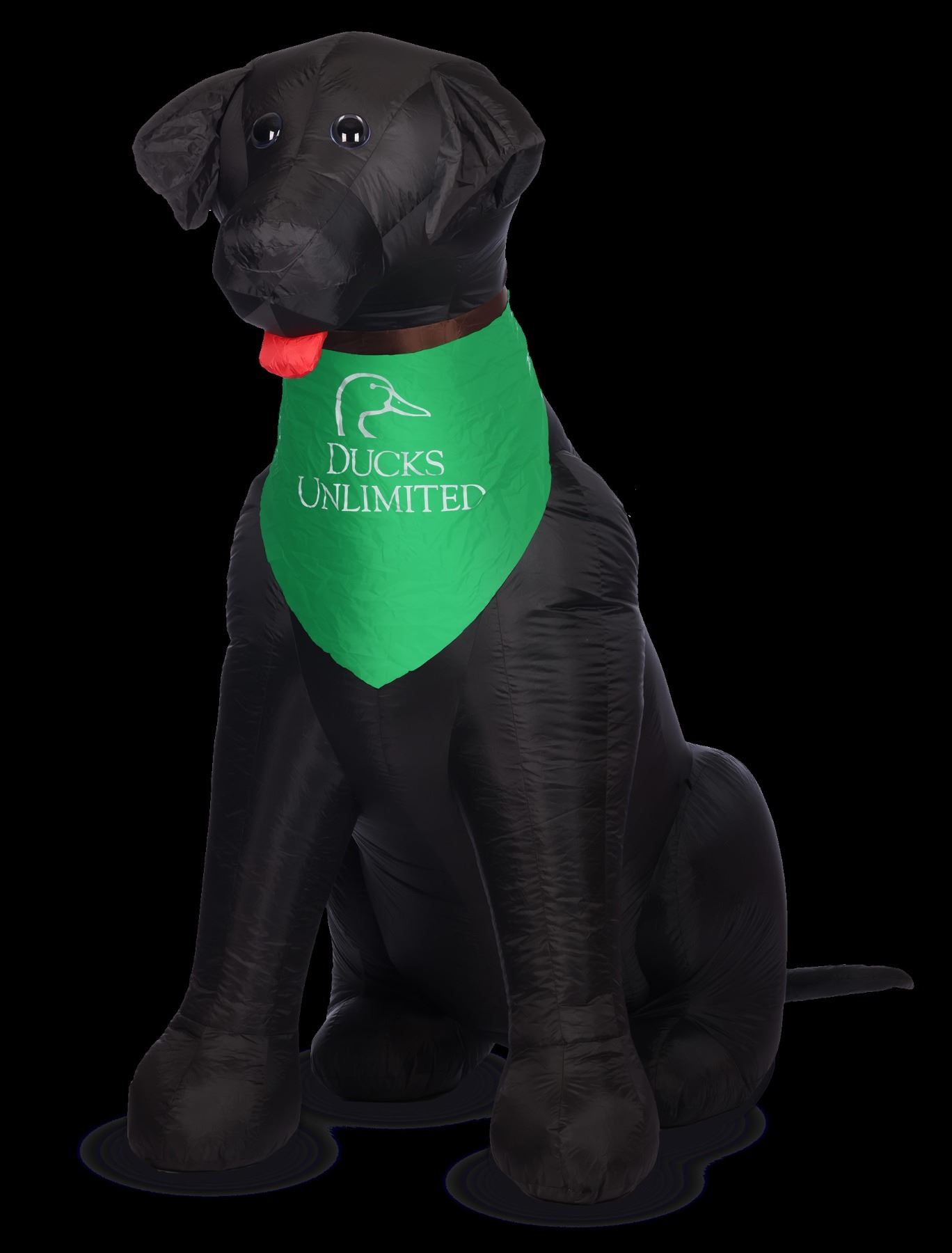 Kick off your hunting season, event, or party with the inflatable oversized whimsical black Lab yard décor.Standing approximately 8 feet tall, this playful yet impressive addition is sure to delight guests and passersbyalike. Complete with a pump for easy setup, ties, and stakes for stability, it's designed for quick assembly anddurable outdoor use. The black Lab features a charming bandana adorned with the Ducks Unlimited logo,adding a touchof outdoor flair to your festivities. Ideal for creating a festive atmosphere, this inflatable Labbrings a sense of fun and outdoor spirit to any gathering.