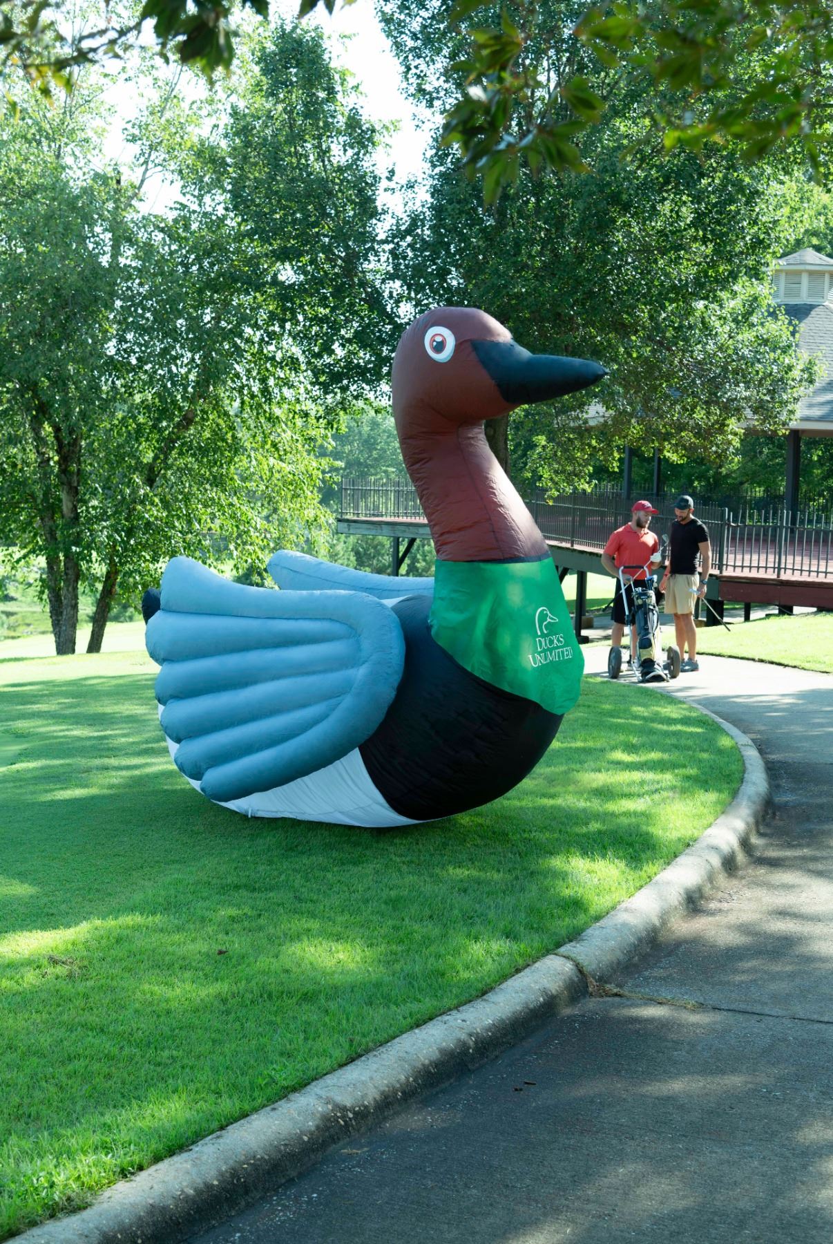 The Inflatable Canvasback sets the tone for hunting season, events, or gatherings with its oversized and whimsical presence. This inflatable yard décor captures attention with its playful depiction of a Canvasback duck. Complete with a pump, ties, and stakes, it's easy to set up and secure. Adding a charming touch, the Canvasback features a Ducks Unlimited logo bandana. Standing at an impressive 8 feet tall, this inflatable canvasback injects a sense of fun and festivity into your outdoor space, capturing the spirit of Ducks Unlimited's mission delightfully and engagingly.