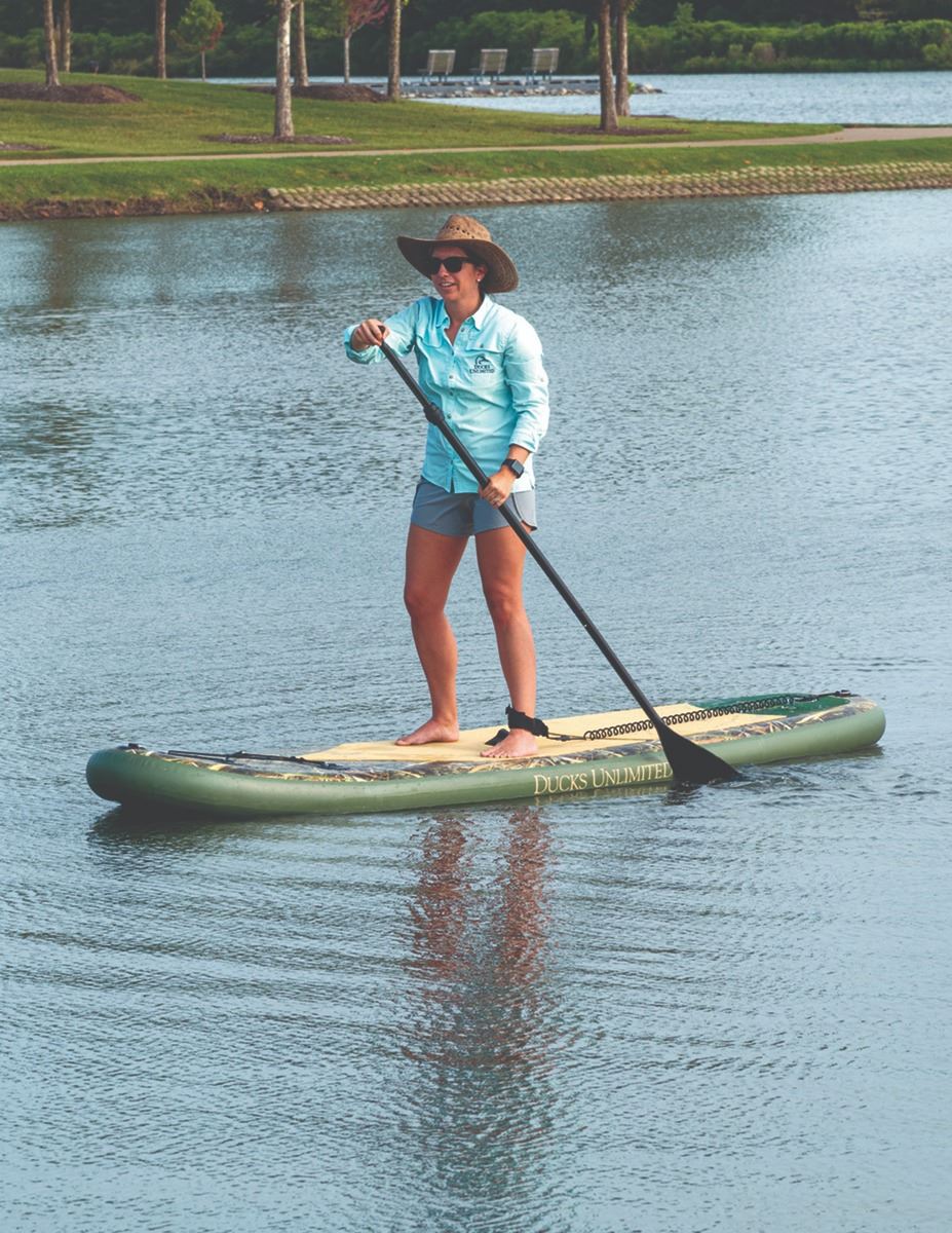 Created for the adventurer, this inflatable stand up paddleboard has Ducks Unlimited logos on the top, side, and bottom. It is made of double-layer UV protected material featuring DU Mossy Oak Shadow Grass Habitat camo with tan and green accents. The complete package comes with a DU logo backpack, air pump, ankle strap, paddle, and service kit. Holds up to 250 lbs.
