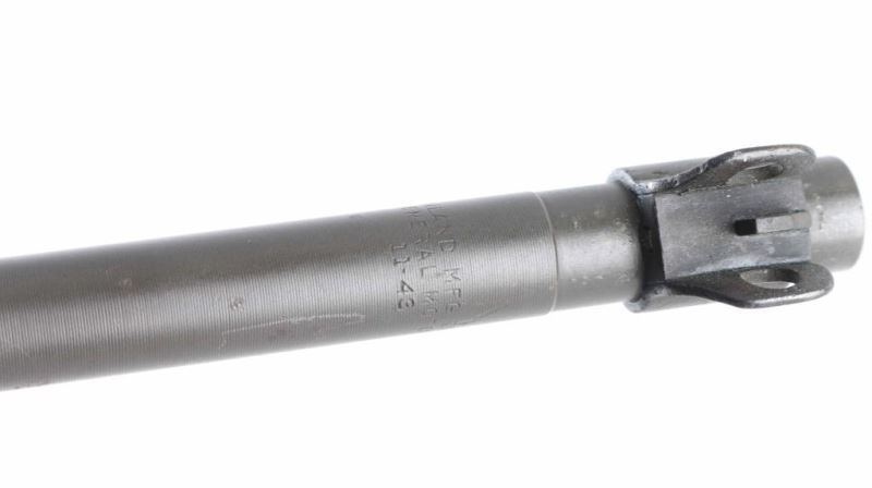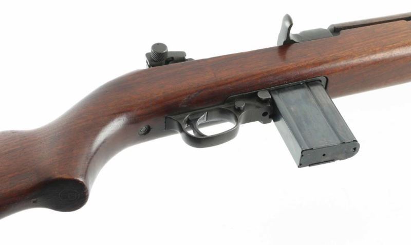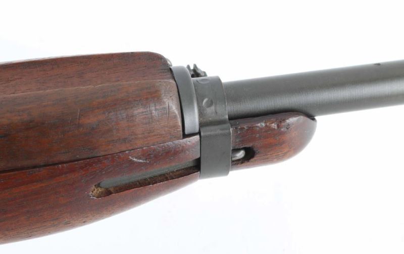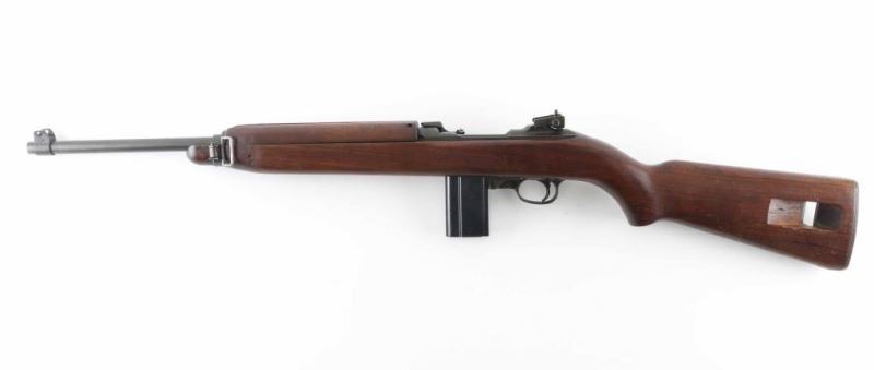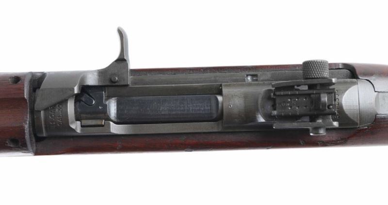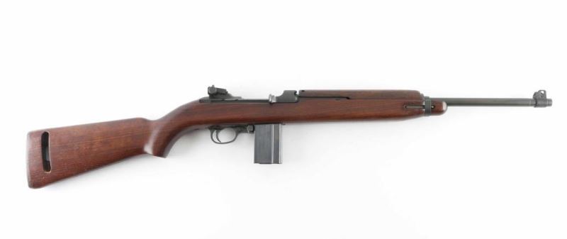 US military semiautomatic rifle manufactured circa late 1943. Features parkerized finish, walnut stock & handguard, protected blade front sight, peep rear sight with sliding elevator, 18" barrel, push button manual safety, front sling swivel, narrow front band without bayonet lug, sling slot in butt, accepts detachable magazine. Flat top bolt, two rivet handguard. Bore is good condition, might improve with cleaning. Retains 90% finish, colors and textures consistent with US production or US military arsenals, shows loss on edges and where moving parts rub. Front sight shows roughness from previous pitting under new finish. Wood is very good condition with minor dents & dings. Markings include "INLAND 11-43" on barrel, "P" in circle stamped on grip bottom. No importer marks observed. Includes one very good condition blued steel magazine marked "U". Condition is NRA Very Good (arsenal rebuild) *** C&R Firearm ***