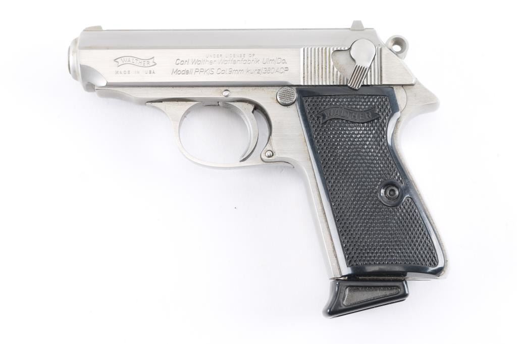 Semiautomatic compact pistol manufactured in the USA under license by Interarms, Alexandria VA. Features stainless steel construction, double action trigger, 3.3" barrel, fixed front sight with orange dot, dovetailed rear sight with square notch & orange bar, serrated trigger, serrated round hammer spur, thumb safety/decocker on the left side of the slide, loaded chamber indicator on the rear of the slide, push button magazine release, factory 7 round magazine with finger rest floorplate, and checkered black plastic grips with molded Walther banners. Bore is excellent. External appearance is very good with scratches and other handling marks, some discolored areas that appear to be dried grease or dirt. Grips are very good. Includes a fair condition leather shoulder holster, US issue, tan with added brown dye, hook for cross strap is broken.