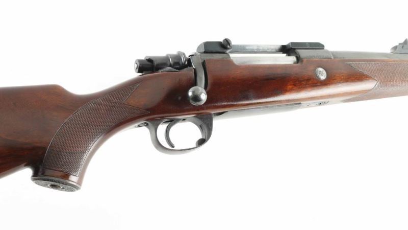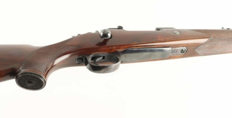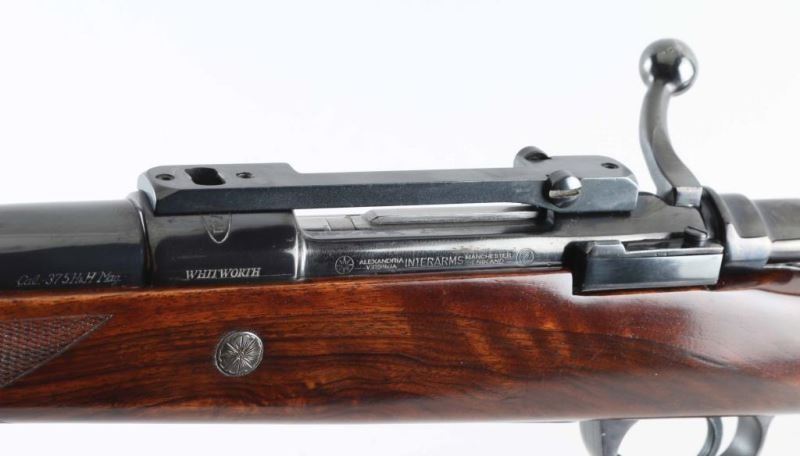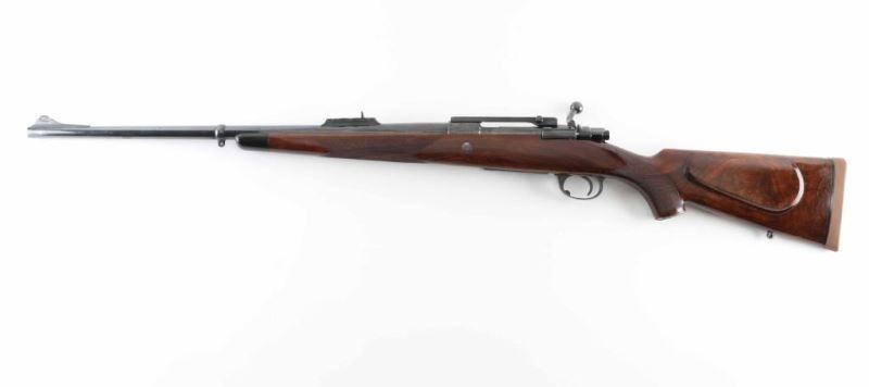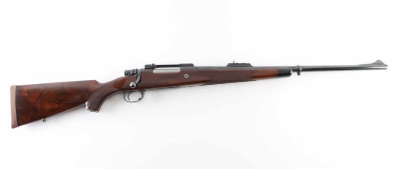 British bolt action rifle imported by Interarms, Alexandria VA. Features blued finish, fancy figured walnut stock with ebony forend tip, 24" barrel, blade front sight, island mount express rear sight with one standing and two folding leaves, front sling stud on barrel band, rear sling stud, solid rubber recoil pad, right handed pancake cheekpiece with shadow line, one piece Redfield scope base on receiver, swept bolt handle, checkered flat on underside of bolt knob, manual safety on right side of receiver tang, hinged floorplate, floral engraved grip cap, engraved stock bolt heads, checkered panels at wrist & forend. Bore is very good condition. Retains 90% blued finish with scrapes to barrel, handling marks throughout. Stock is very good condition. Condition is NRA Very Good++ *** Modern Firearm ***