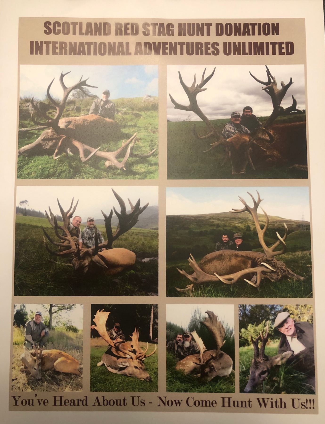 Without question, our red stag hunt in Scotland is right at the top of the list of the most exciting and exceptional hunting values that we at International Adventures have put together in the 40 years we have been taking people big game hunting. For twenty three years now, we have offered our clients Red Stag hunts in Scotland on a complete package basis, which makes for a stress free trip for our guests. This hunt is very popular for two reasons. First, my wife Danielle, and I are in Scotland running the hunting and touring ourselves, thus personally responsible for the success of our guests’ experience from the moment they arrive in Scotland. Another aspect that makes this opportunity so unique is although our basic donation includes one hill stag, which is a wild stag running in the high heather hills. Last year we were able to lease the famous Glenfiddich and Carbrach Estates, which is nearly 100 square miles of the best wild hill stag hunting in all of Scotland! I also have the exclusive right to incredible estate stags on our estates, to which our hunters can upgrade to, which are unquestionably the best private herds of red stag in all of Scotland maybe in all of Europe. The top Scottish estate stags have come from this herd for over 40 years! This basic package does include airport transfers, meals, and lodging at the luxurious Lands of Loyal Hotel and the harvesting of one hill stag. The successful bidder may upgrade to one of our incredible estate stags on a cost basis for which a comparable head elsewhere could cost several times as much. While on this trip, roe deer, fallow deer, a soay, Hebridean, or Jacob’s ram may also be taken at a cost of $175.00 an outing, plus $950.00 for a roe deer, $1,450.00 for a fallow deer and $950 for a soay, $1,250 for a Hebridean, and $1,650 for a Jacob’s ram. Trip is good for open dates in 2020.