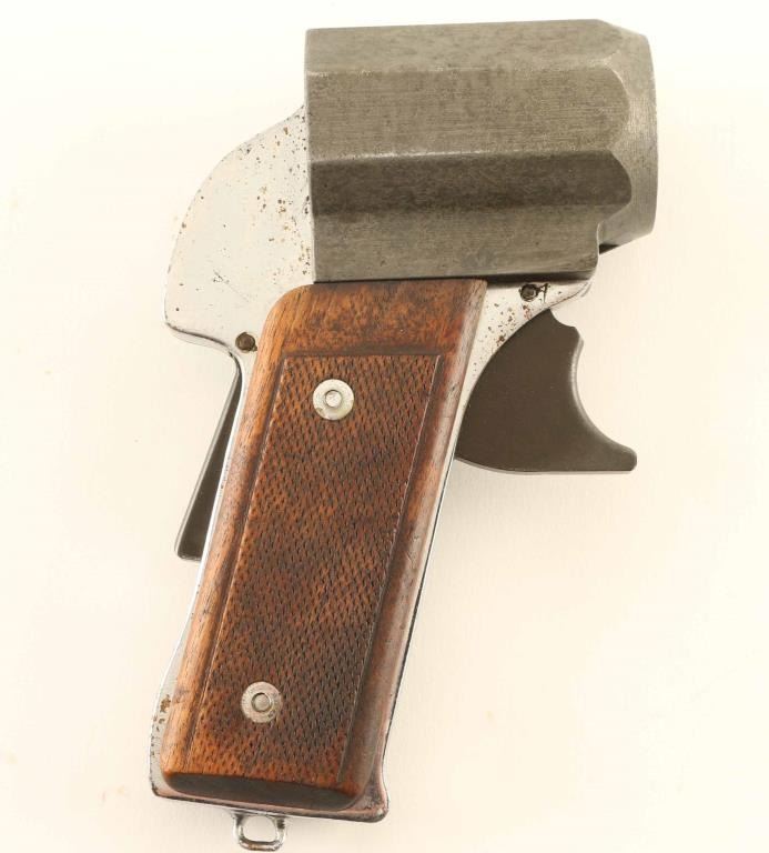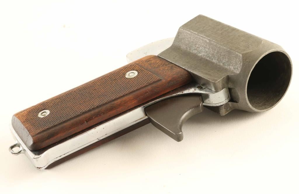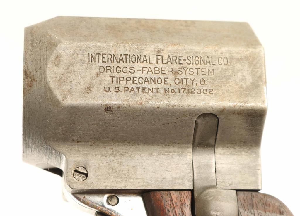 WWII era U.S. military single shot 37mm flare pistol made by International Flare-Signal Co. of Tippecanoe City, OH. Featured steel construction with a 2.25" fixed barrel, grip safety, large trigger without guard, lanyard loop on the butt and checkered wood grips. Side latch holds the cartridge, which loads and unloads from the front. The barrel is stamped "INTERNATIONAL FLARE-SIGNAL CO. / DRIGGS-FABER SYSTEM / TIPPECANOE CITY, O. / US PATENT NO 1712382". Barrel is very good with smooth bore, gray color, light patina forming all over. Grip frame is chrome or nickel plated, good condition. Grips are good serviceable condition. Trigger appears to operate without grip safety held down. Overall condition is Good or better.