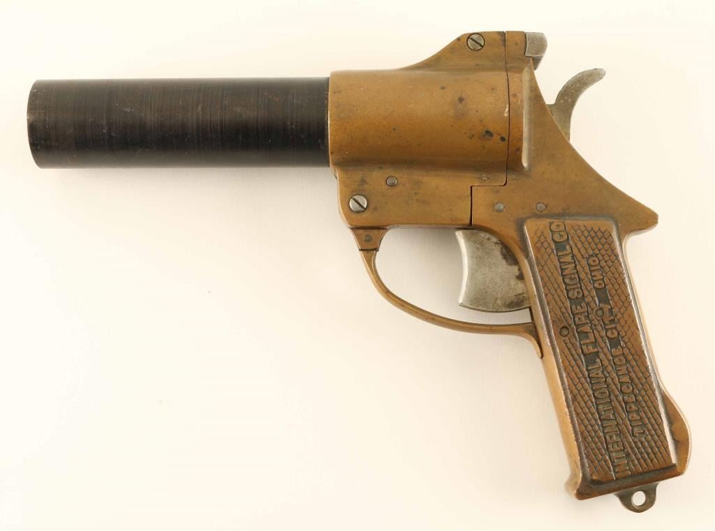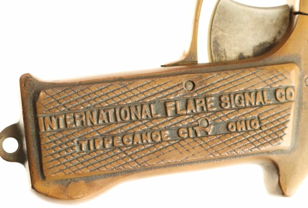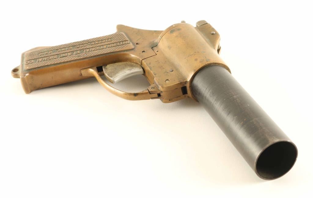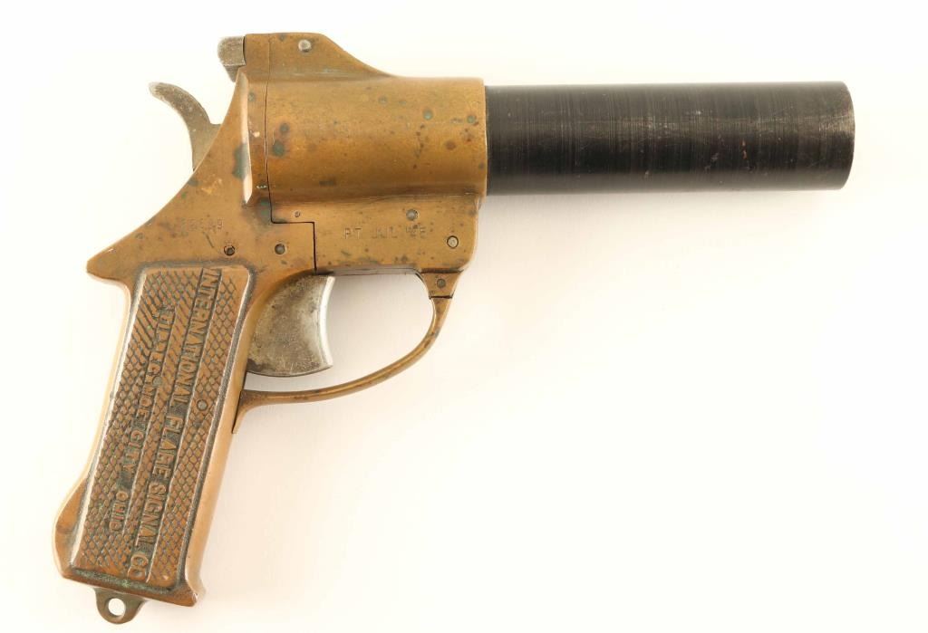#32699 WWII era U.S. Military top-break 37mm flare pistol manufactured by the International Flare Signal Co. of Tippecanoe City, OH circa 1945. Features a blued 8 1/8" barrel with brass extension/upper frame, "T" shaped barrel latch, guarded trigger, exposed hammer with serrated spur and brass frame with integral checkered grip & lanyard loop on the butt. Bore is fair to good condition with roughness and some pitting. The barrel retains approximately 50% bluing showing thinning & scattered oxidation/rust and the brass exhibits a nice aged patina. Action is in good working order. Condition is Very Good.