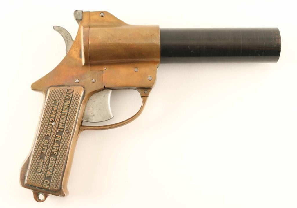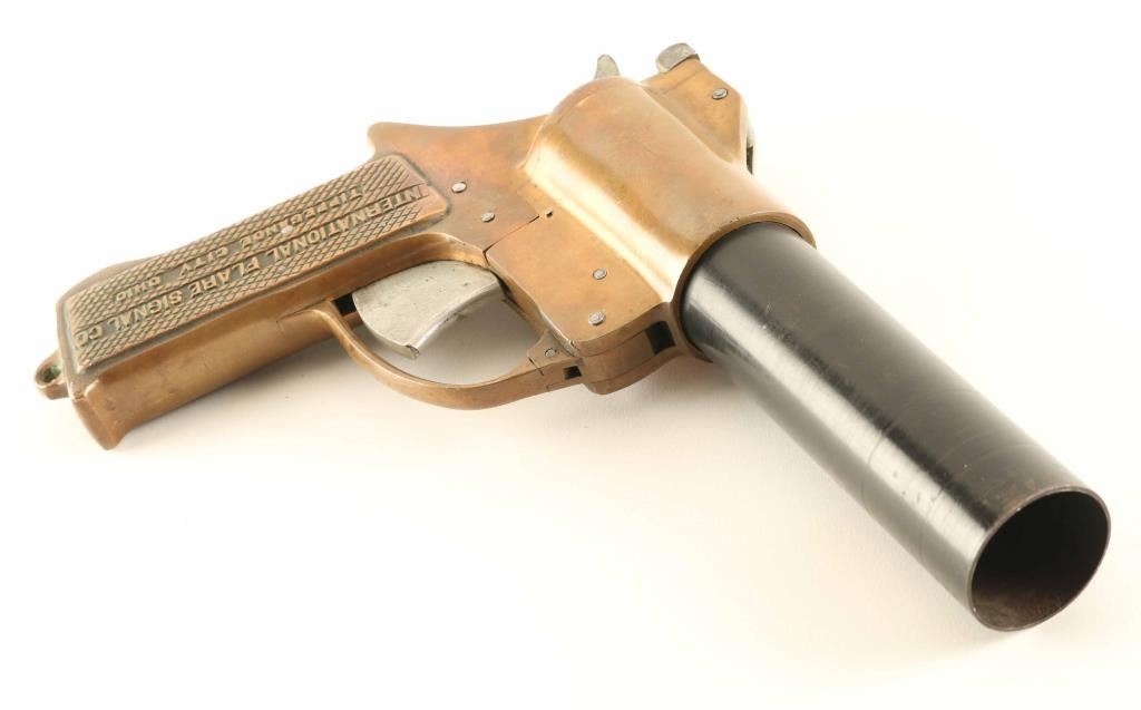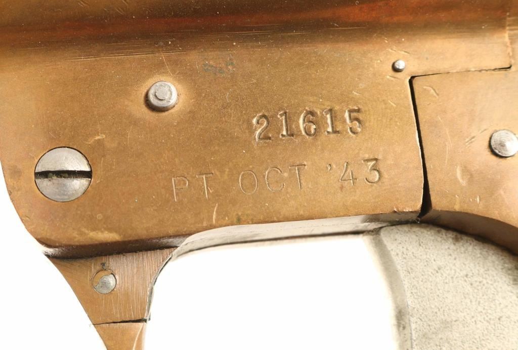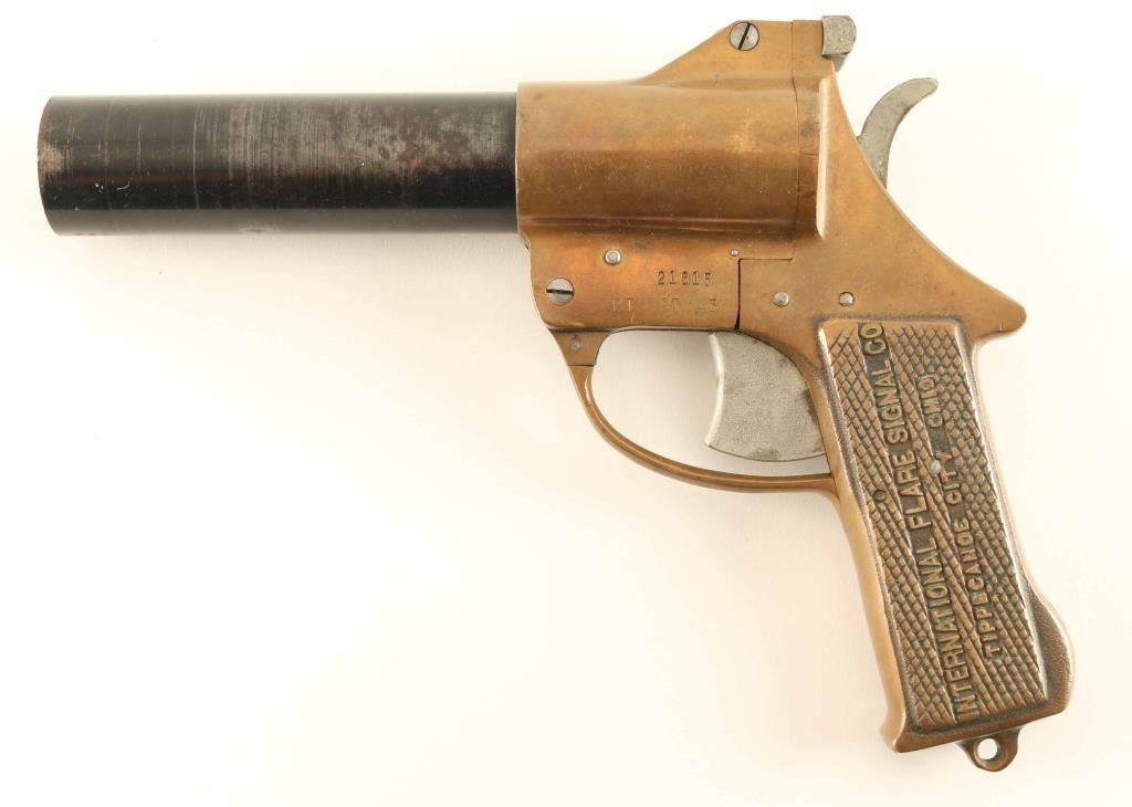 #21615 WWII era U.S. Military top-break 37mm flare pistol manufactured by the International Flare-Signal Co. of Tippecanoe City, OH circa 1943. Features a blued 8 1/8" barrel with brass extension/upper frame, "T" shaped barrel latch, guarded trigger, exposed hammer with serrated spur and brass frame with integral checkered grip & lanyard loop on the butt. Bore is fair to good condition with roughness and some pitting. The barrel retains approximately 70% bluing showing thinning & bare metal from use and handling, with patches of cleaned pitting. The brass exhibits a nice aged patina. Action is in good working order. Condition is Very Good.