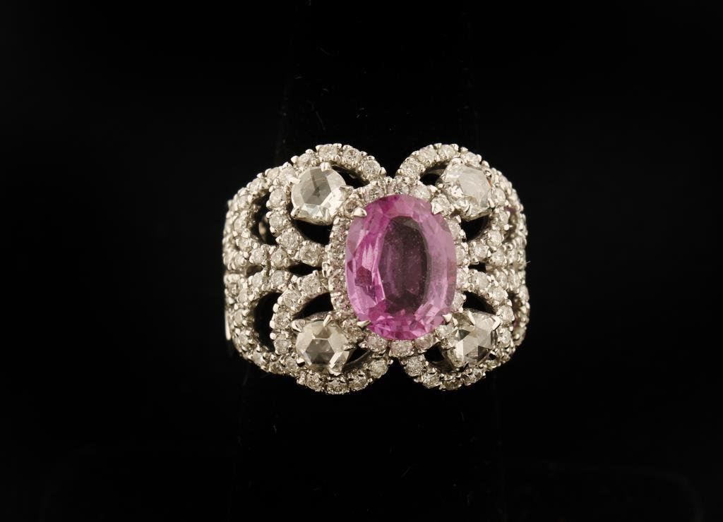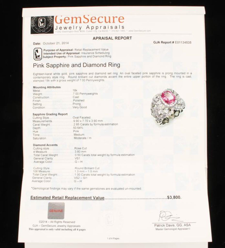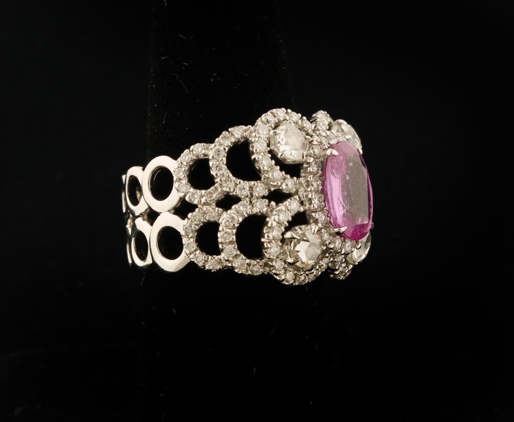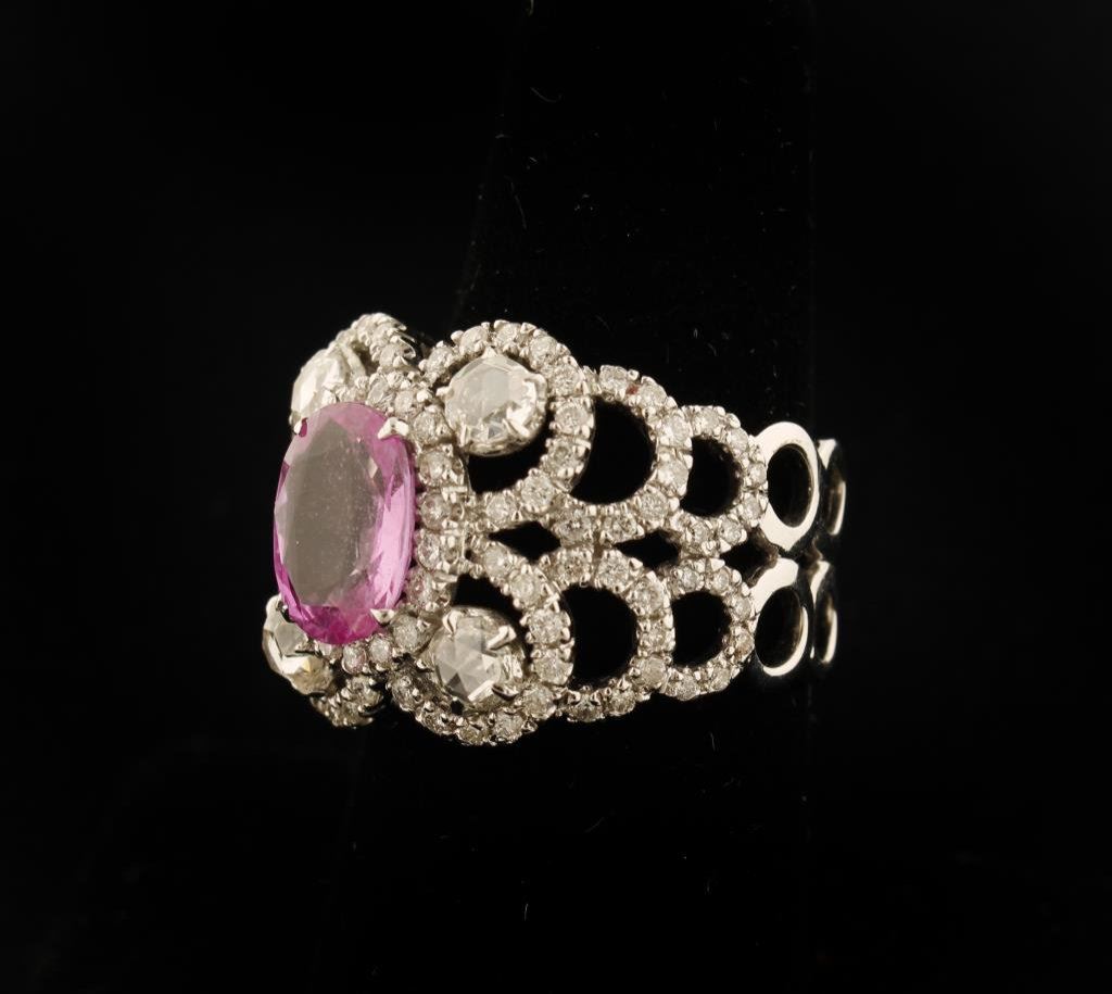Intricately designed Pink sapphire and diamond ring made in 18k white gold, oval sapphire weighing 2.85ct approx 1.50ct all diamonds are g-h color and VS2 clarity Est. Retail Value $4000-5000