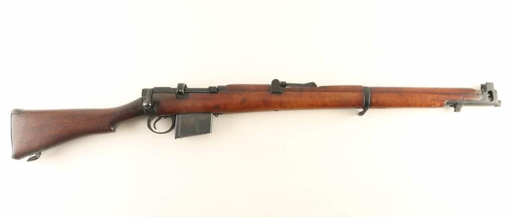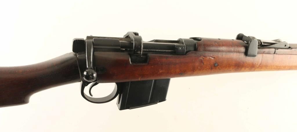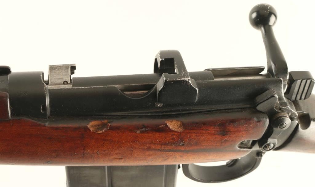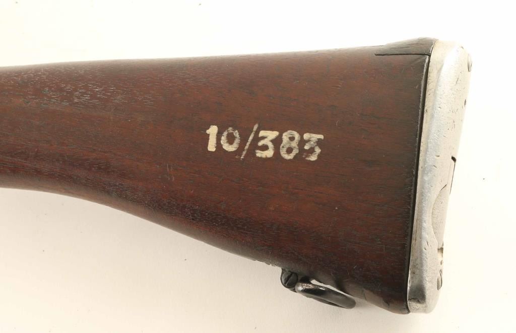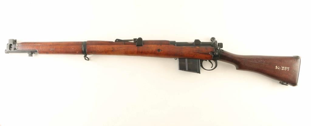 Indian military bolt action rifle dated 1967. Features 25" barrel, bayonet lug, protected post front sight, adjustable rear tangent sight with protective ears, 10 round detachable magazine, stripper clip guide bridge, manual safety, sling swivels, two piece wood stock with straight grip, aluminum buttplate with trap door storage compartment. Bore is very good condition, bright with strong rifling. Metal has 80% coverage of black paint finish (blued magazine), bare metal on sharp edges, some high spots, bolt knob. Bolt body is mostly in the white, very good condition, with black painted bolt handle and outside surface of locking lug and extractor. Wood is good serviceable condition, with dents and scratches, several gouges near rear band, repair section in upper butt near buttplate. Small stamped markings on right rear of receiver may be importer marks, are not legible. Butt painted "10/383" in white paint, letters 1/2" tall. Condition is NRA Good+ *** C&R Firearm ***