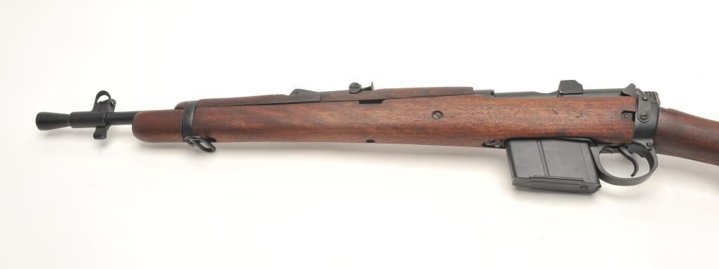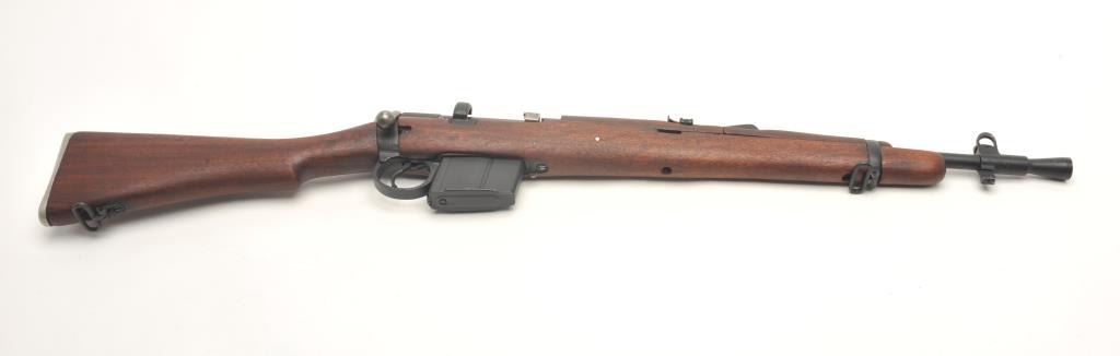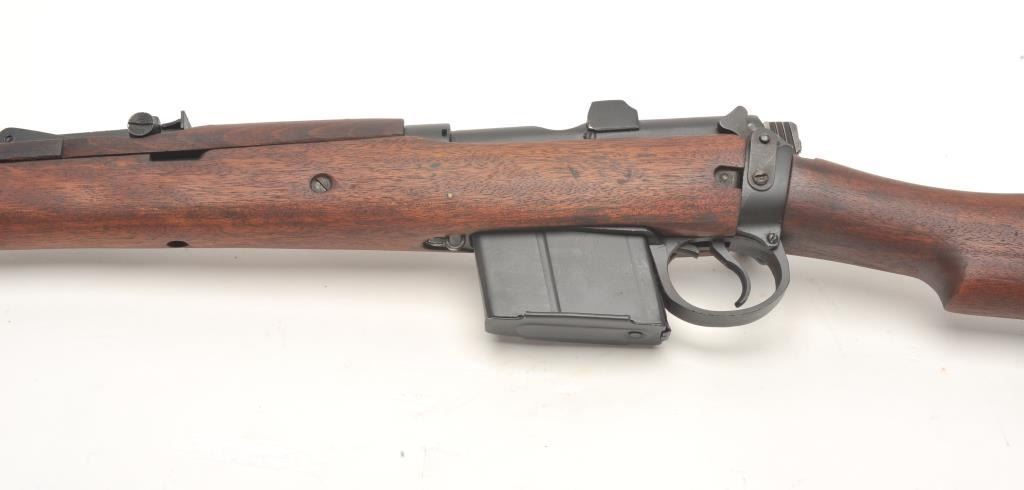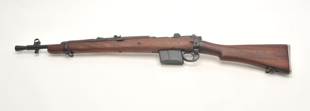 Ishapore Lee-Enfield Jungle carbine, .308 caliber, serial #57584. The carbine is in very good overall condition with a 21” barrel with a post front and military style tangent rear sights. The barrel and receiver retain nearly all of their black military finish with light handling marks. The wrist is marked, “RFI”, 7.62mm and is dated 1967 with other proofs. The smooth wood stock is in very good condition and ends with an aluminum butt plate with trap. The bore is good, the action crisp and markings are sharp. (Modern) Est.: $200-$400.
