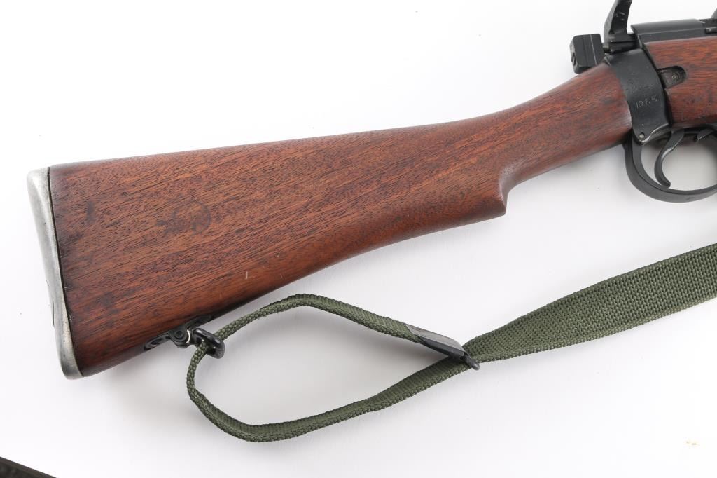 Indian military bolt action rifle dated 1965, manufactured at Rifle Factory Ishapore, imported by NAC, Ridgefield NJ. Very small/feint on right receiver. Features 25" barrel, bayonet lug, protected post front sight, adjustable rear tangent sight with protective ears, 10 round detachable magazine, stripper clip guide bridge, manual safety, sling swivels, two piece wood stock with straight grip, aluminum buttplate with trap door storage compartment. Bore is excellent/bright. black painted finish retains about 90% coverage, some handling/edge wear, friction wear on the bolt.. Wood is excellent. Serial number matched on receiver, bolt handle, nosecap, rear sight, can;'t make out the number on fore stock. Left stock collar marked "Crown/Rifle/7.62mm2A1/R.F.I./1965". Comes with correct green web sling.