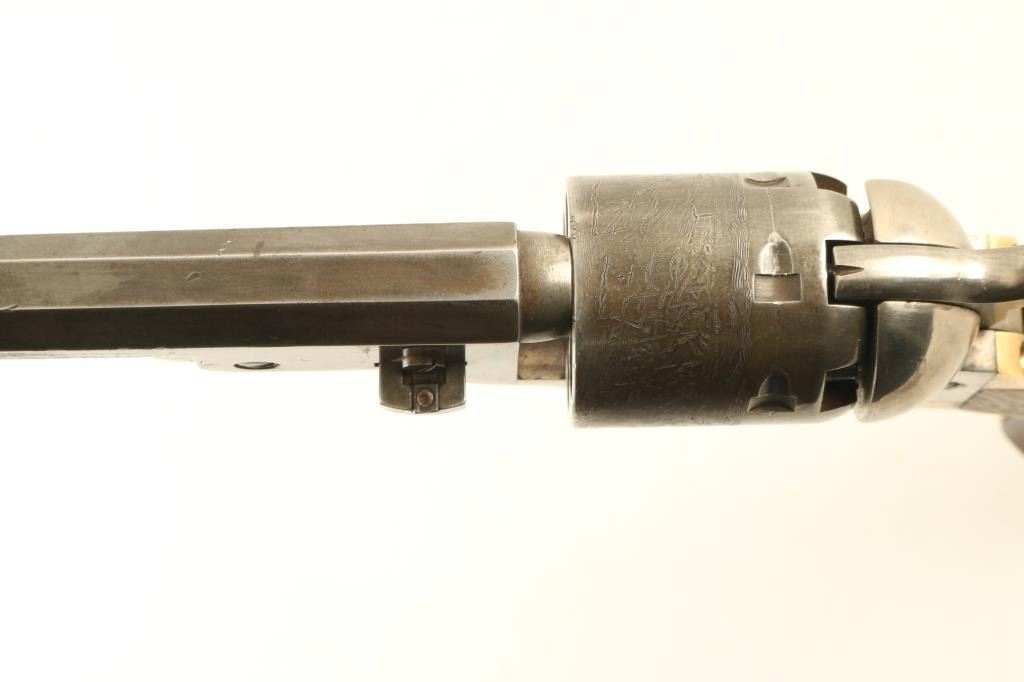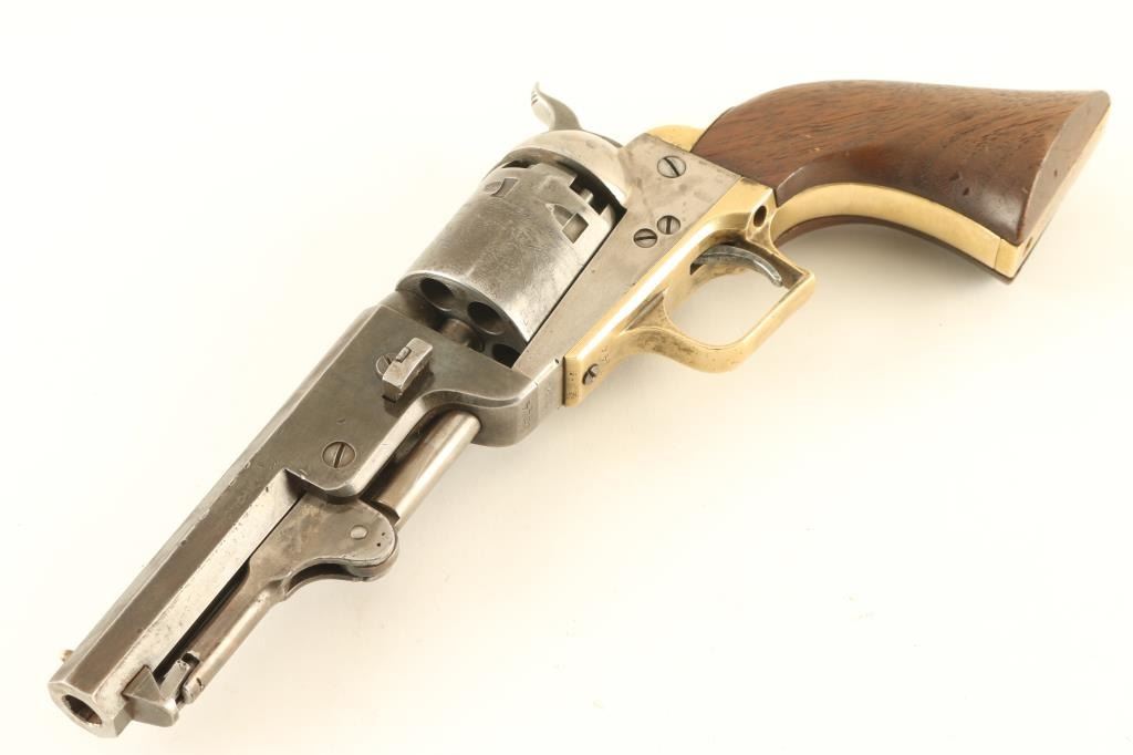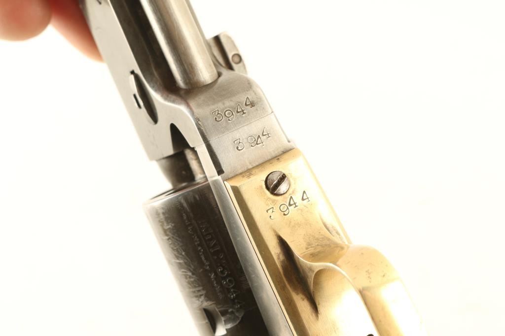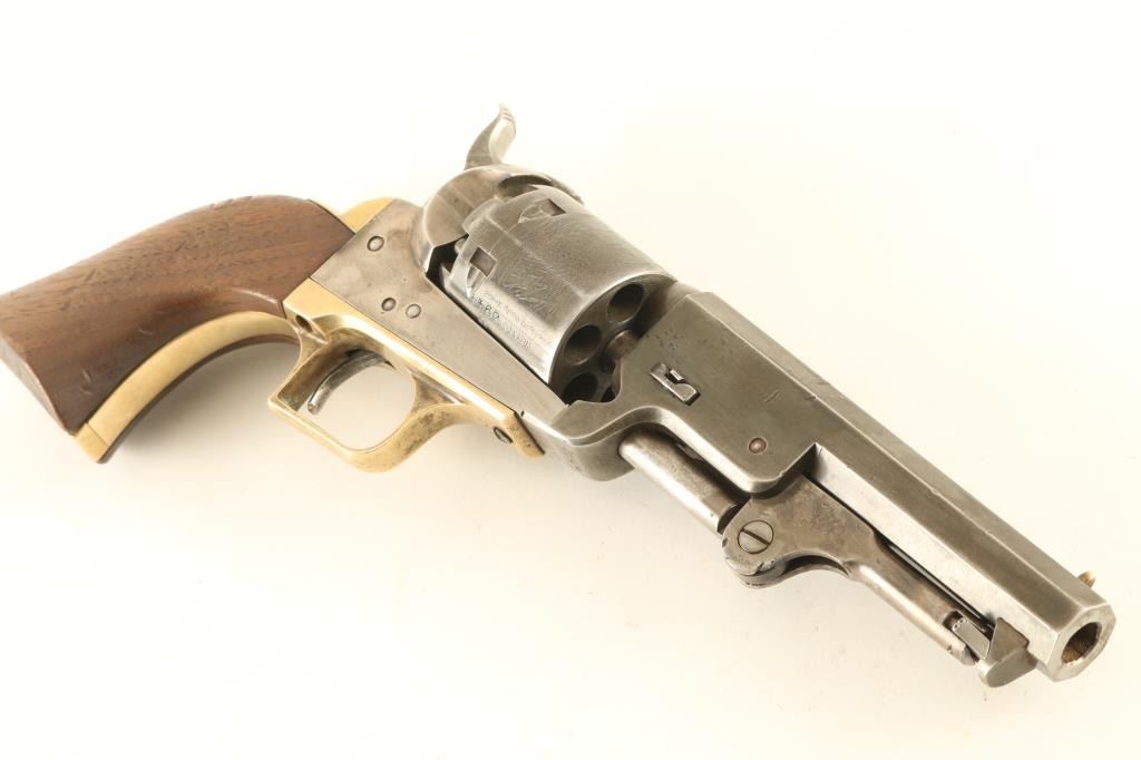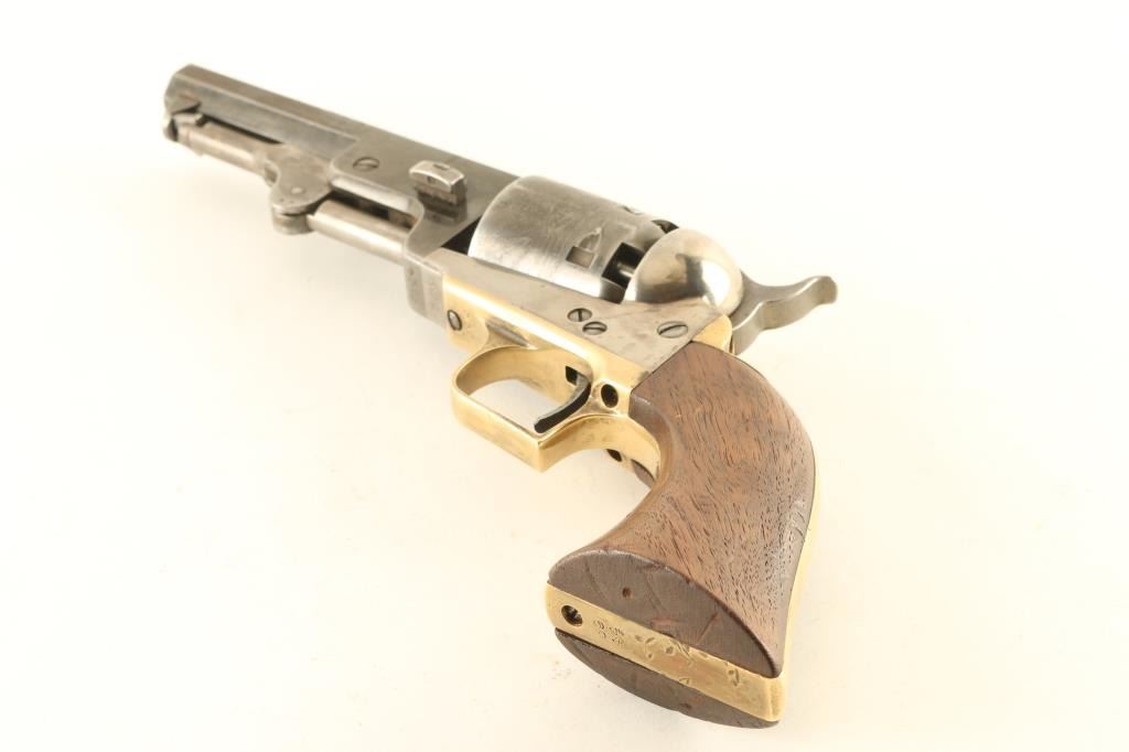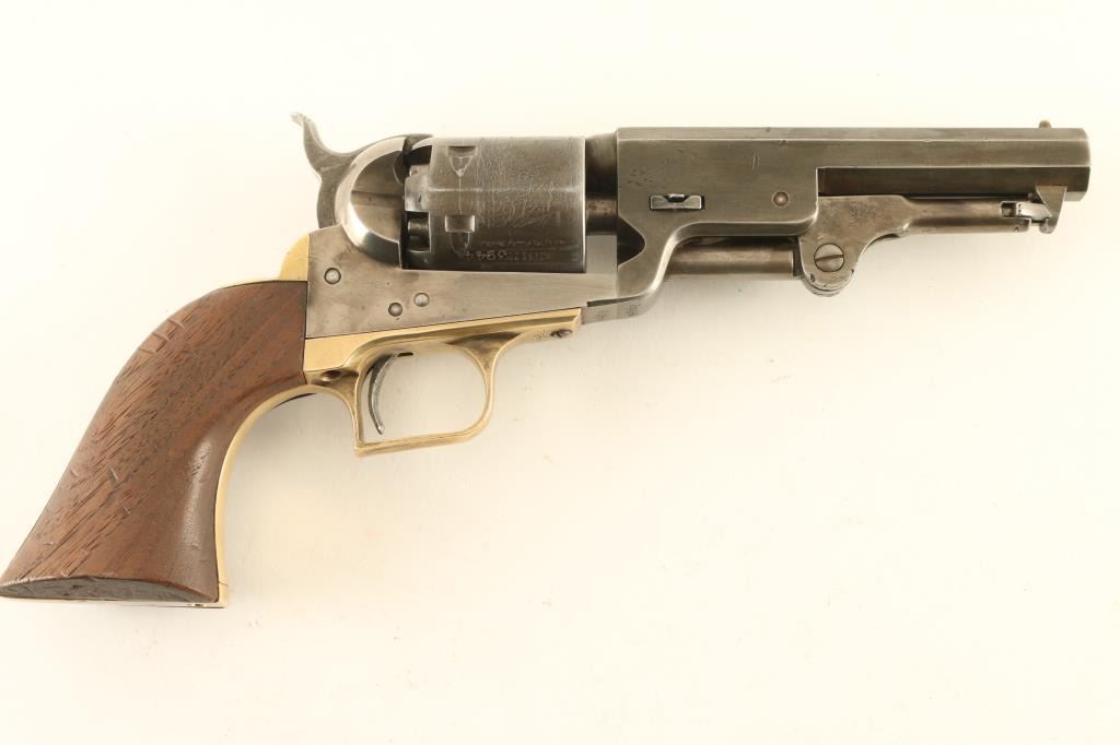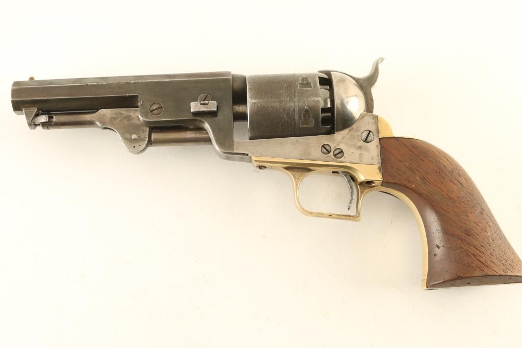 Defarbed Italian made replica of a Colt 1851 Navy single action percussion revolver. Features a 4 7/8" octagon barrel, brass cone front sight, 'v' notch rear sight cut into the hammer lip, smooth thin trigger, knurled hammer spur, non-fluted six shot cylinder with roll stamped naval engagement scene, loading lever, brass grip frame with square back triggerguard and one-piece walnut grip. Matching serial numbers are found on the barrel lug, frame, triggerguard, backstrap, barrel wedge and cylinder. Revolver has an aged appearance with a grey patina on the barrel & cylinder with some streaks of thinned bluing. The frame has been cleaned leaving a semi-bright silver tone. Action is sound, the bore is very good, and the wood grip is very good with dings & three notches cut into the right side. Condition is NRA Good. ***Antique Firearm***