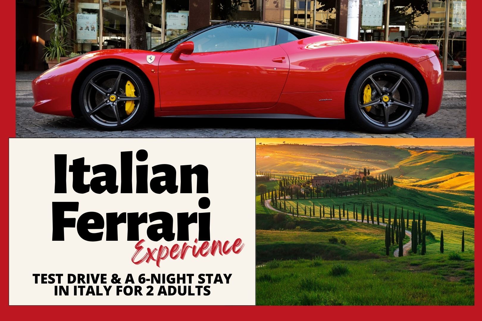 The travel package provides 2 adults with a 3-night stay in a private apartment in Cortona, Italy, and a 3-night stay at a 4-star hotel in Modena City Center. Included is a wine-tasting, a cooking show with dinner, a private driver from Cortona to Modena, a 65 km Ferrari test drive, a factory and Ferrari Museum visit, and a half-day visit to a balsamic cellar with lunch and wine. Accommodations and excursions are subject to change and availability without notice, at which time they will be substituted with an equivalent option. Resort fees are not included. Reservations must be booked at least 90 days in advance. Package expires 24 months after date of purchase. Airfare and airport transfers are not included. Additional nights and travel with less than 90 days advance booking may be available as an upgrade at an additional cost. A valid passport is required at the time of booking your trip for all international travel. Travel during holidays and peak periods is subject to availability and may require an additional cost. This certificate may not be resold or donated to an organization and is not refundable.