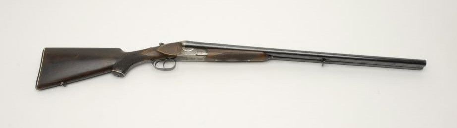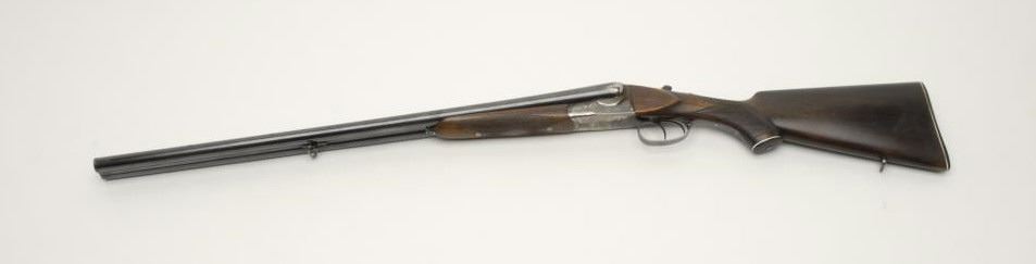 Italian Gardone Royal Special SxS shotgun, 12 gauge, serial #75772. The shotgun is in good overall condition with 27 ½” Boehler marked barrels with full-length matted rib, full chokes and brass bead front sight. The barrels retainthe majority of their thinning blued finish with light scratches and moderate surface rust evident, particularly on the left barrel. The receiver shows old, toning case color gone to silver with some brighter case on the underside and some oldvarnish staining. The receiver is nicely border engraved and features double triggers. The checkered wood stocks are in good condition showing significant use, some flattening of checkering and a coat of varnish added at somepoint during the period of use. The stock features a splinter fore end with Anson release, a hard plastic butt plate, 14 ½” LOP and significant cast off. The bores are good, the action crisp and markings sharp on this shotgunmarked “Made in Italy.” Est.: $250-$500. (Modern).