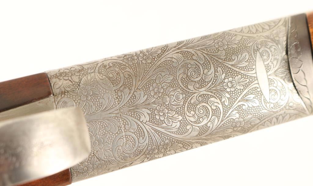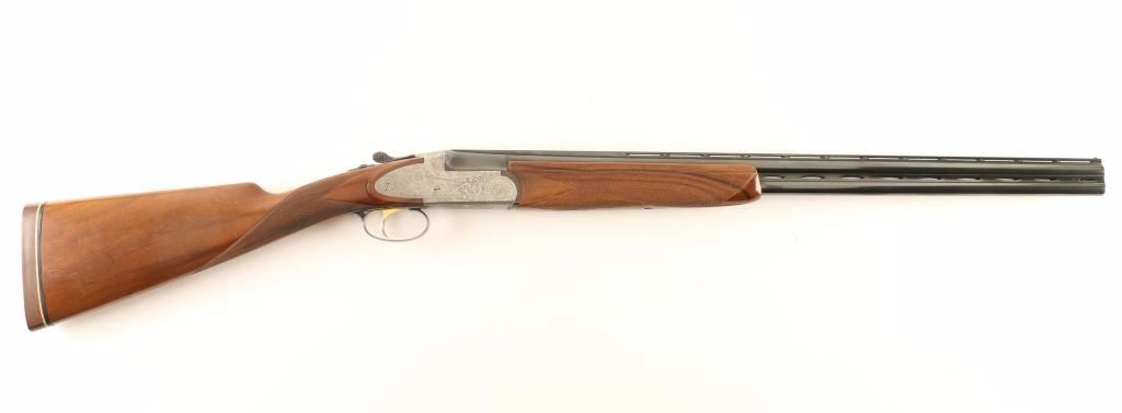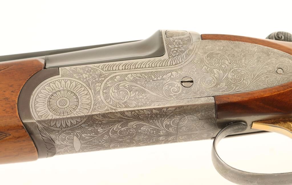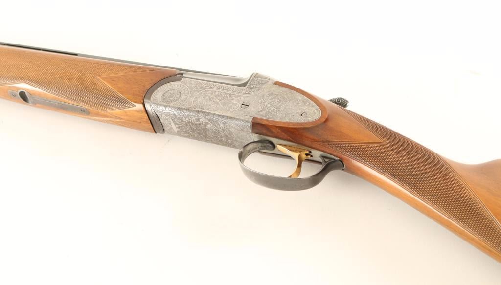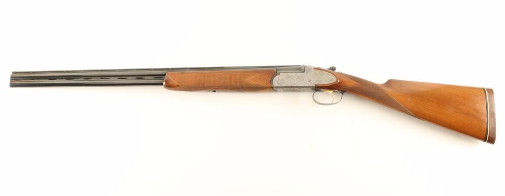 Engraved Italian made over/under double barrel boxlock shotgun chambered for 2 3/4" 28 gauge shells, circa 1981. Features blued 28" vent ribbed barrels with imp mod/mod chokes, silver bead sights, automatic ejectors, silver finished receiver with fine floral scroll engraving, smooth single gold trigger, sliding tang safety/barrel selector, finely checkered walnut forend and straight grip shoulder stock with Old English recoil pad. Shotgun exhibits approximately 95% of it's blued finish on the barrels showing light muzzle wear, few handling marks and rub wear from the forend. The receiver was likely case hardened at one time as the inside of the receiver shows case colors. Action is smooth, bores are excellent and wood stocks are fine with semi-worn points. Condition is very good+++. ***Modern Firearm***