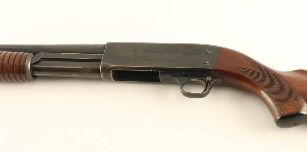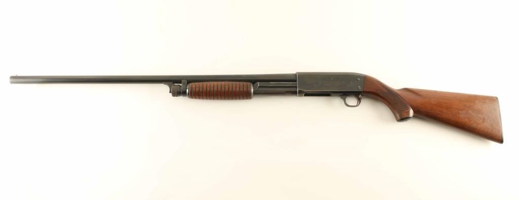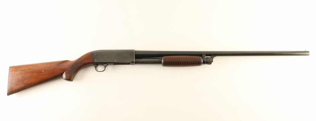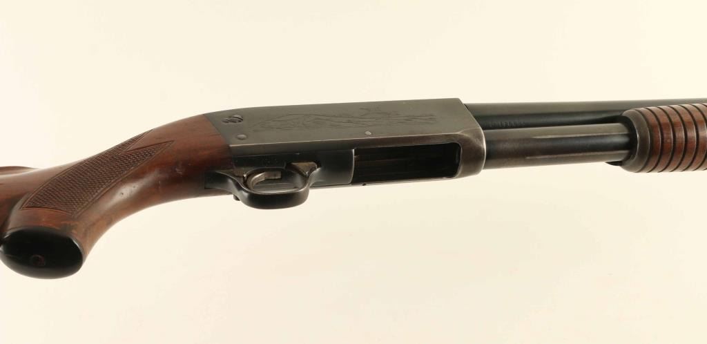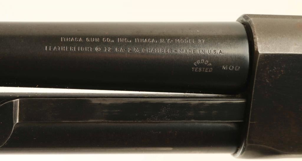 Vintage bottom ejecting slide action repeating shotgun chambered for 2 3/4" 12 gauge shells, manufactured in Ithaca, NY circa 1954. Features all steel construction with a blued finish, take-down 28" modified choke barrel, brass bead font sight, 4 round tube magazine, smooth trigger, cross-bolt safety, roll stamped game bird scenes on the receiver, single action bar, grooved walnut slide handle and checkered pistol grip shoulder stock with black synthetic grip cap, serrated buttplate & 14” LOP. The barrel is marked “568941-2”. Shotgun retains approximately 80% of its original blued finish showing carry wear on the bottom of the receiver, scattered light surface rust and slide wear on the barrel, magazine tube & action bar. Action is smooth, the bore appears excellent but dirty and the wood stocks are good with some finish loss & a couple small hairline cracks in the wrist. Condition is NRA Good. ***C&R Firearm***