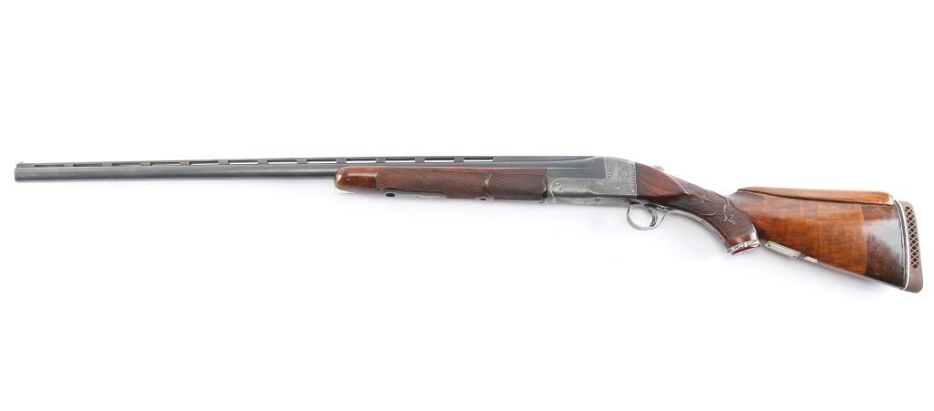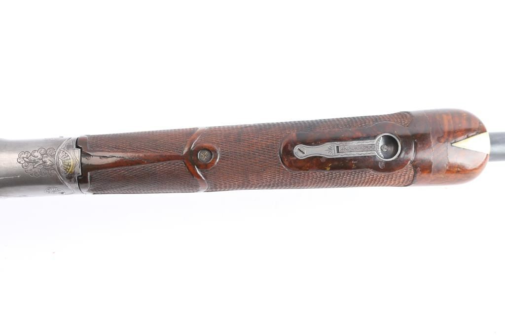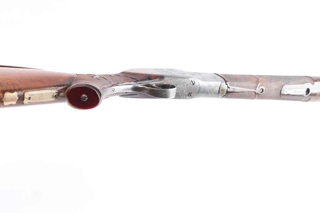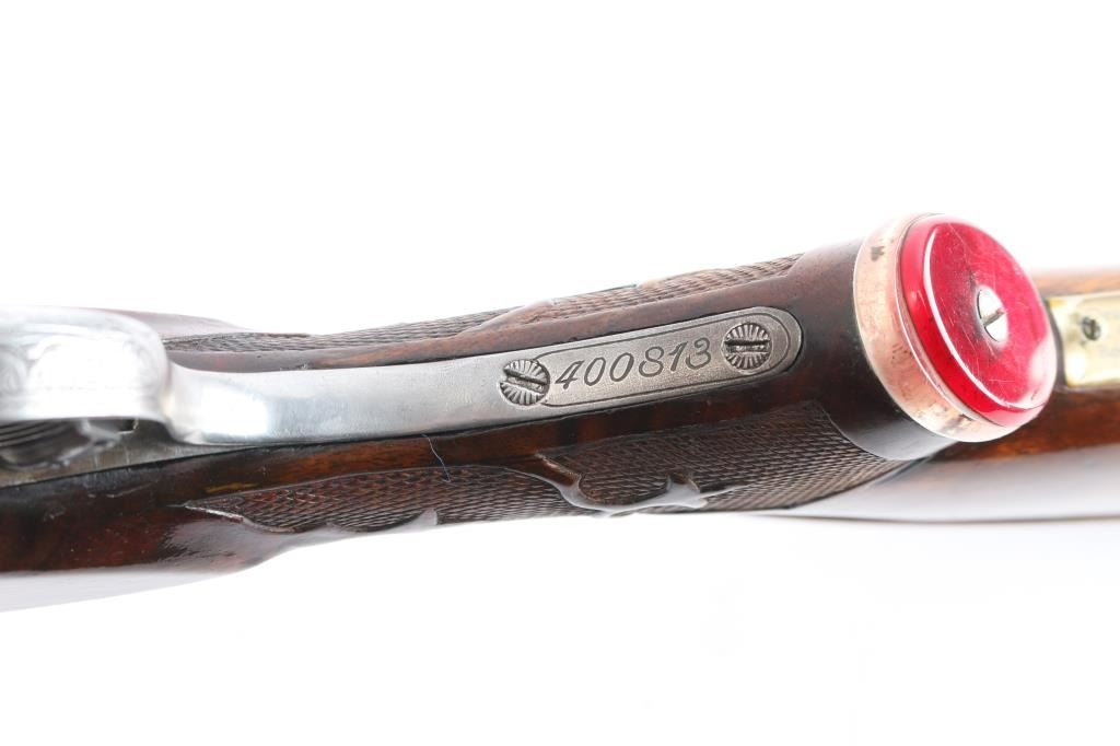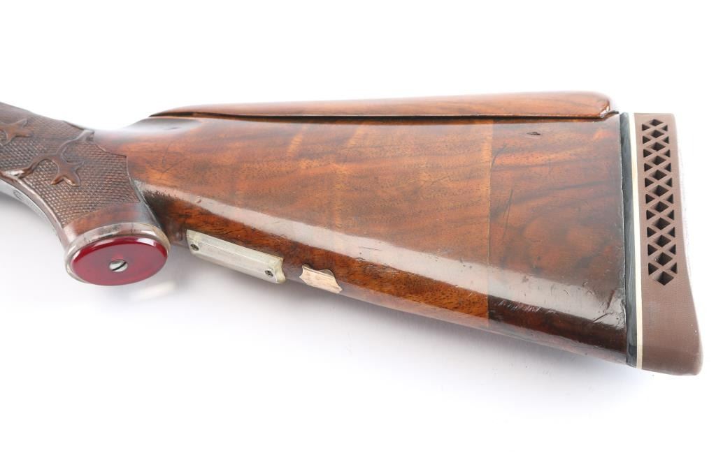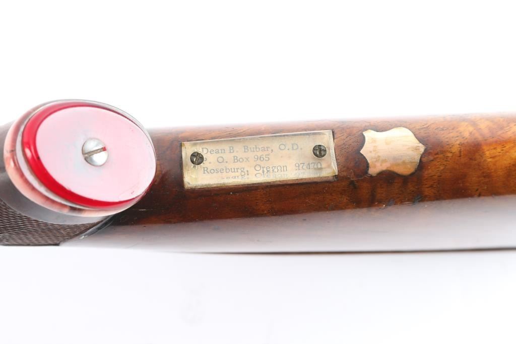 Ithaca Model Knick Grade 4E Engraved 12 ga. Single Barrel Trap Shotgun. Manufactured 1926. 30 1/4" vent rib barrel, white Bradley front bead and small white mid bead. Features hand engraving throughout the receiver, upper tang, lower tang, trigger guard, and metal accent pieces. The flanks of the mono-forged barrel block has star burst patterns and line border engraving. All matching serial numbers. The left side of the frame has floriated elements and a man in a field, shouldering a firearm. The underside of the frame, underside of the trigger guard and right side of the frame have more floriated engraving and the right features an eagle holding arrows, both flanks read “ITHACA GUN CO". The belly of the butt stock has a copper toned shield metal insert and an old plastic covered tag with name and Oregon address. The stocks are two-piece carved and checkered walnut with beavertail forend, white insert in fore tip, capped clear & red Lucite pistol grip, straight comb. In production from 1922 until the last Knick was made in 1982, 5740 were produced. By 1935 the Knick in the hands of able shooters won the Grand American Handicap six times. Serrated wide trigger shoe installed. The bore is very good/bright, the blue has faded, turning gray in some areas, handling loss on the bottom metal, the stock is overall very good/sound with sharp checkering, the shoulder stock has been modified by raising the comb with a wood insert, looks good, the lop has been lengthened by adding 2" of wood to the stock. Pachmayr vented rubber recoil pad. The upper tang screw is missing. Barrel locks-up tight. LOP-14 1/4".
