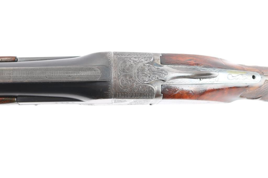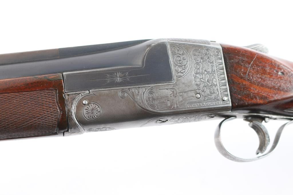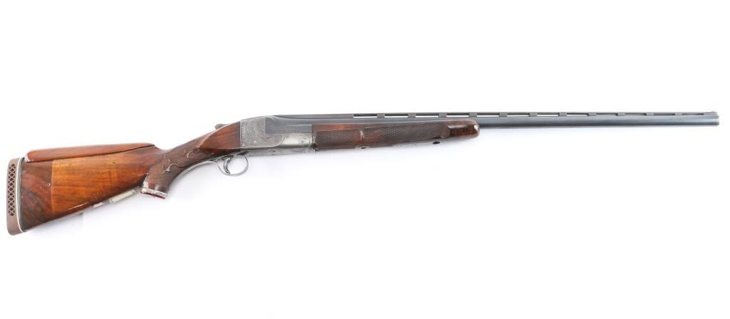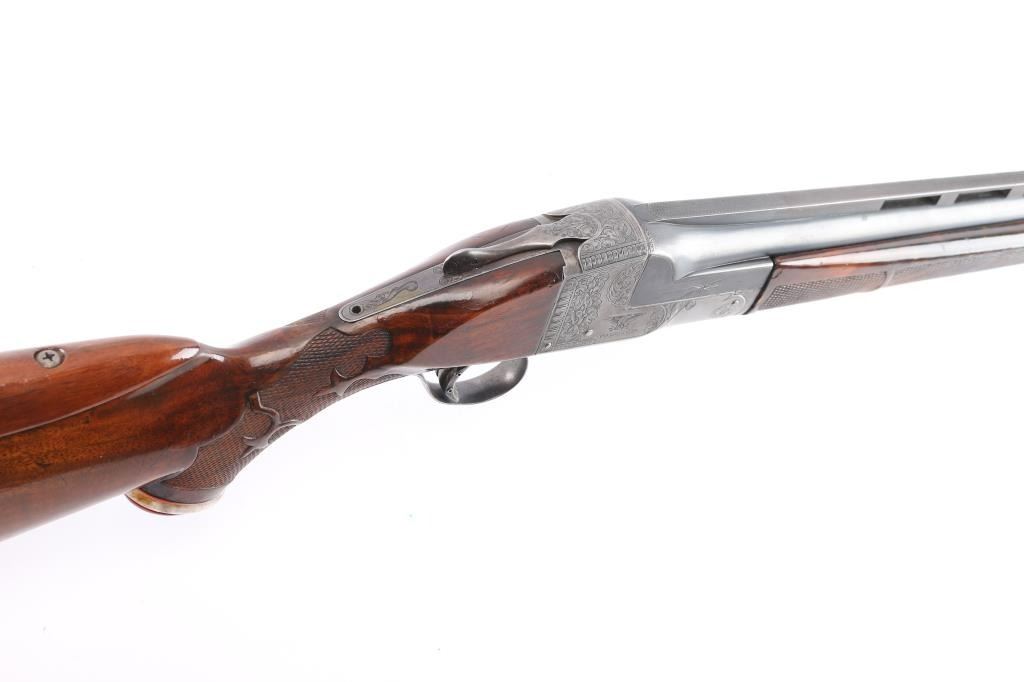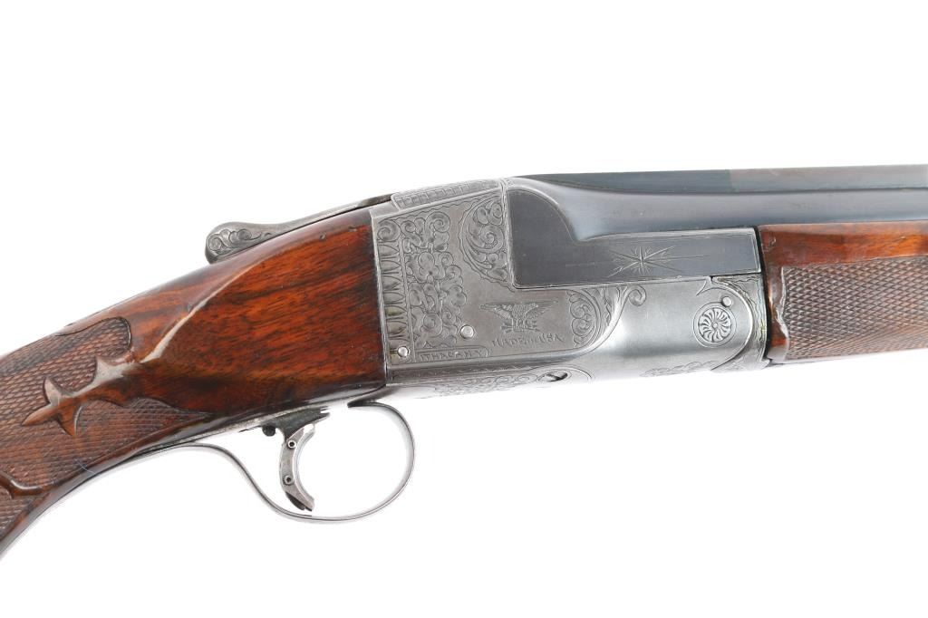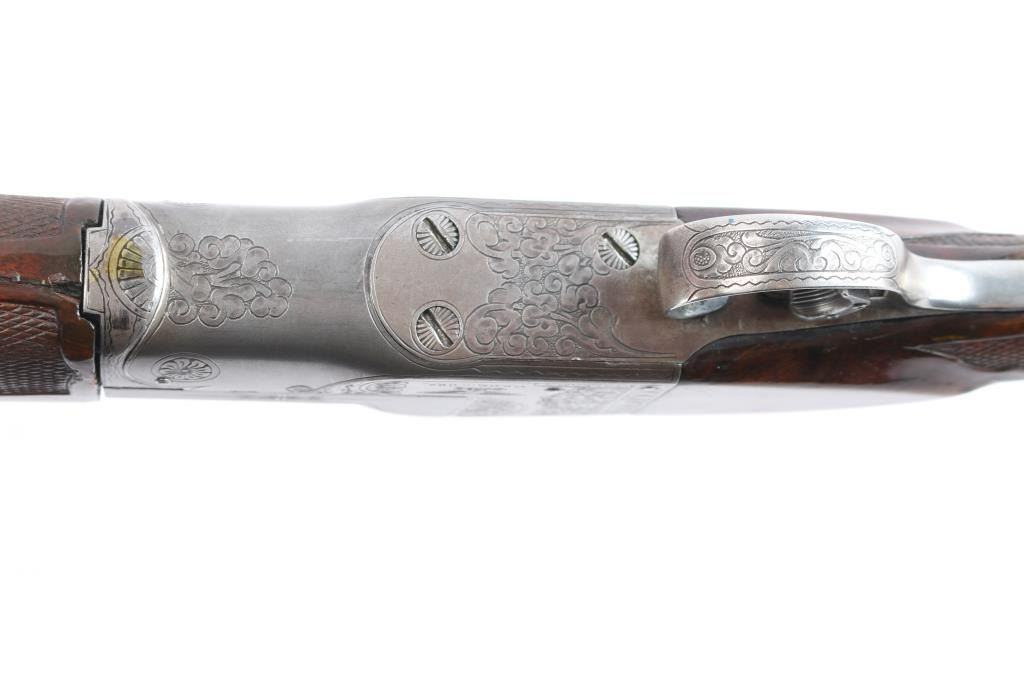 Ithaca Model Knick Grade 4E Engraved 12 ga. Single Barrel Trap Shotgun. Manufactured 1926. 30 1/4" vent rib barrel, white Bradley front bead and small white mid bead. Features hand engraving throughout the receiver, upper tang, lower tang, trigger guard, and metal accent pieces. The flanks of the mono-forged barrel block has star burst patterns and line border engraving. All matching serial numbers. The left side of the frame has floriated elements and a man in a field, shouldering a firearm. The underside of the frame, underside of the trigger guard and right side of the frame have more floriated engraving and the right features an eagle holding arrows, both flanks read “ITHACA GUN CO". The belly of the butt stock has a copper toned shield metal insert and an old plastic covered tag with name and Oregon address. The stocks are two-piece carved and checkered walnut with beavertail forend, white insert in fore tip, capped clear & red Lucite pistol grip, straight comb. In production from 1922 until the last Knick was made in 1982, 5740 were produced. By 1935 the Knick in the hands of able shooters won the Grand American Handicap six times. Serrated wide trigger shoe installed. The bore is very good/bright, the blue has faded, turning gray in some areas, handling loss on the bottom metal, the stock is overall very good/sound with sharp checkering, the shoulder stock has been modified by raising the comb with a wood insert, looks good, the lop has been lengthened by adding 2" of wood to the stock. Pachmayr vented rubber recoil pad. The upper tang screw is missing. Barrel locks-up tight. LOP-14 1/4".