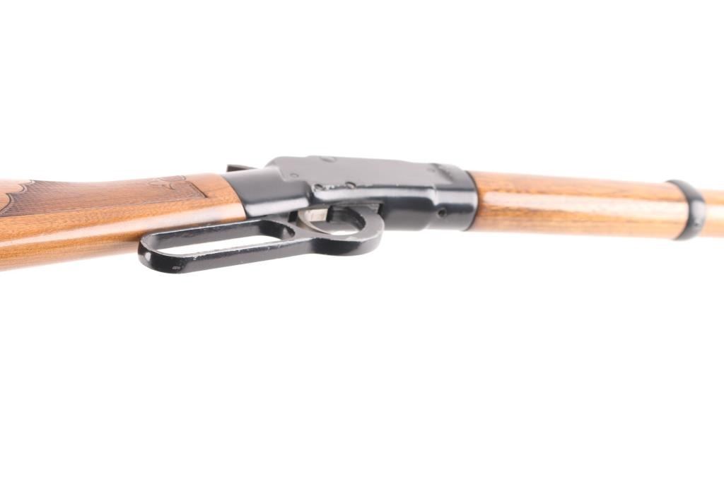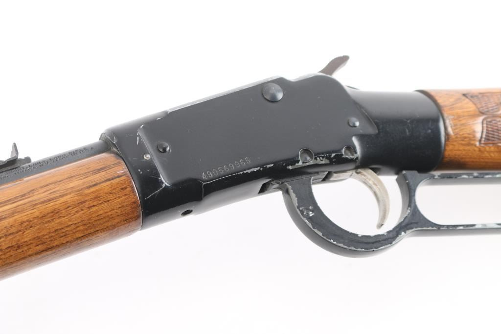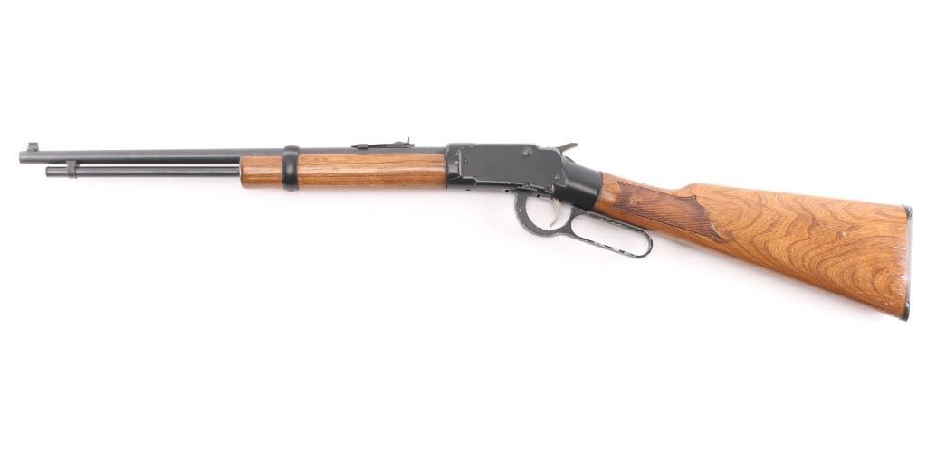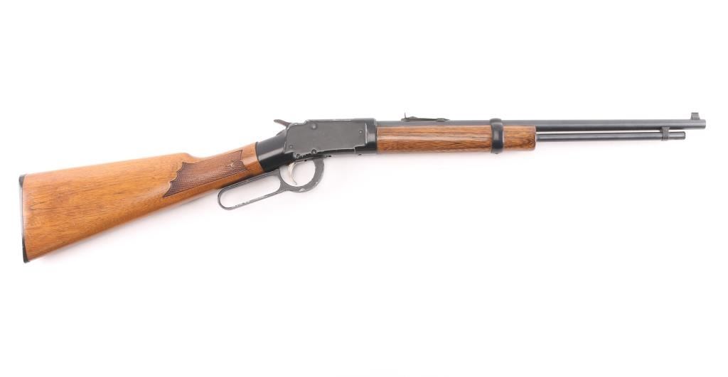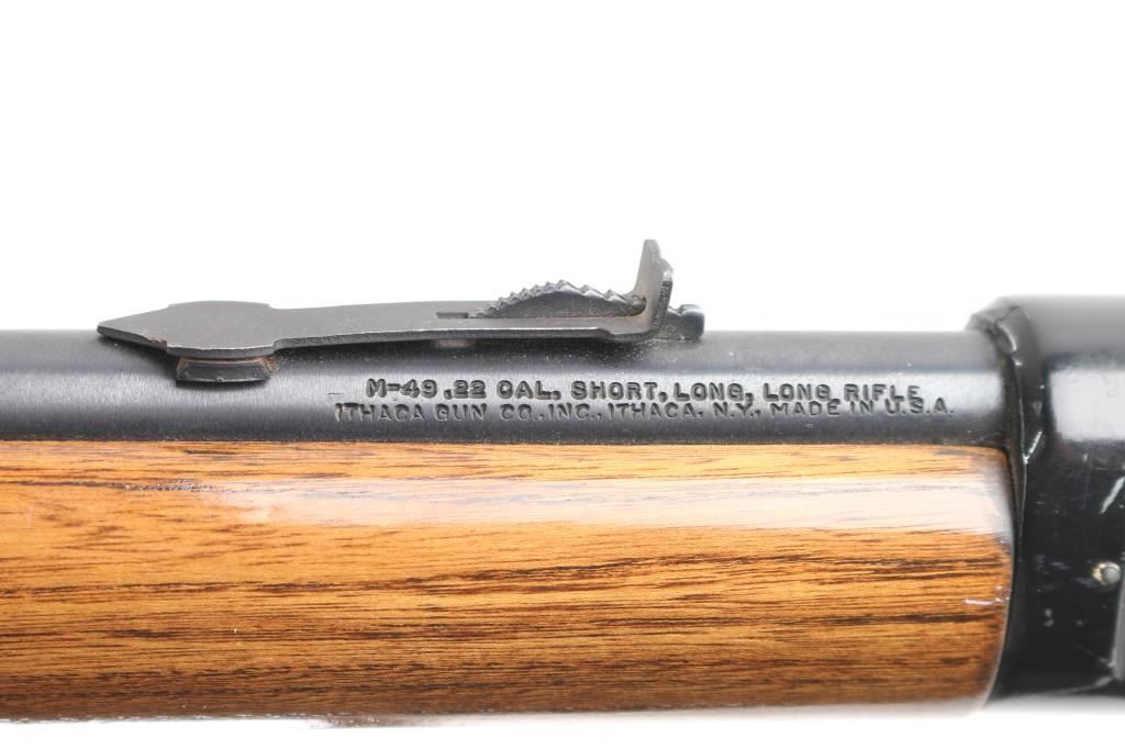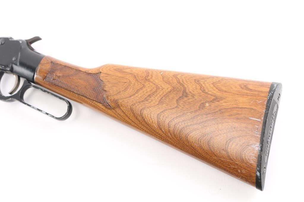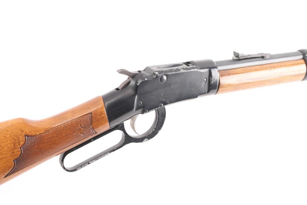 Single Shot tilting block rifle manufactured between 1960's to 1970's. Has faux magazine tube to give appearance of a western style lever action rifle. Features a black paint finish, wood stock and forend with checkering on the wrist, Ithaca butt plate, 18" barrel with buckhorn sights and smooth trigger. Bore is excellent/bright. Black painted finish has many chips showing bare metal, needs touch up. Wood stocks are overall excellent with some minor flecks of white paint on the left buttstock.