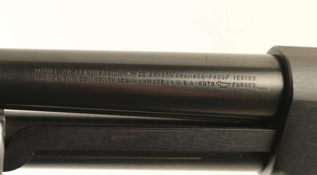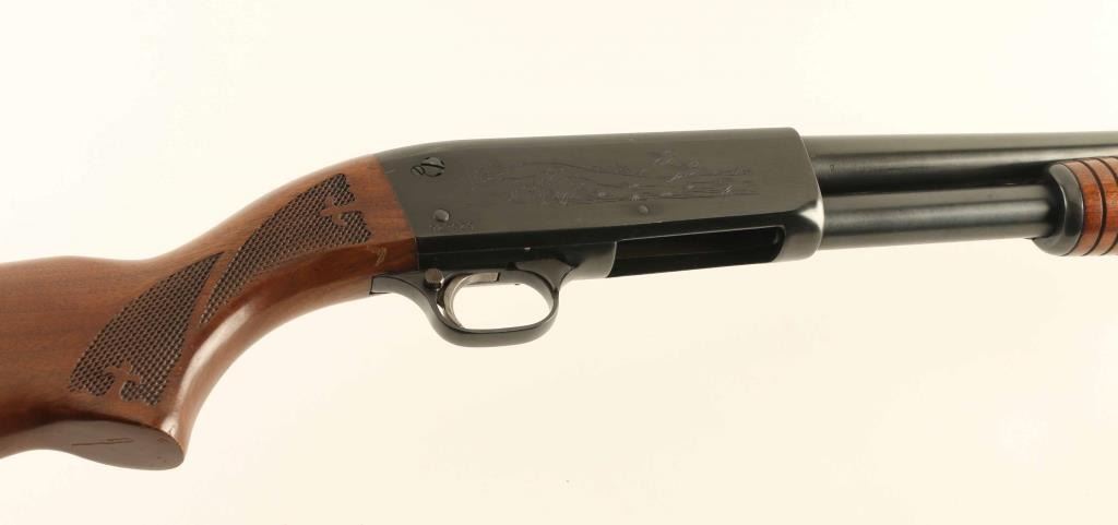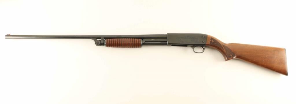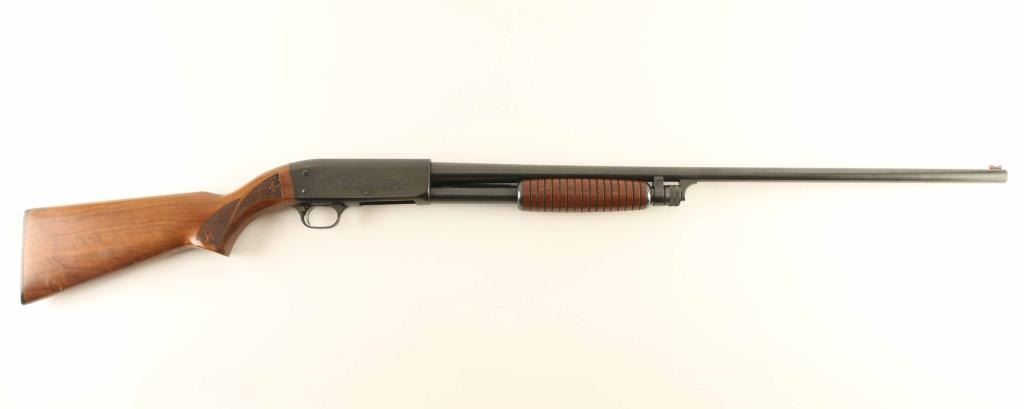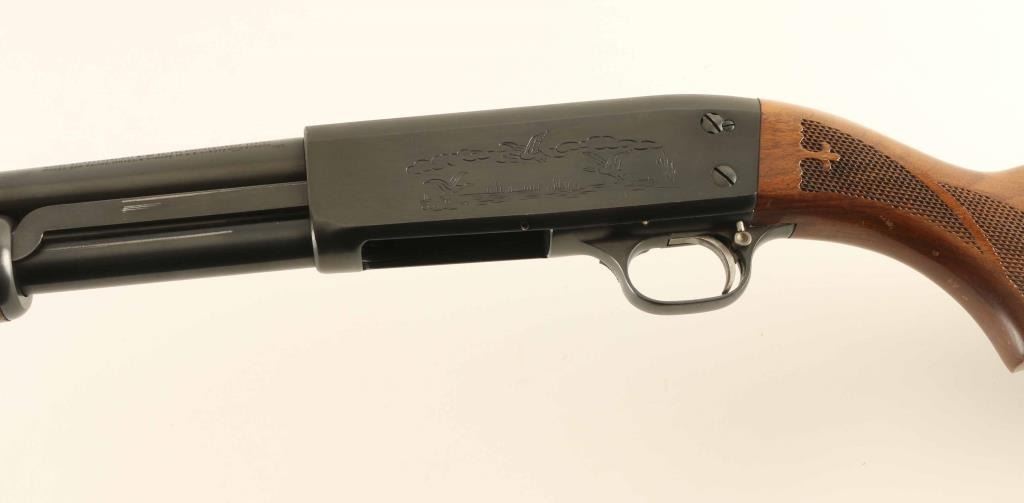 Pump action shotgun features blued finish, grooved wood pump handle, wood butt with checkered wrist & curved grip, plastic buttplate, 28" plain barrel with fixed MOD choke, orange fiber optic type Bradley front bead, manual safety, bottom ejecting. Bore is very good condition. Retains 90% blued finish with scratches on receiver sides, rub marks on action bar and mag tube, scuffs to barrel. Pump handle is very good condition with several small gouges. Stock is good condition overall, with a row of small dents or gouges along toe line of butt. Condition is NRA Very Good *** Modern Firearm ***
