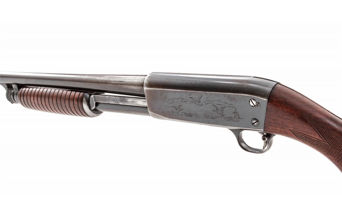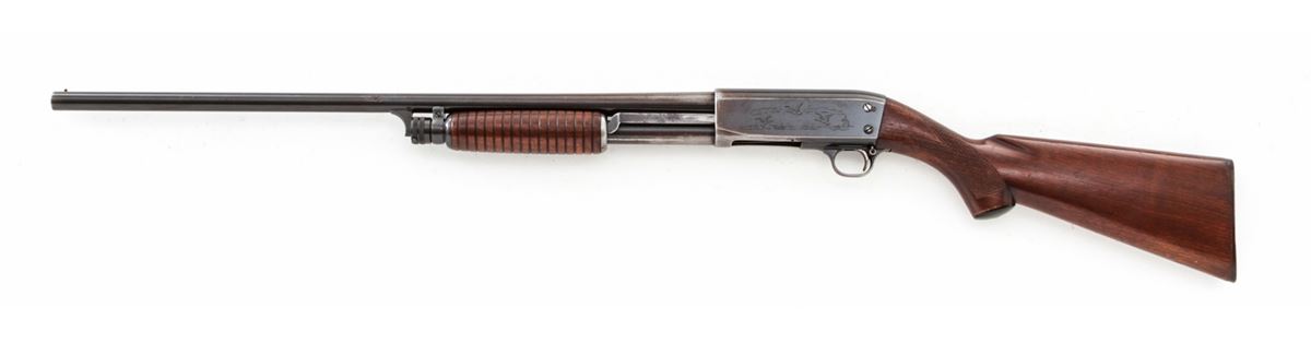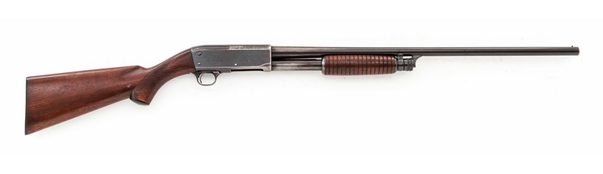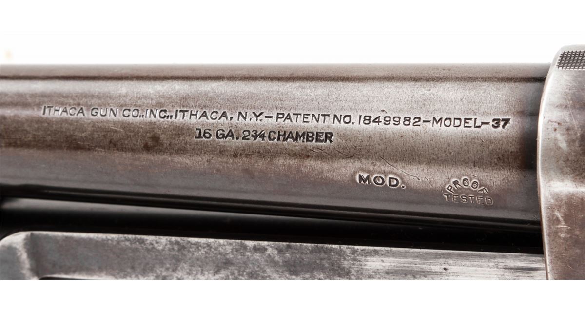 Ithaca Model 37 Pump Action Shotgun, #49744, 16 ga., 26'' round barrel choked Mod. for 2-3/4'' shells, blue finish, walnut stock. Condition is about very good retaining approx. 80% blue. Stock with light scuffs and scratches. Good action and bore. Est.: $125-$250. (C&R)