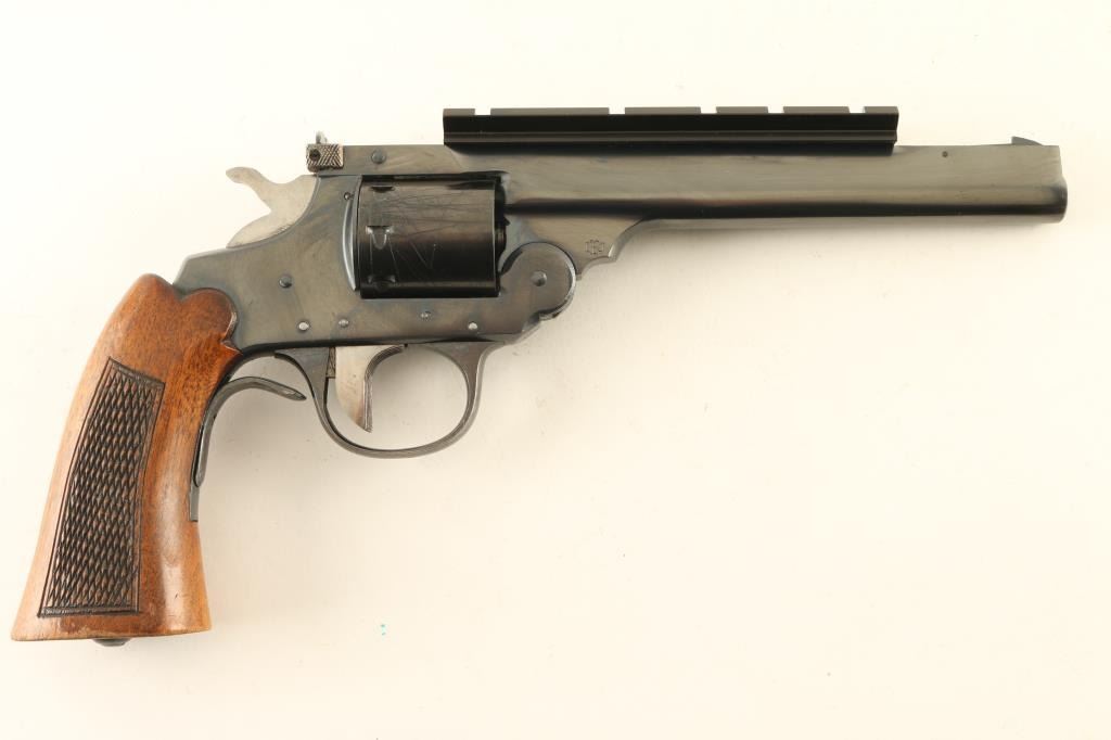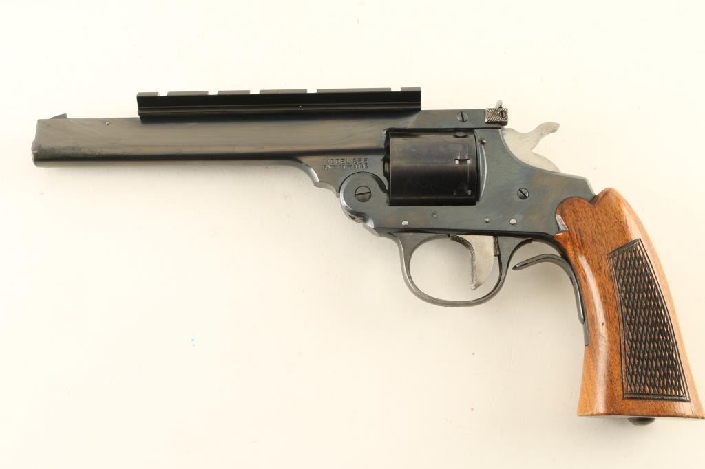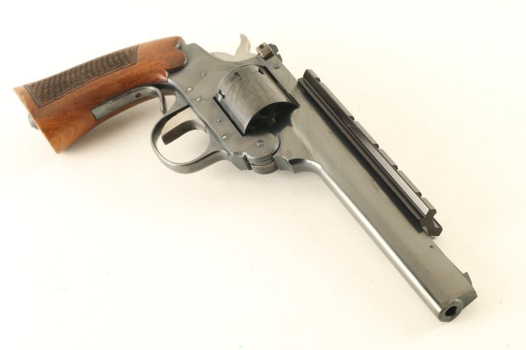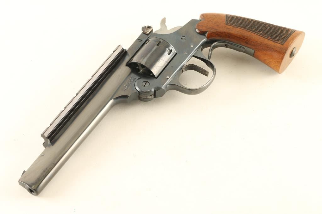 Break top Single action revolver features 6" vent rib barrel, blued finish, grooved wide trigger, 8 shot cylinder, adjustable rear sight. screw mounted Weaver rail on top of barrel (rail blocks view of sights). Bore is very good condition. Bluing is 95% with signs of handling & use. Checkered wood grips are excellent.. Action locks up tight. Condition is NRA Excellent *** Modern Firearm ***