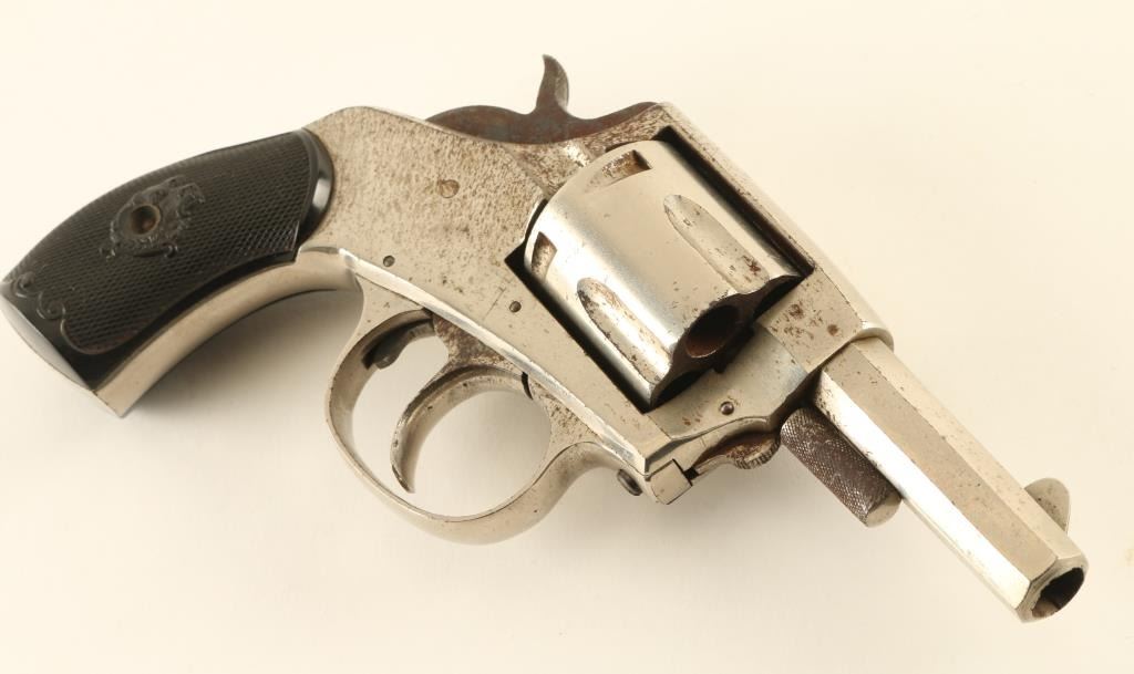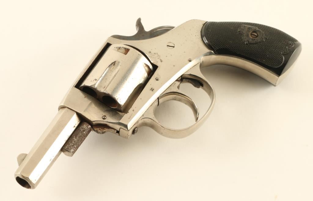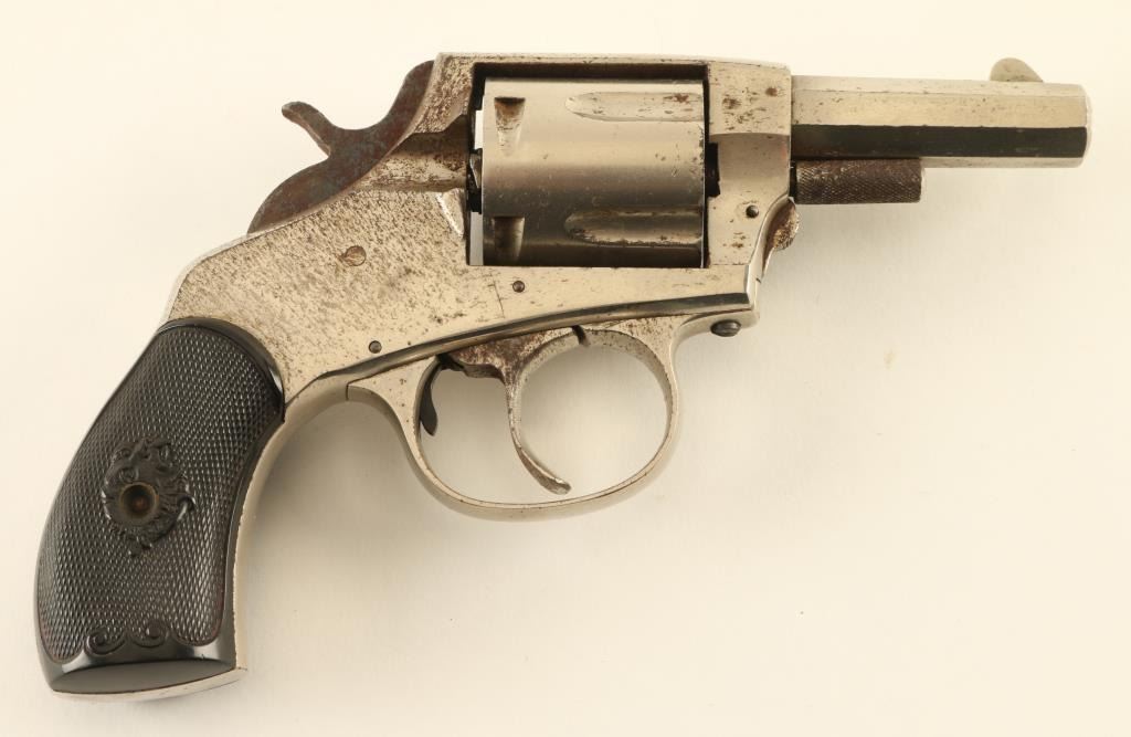 'Second Model' 1885-1899 rimfire revolver features nickel plated finish, checkered black gutta percha grips, double/single action, 2.5" octagon barrel, fixed sights, side loading port. Bore is poor to fair, even light pits with visible rifling. Charge holes and inside of frame window have light film of thin rust. Retains 50% nickel finish, peeling or puckering in many places, mostly absent from cylinder pin knob. Hammer is blued, fair condition on left, coating of light rust on right. Grips are good condition. Action cocks and releases in single action mode, with fair cylinder lock-up, trigger does not return forward on its own. Double action operation rotates cylinder but does not operate hammer. Condition is NRA Poor *** Antique Firearm ***