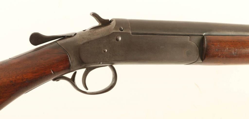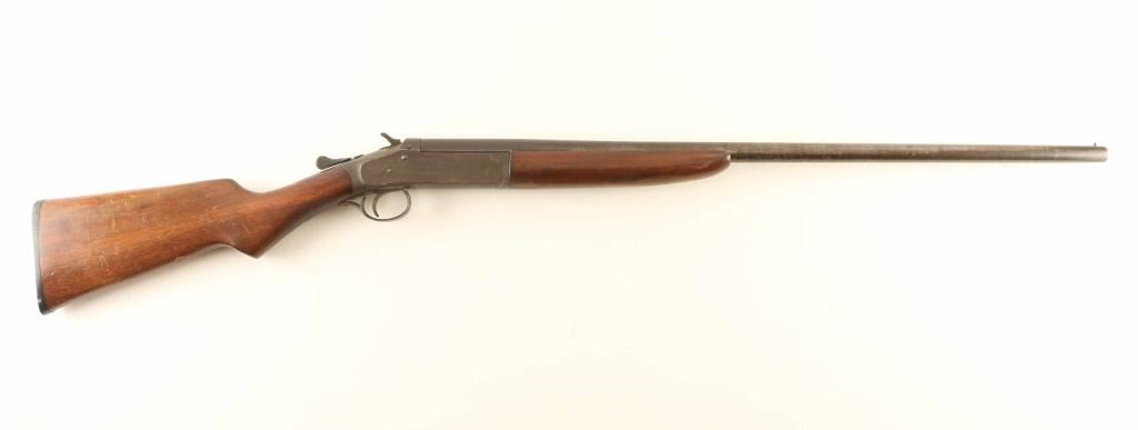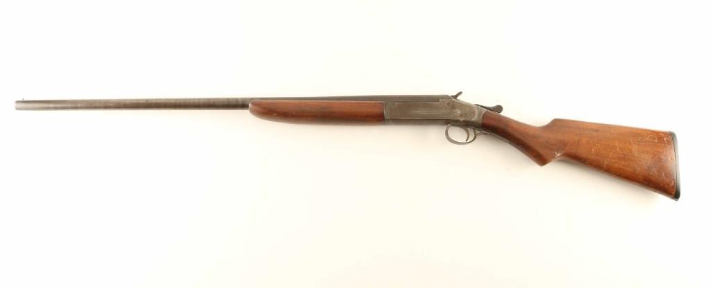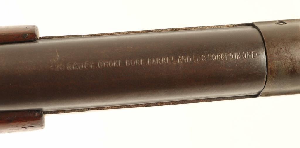 Vintage single barrel break-action shotgun chambered for 2 ¾” 20 gauge shells, manufactured circa 1909-1956. Features a blued 28" barrel, brass bead front sight, automatic ejector, smooth trigger, exposed hammer with knurled spur, knurled top lever, case hardened receiver, smooth walnut forend and prince-of-whales grip shoulder stock with factory buttplate. Matching serial numbers are found on the lower tang, forend, forend metal and barrel lug. Shotgun retains less than 10% of its original finish with the majority of the metal surfaces displaying a mottled light/dark brown patina. Action is in good working order, the bore is bright with a small ding 4.5” from the muzzle and the wood stocks are fair with blemishes & a 1.5” hairline crack on the top of the wrist. Condition is NRA Fair. ***C&R Firearm***