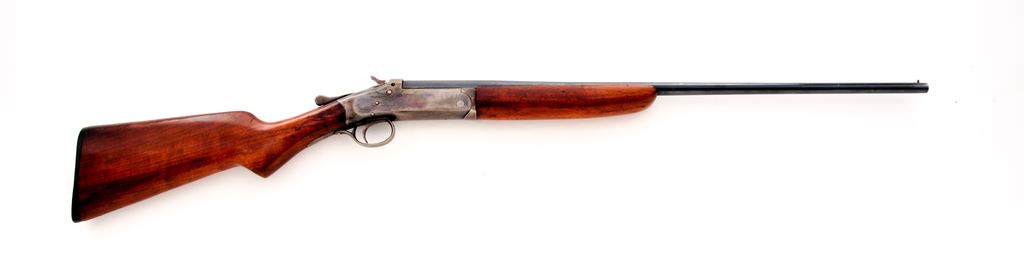 Iver Johnson ''Champion'' Single Shot Shotgun, #CIRT, .410 bore, 26'' barrel with blue finish, color case hardened receiver, pistol-grip walnut stock and forend, factory black composition ''owls head'' buttplate, exposed hammer, with brass bead front sight. Condition is good. Barrel with approx. 80% blue finish; receiver 40% case colors. Wood with scattered impressions and scratches and an added coat of varnish. Good action, mirror bright bore. Est.: $100-$150. (C&R)