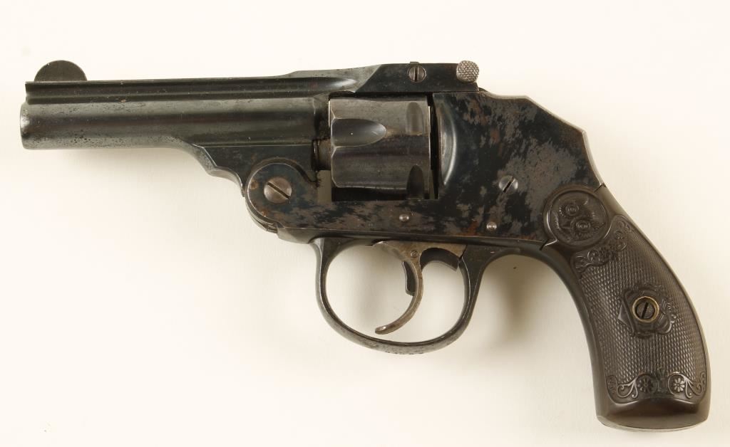 Blued double-action only hammerless 5-shot top-break revolver with a 3" barrel and checkered hard rubber grips. Second model. Metal finish has spots of surface rust on the frame and cylinder. Bore has lots of rifling and both it and the chambers are dusty and dirty with no visible rust or pitting. Checkered "Owl Head" grips are 100% complete and are brown with little wear. Action works with loose lock-up and the trigger doesn't reset automatically. Condition is fair. *Modern Firearm*