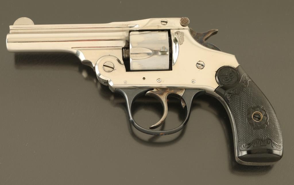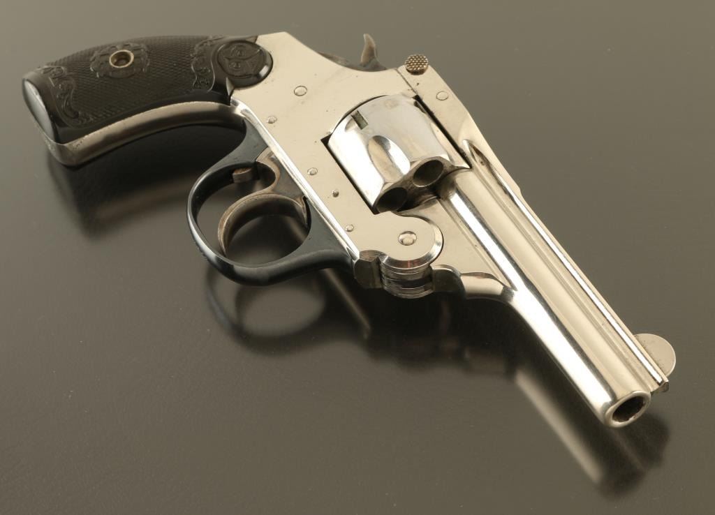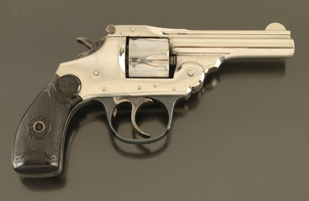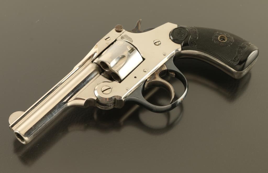 SN: A30680 Double/Single action break top revolver features nickel (or chrome) finish, black checkered Gutta Percha grips with Owl's Head logo, 3" barrel, fixed sights, 5 shot cylinder. Bore is fair condition with strong rifling, visible small areas of pitting. Charge holes are good condition. Retains 85% bright nickel finish with few areas of peeling or flaking, some visible scratches. Trigger guard is blued, very good condition. Grips are good or better condition. Action operates properly, fairly smooth, with tight cylinder lock-up. Condition is NRA Good+ *** C&R Firearm ***